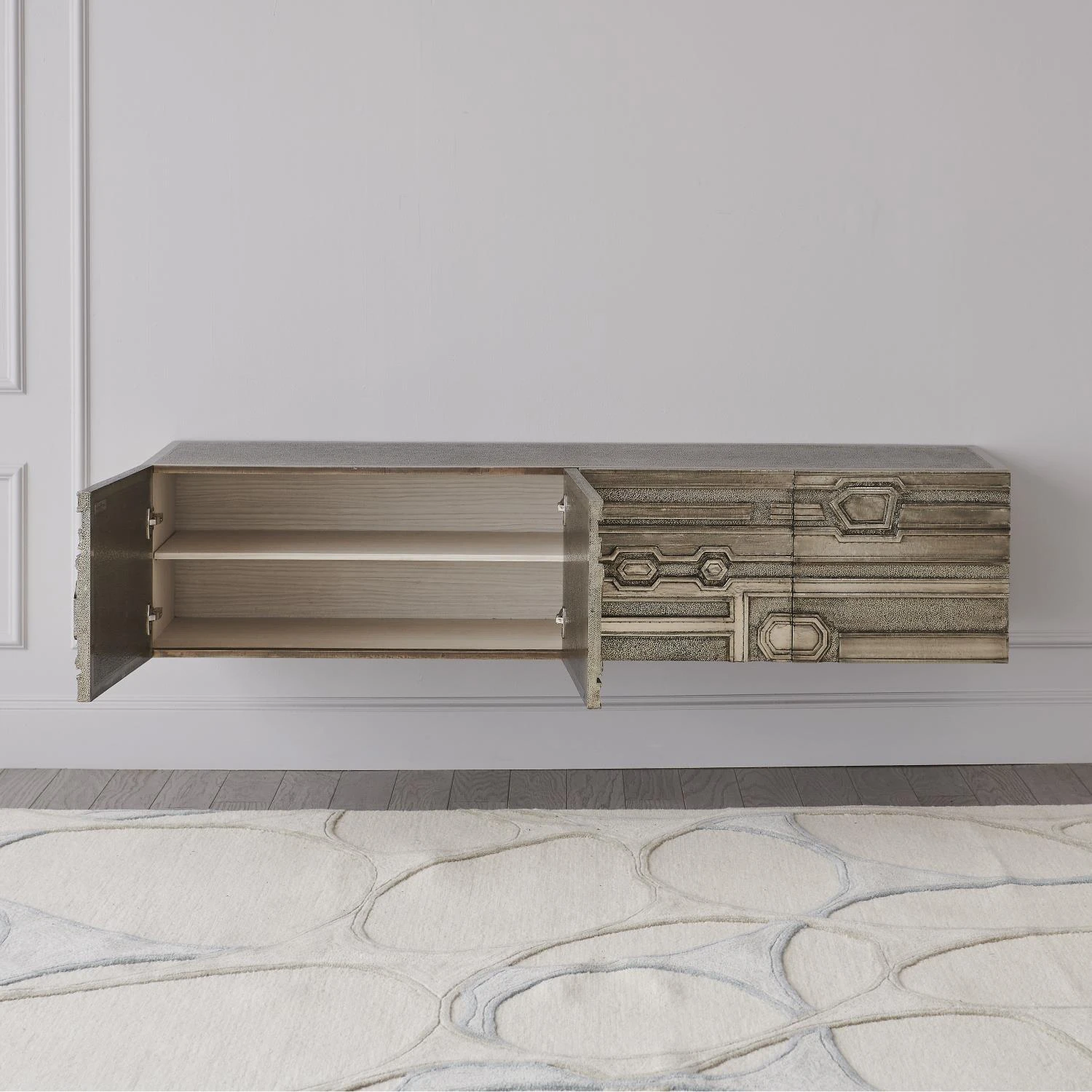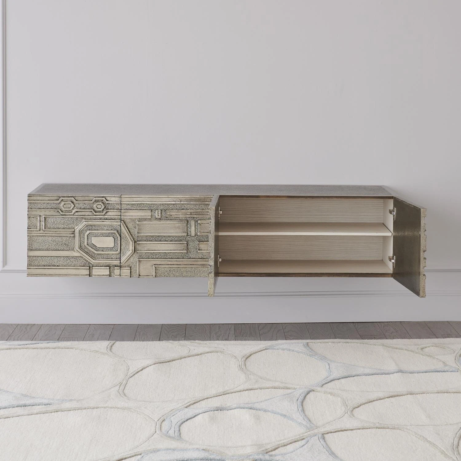 The Abstract Block Cabinet is made of wood and covered in a metal sheet with a protective coating. It features a post modern geometric relief pattern. The floating cabinet contains two compartments for ample storage space.
