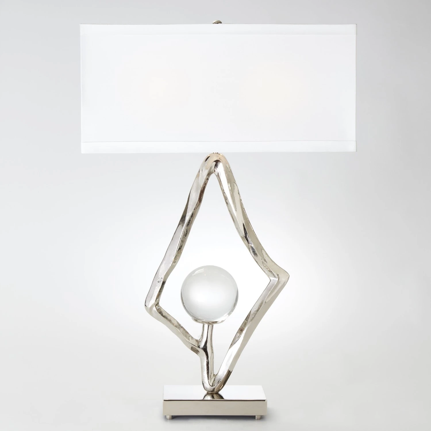 The inspiration for this stunning lamp was taken from a vintage pendant necklace. The uniquely shaped body of the lamp sits on a cool black iron base and is topped with a rectangular hardback shade covered in ivory silk. Exquisite on its own, but even better when paired with the included crystal ball. Kick up the glam a little more and pair it with the Jaguar on Crystal Ball to turn this piece into a truly striking showpiece! Jaguar on Crystal Ball sold separately. Available in two finishes: Brass and Nickel.