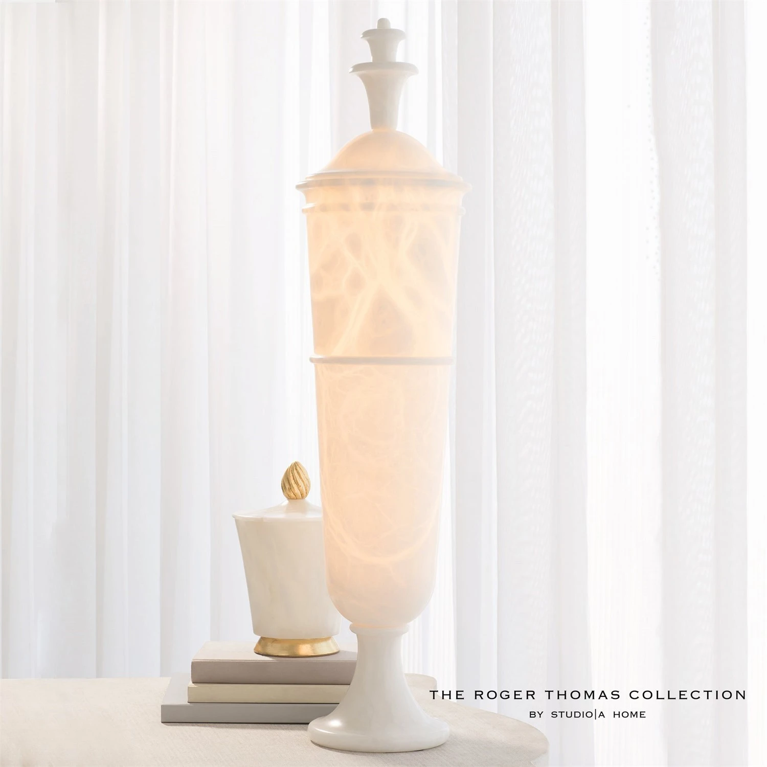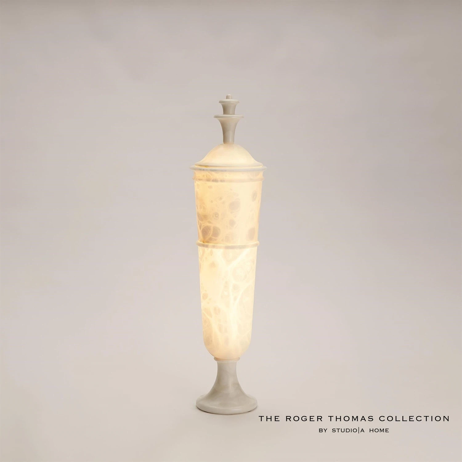 Tall, sleek luminous. A mysterious connection to the silhouettes of ancient Cycladic alabaster vases, as if one had been reimagined or added to by a Venetian in the Byzantine Era or a Roman in the Renaissance. When lit, the depth and nuances of the ancient alabaster come to life. The interior lighting mechanism is an LED strip light. Eight foot clear silver cord. Hi/Low switch on cord.
