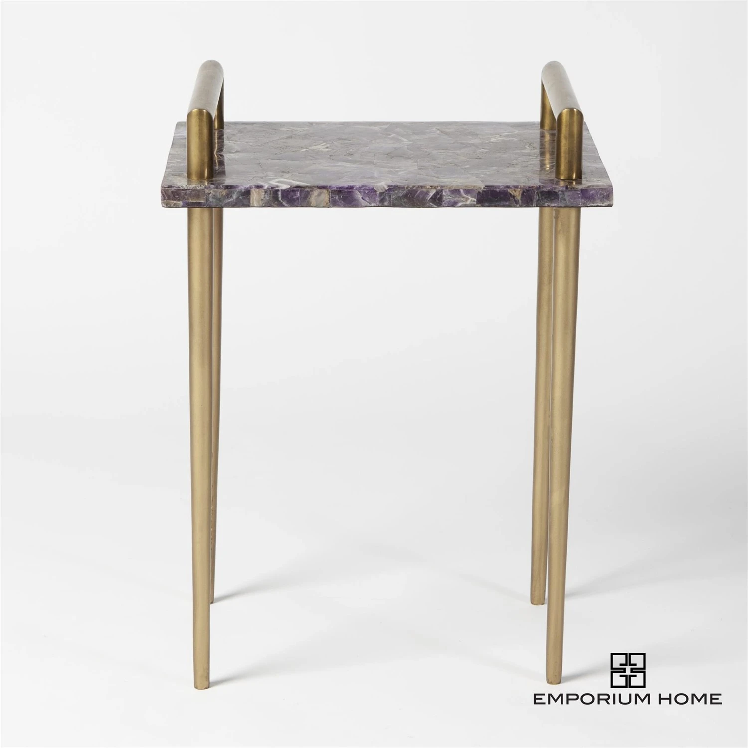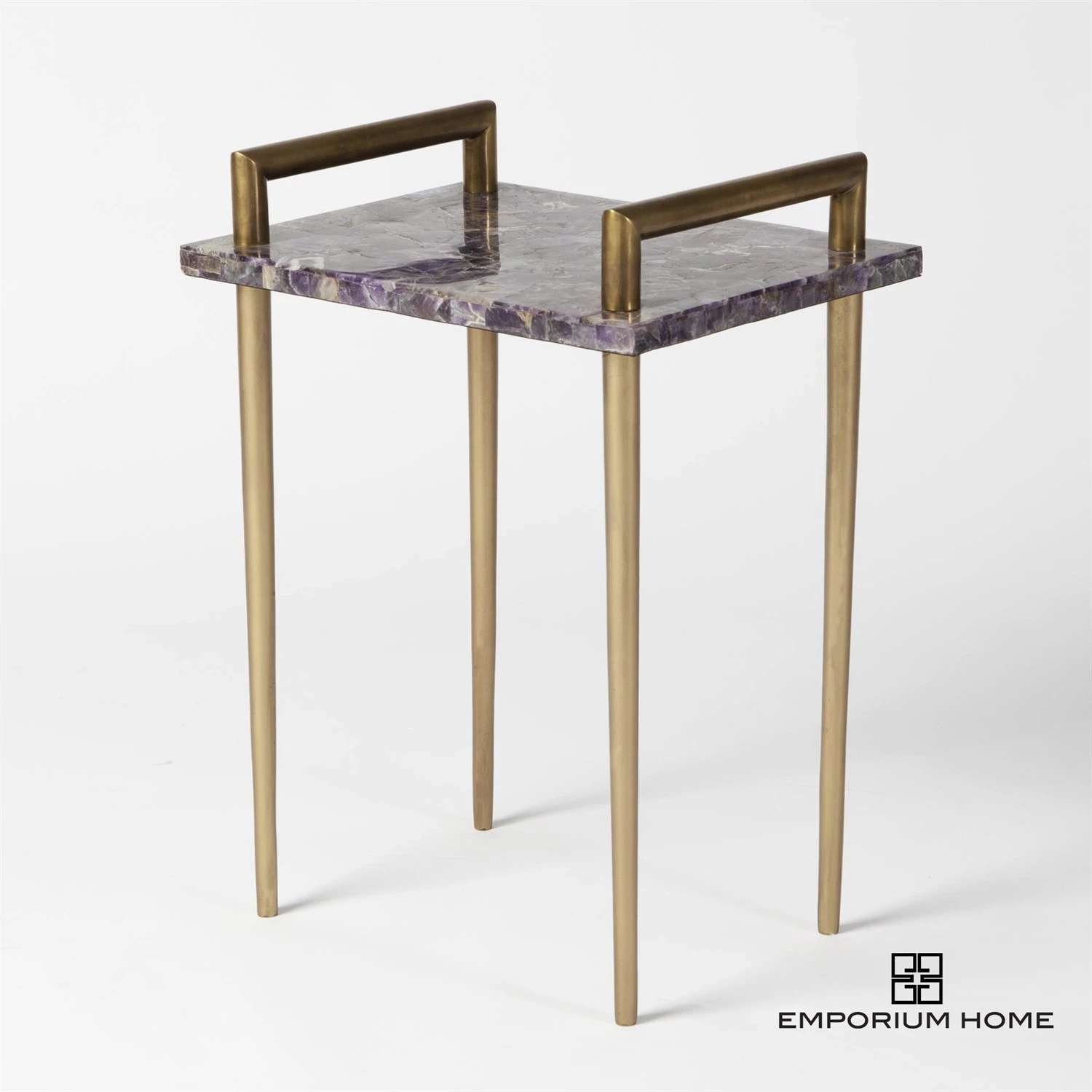 Our Amethyst Handlebar Side Table combines the beauty of a hand pieced amethyst stone top and satin brass handles and legs, for a look that’s both natural and sophisticated at the same time.