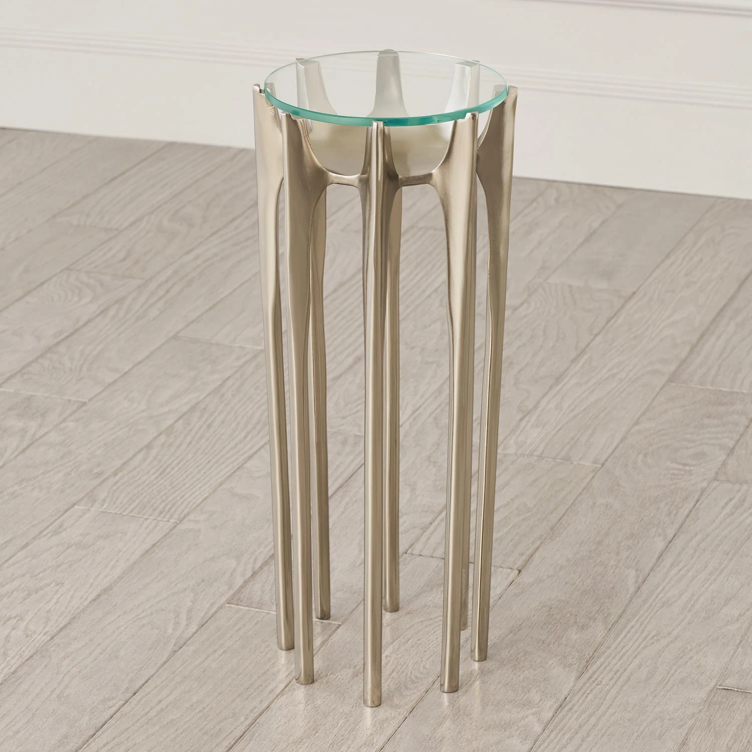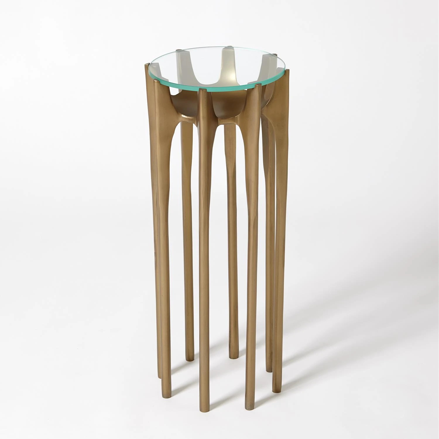 Dramatic multi-legged martini table and cast in aluminum with a glass inset top. Available in oil rubbed bronze, antique brass, and antique nickel.