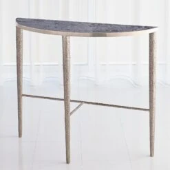 Referencing the natural world, this beautiful table has a twig textured brass frame with two stationary, white, honed marble shelves. The simple beauty of the materials shines through in this timeless design.