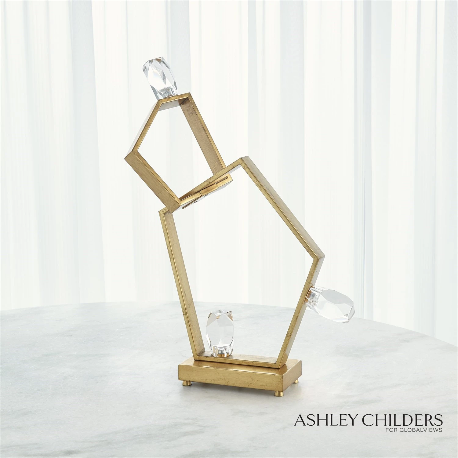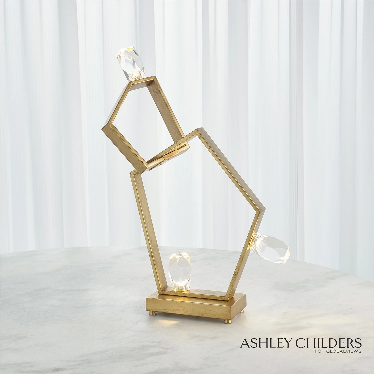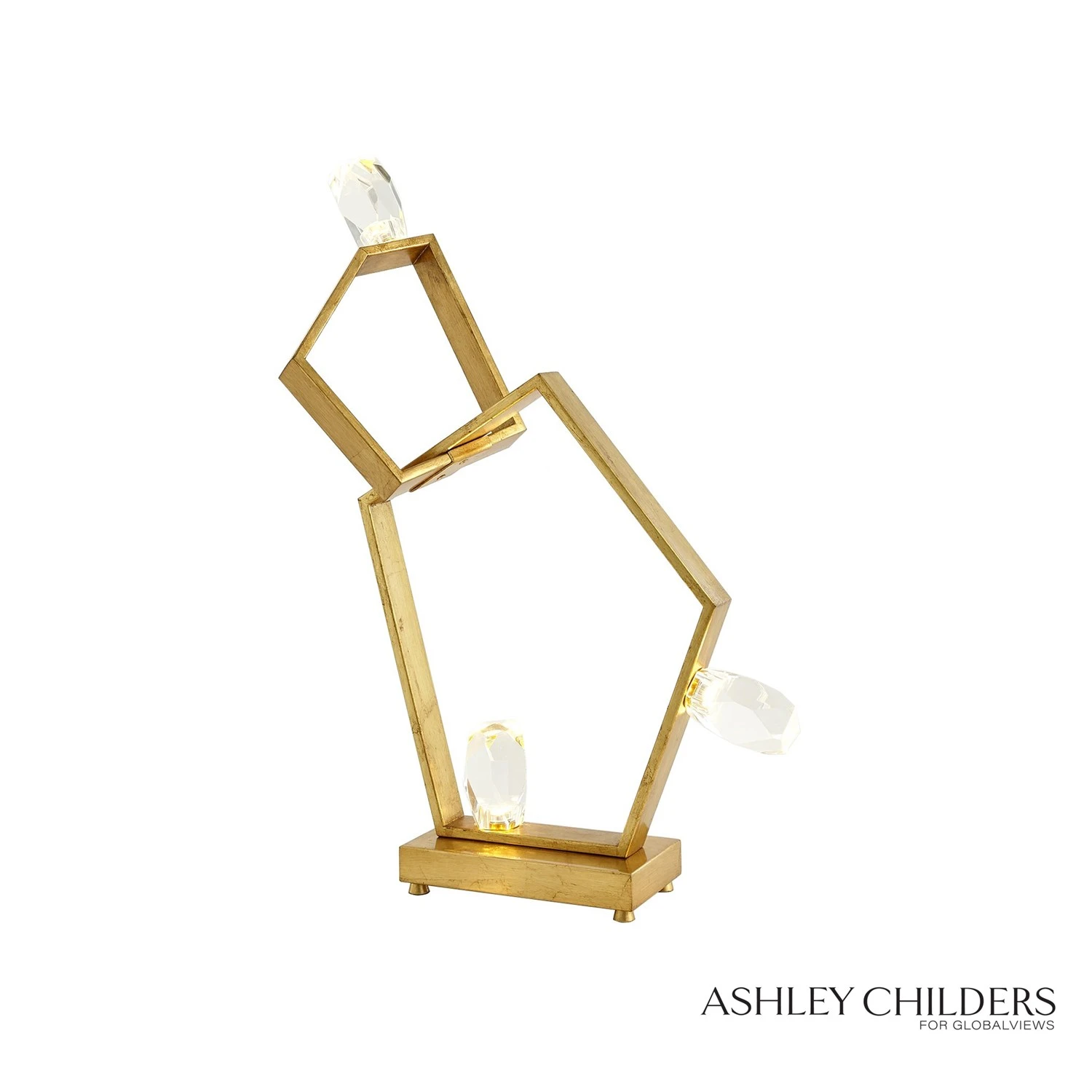 Faceted crystal shapes are illuminated by LED from within to create a stunning effect in our Ashton Table Lamp. An abstract geometric body is highlighted with a gilded gold leaf finish and pairs perfectly with the cut crystal stones. If you are looking for a lamp that makes a bold statement, this is a perfect choice.
