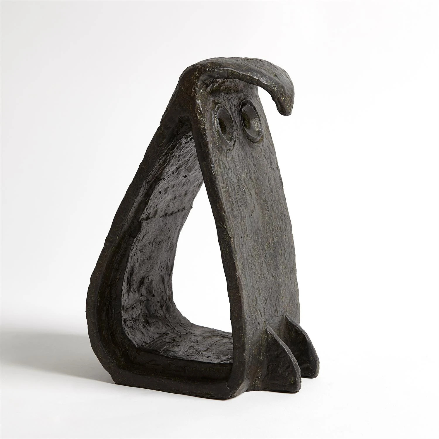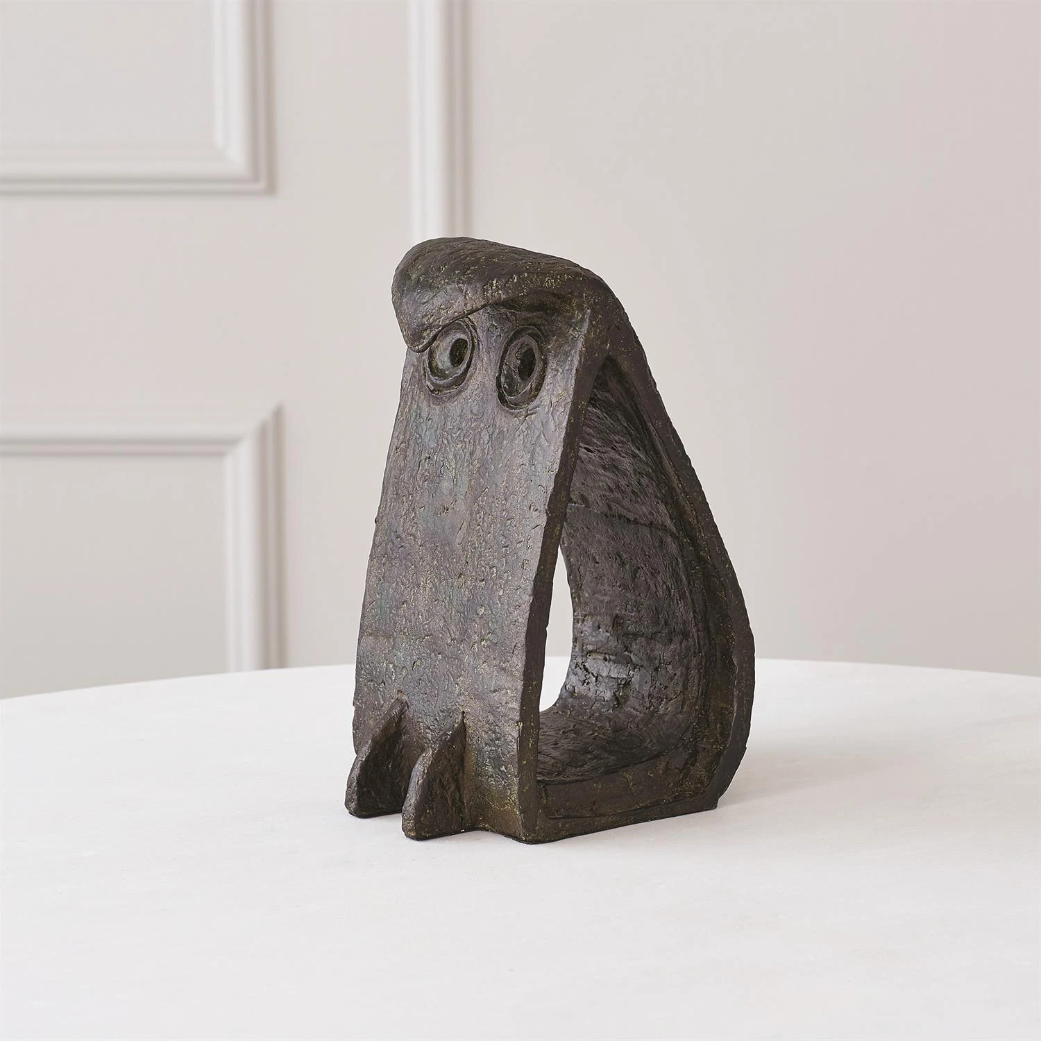 Sculpture artists in northern China hand carved the original models to make this item; molds are then made from the carved model. Our Bent Owl is crafted from sand casted iron with a dark bronze verdi finish.