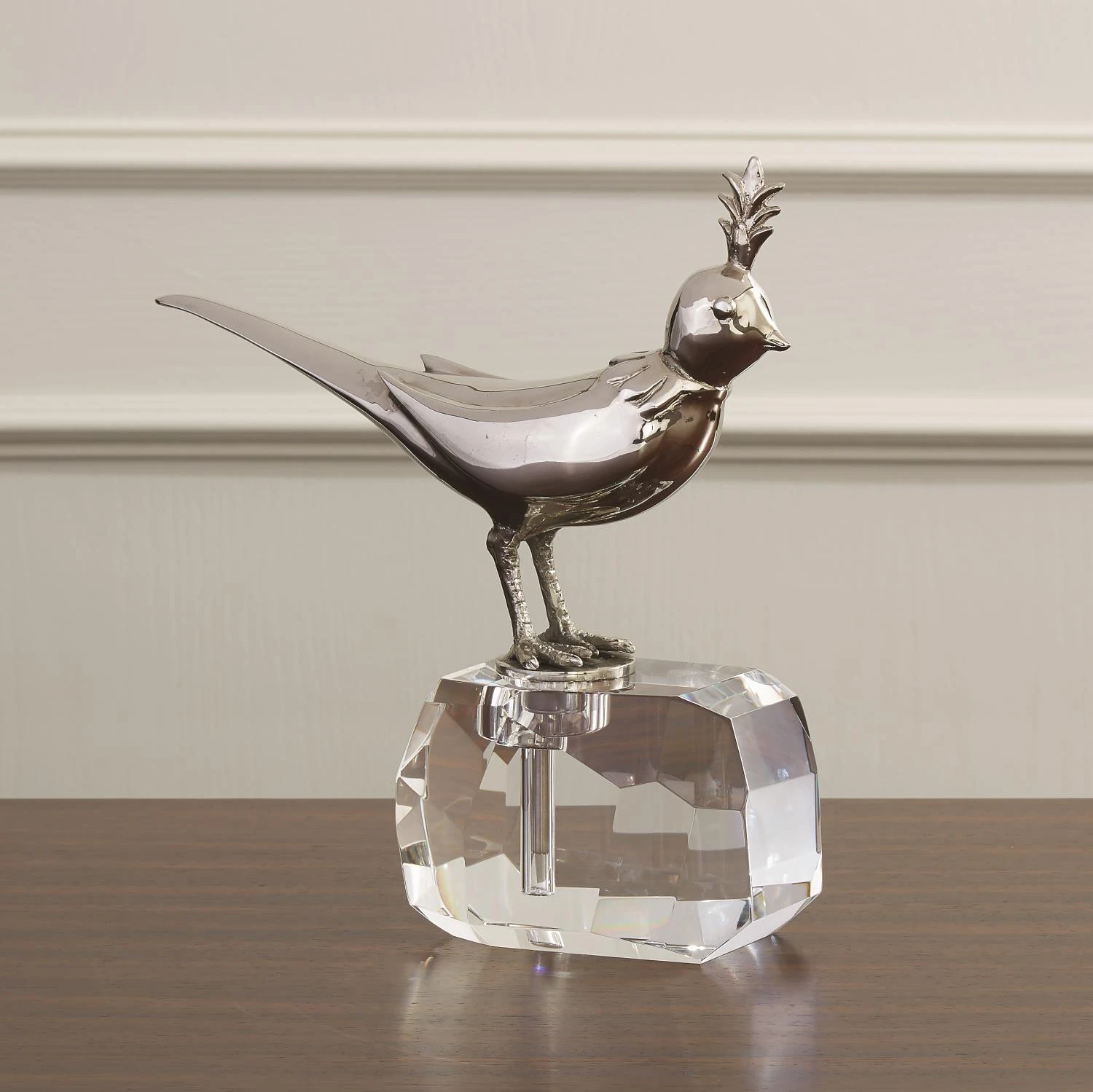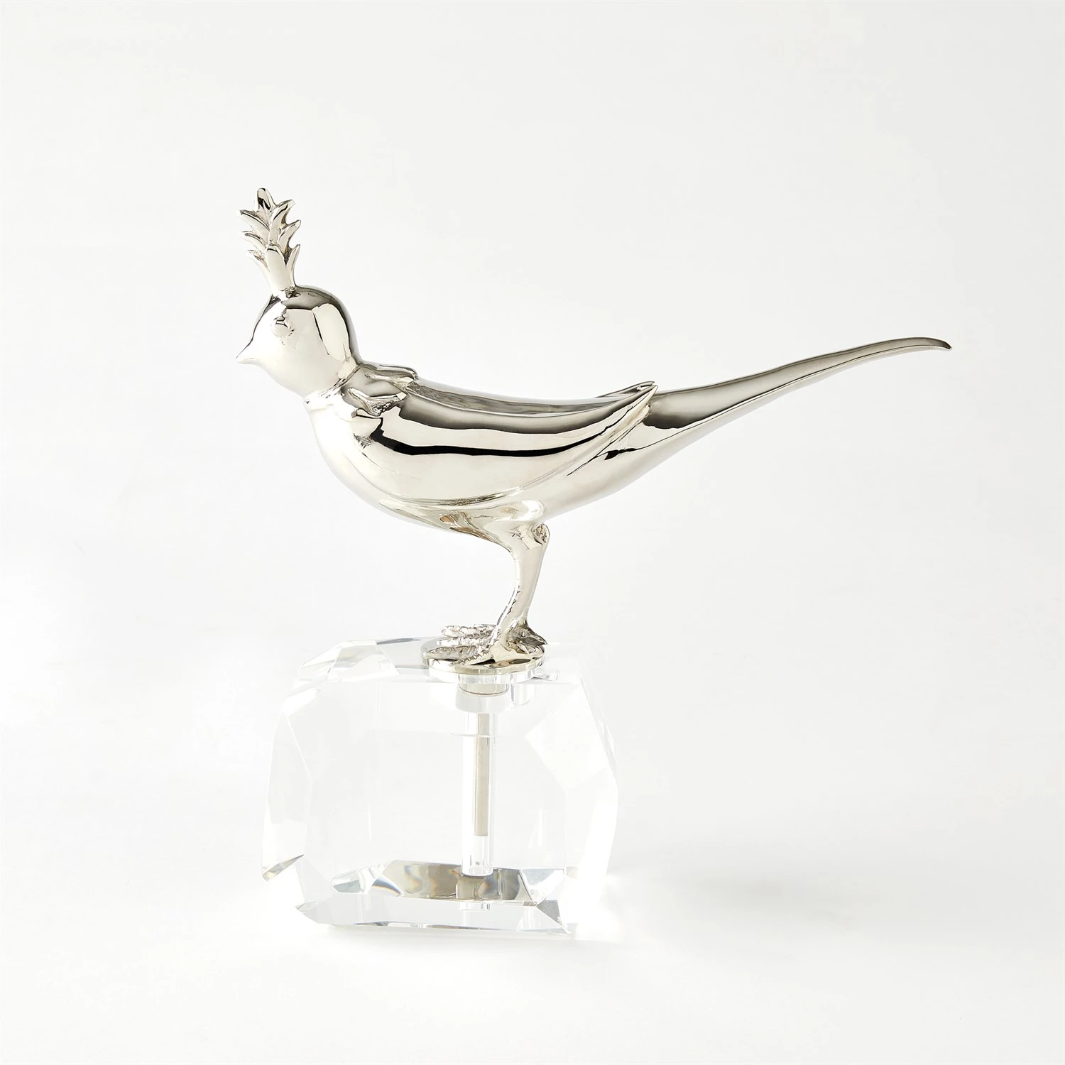 This whimsical little Bird on Crystal Rock was inspired by a vintage high-fashion brooch. Our fanciful feathered friend has been done in solid brass with a nickel plated finish and perches beautifully on its hand polished crystal base.