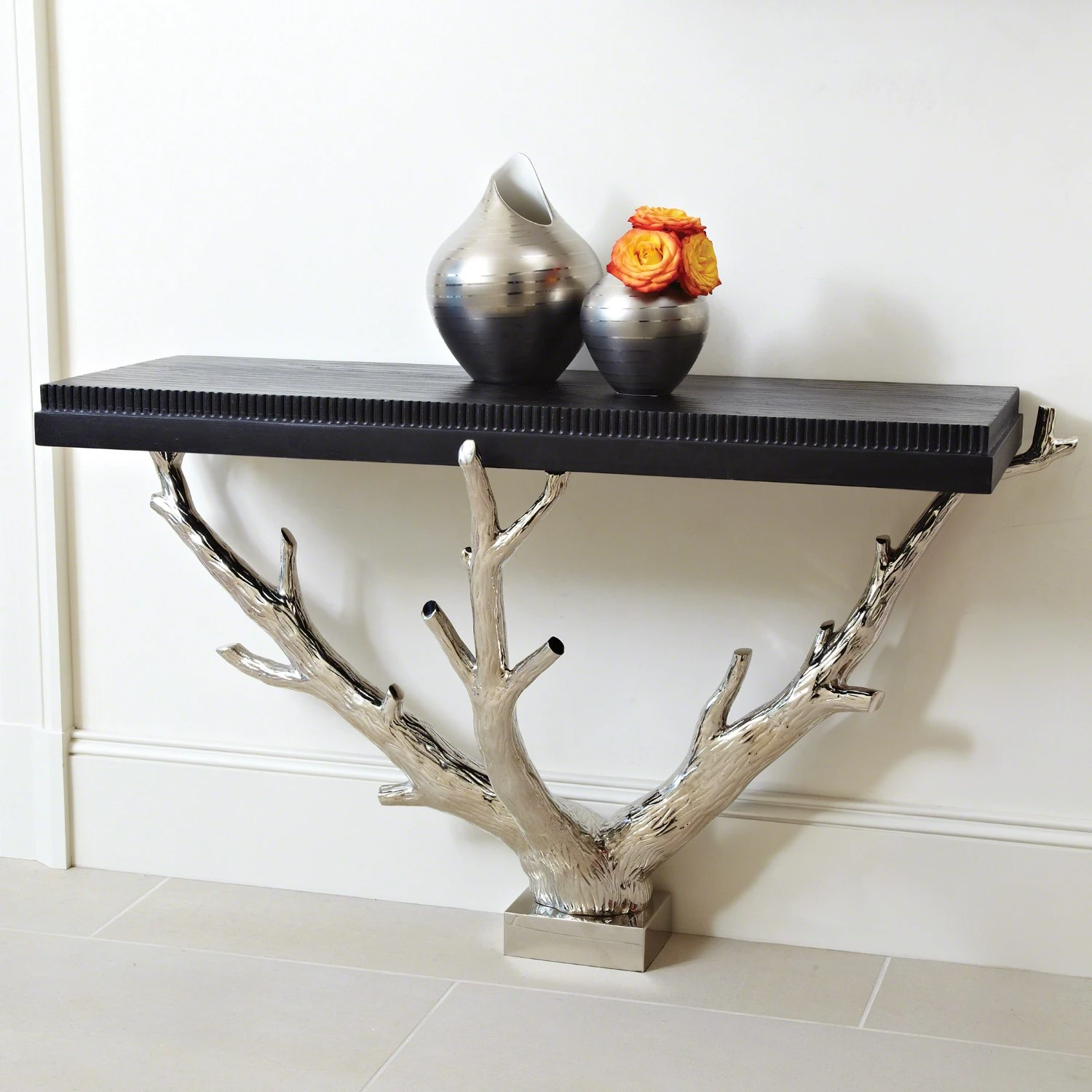 The Branch Wall Console is an artistically expressed functional piece of furniture. The top is hand planed with a carved fluted top edge and the striking branch across the front is cast aluminum. Item must attach to wall