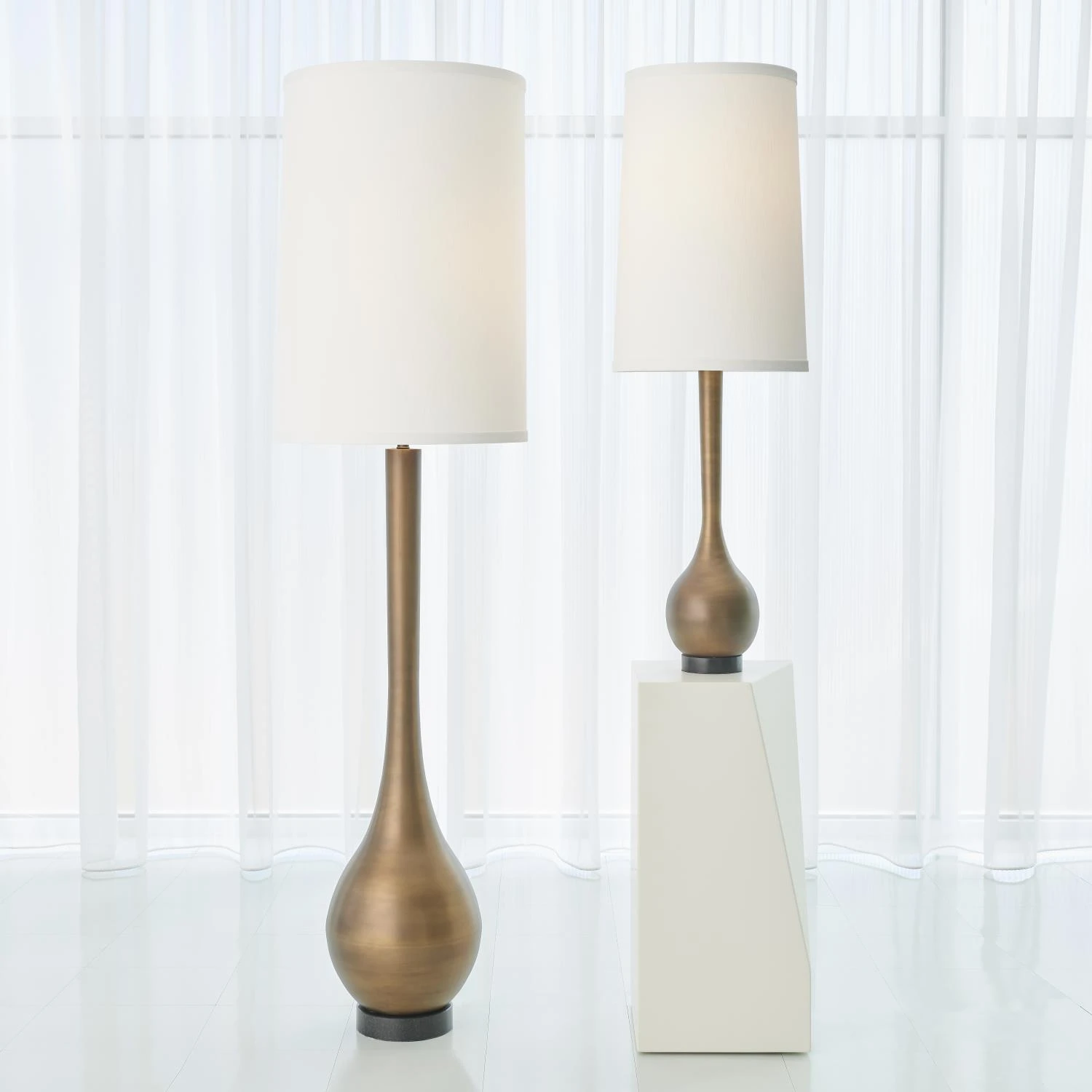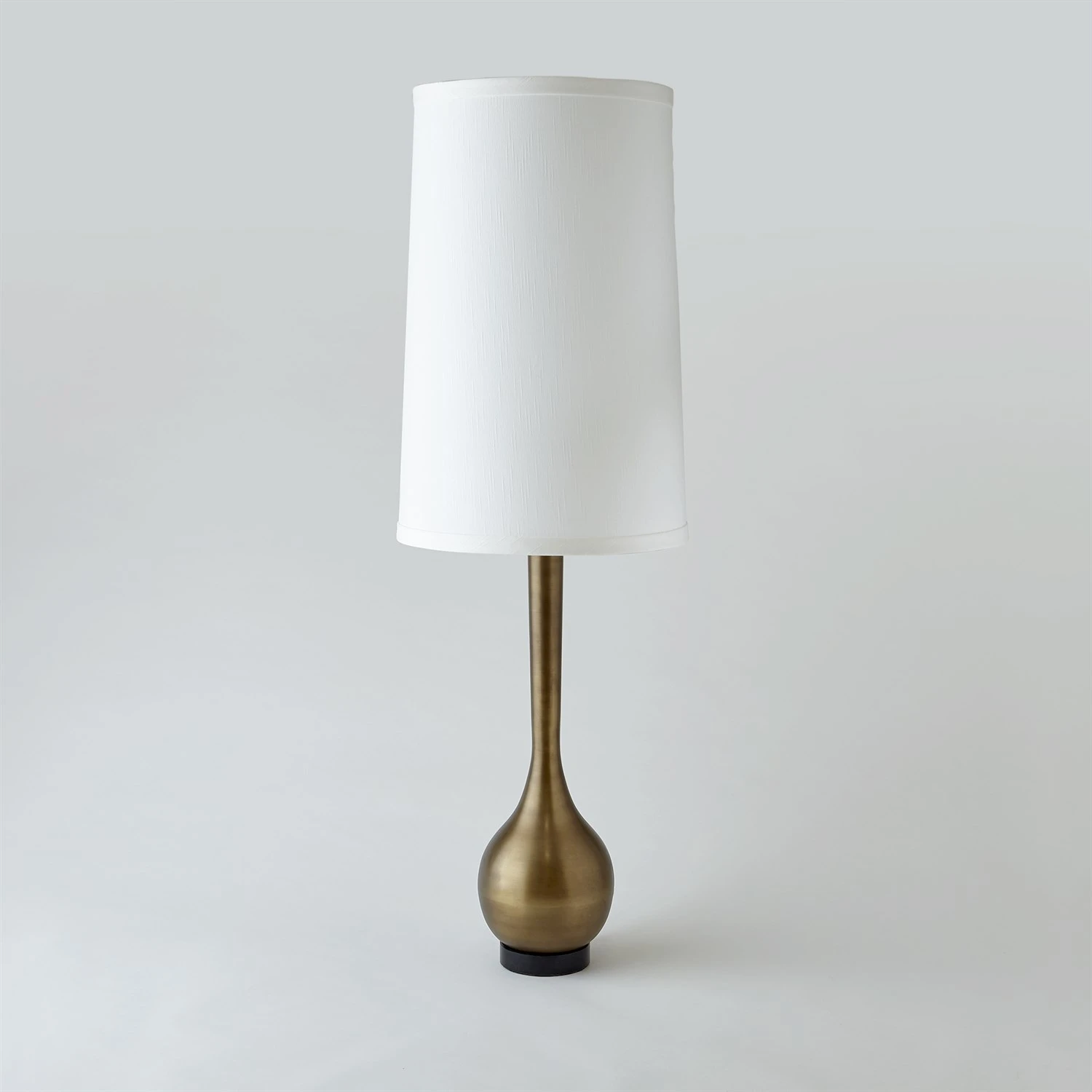 One of our best selling table lamp silhouettes. The Bulb Vase Table Lamp is made of solid brass with a light bronze finish. Black granite base. Holds a 100W “A” lamp bulb. 8ft clear silver cord, switch at socket. Hardback shade made of polyester and silk. Round drum hardback shade w/ivory faux silk self trim