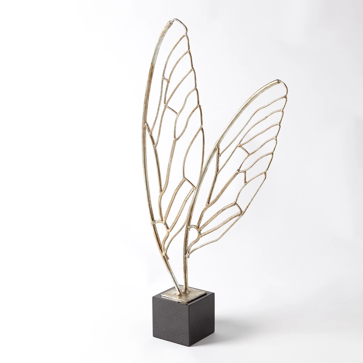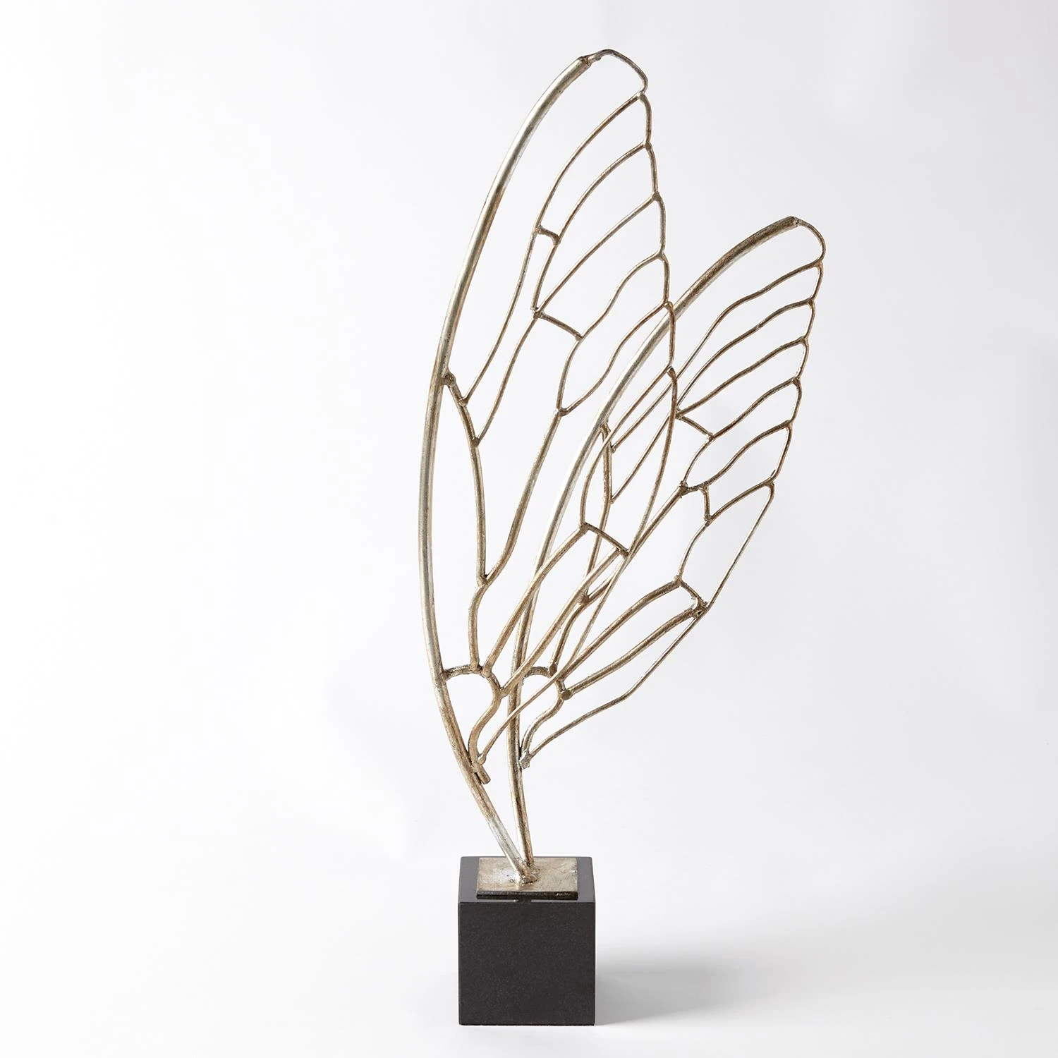 A symbol of beauty and grace, these elegant wings are crafted from iron, finished in silver leafing, and sit atop a black marble base.