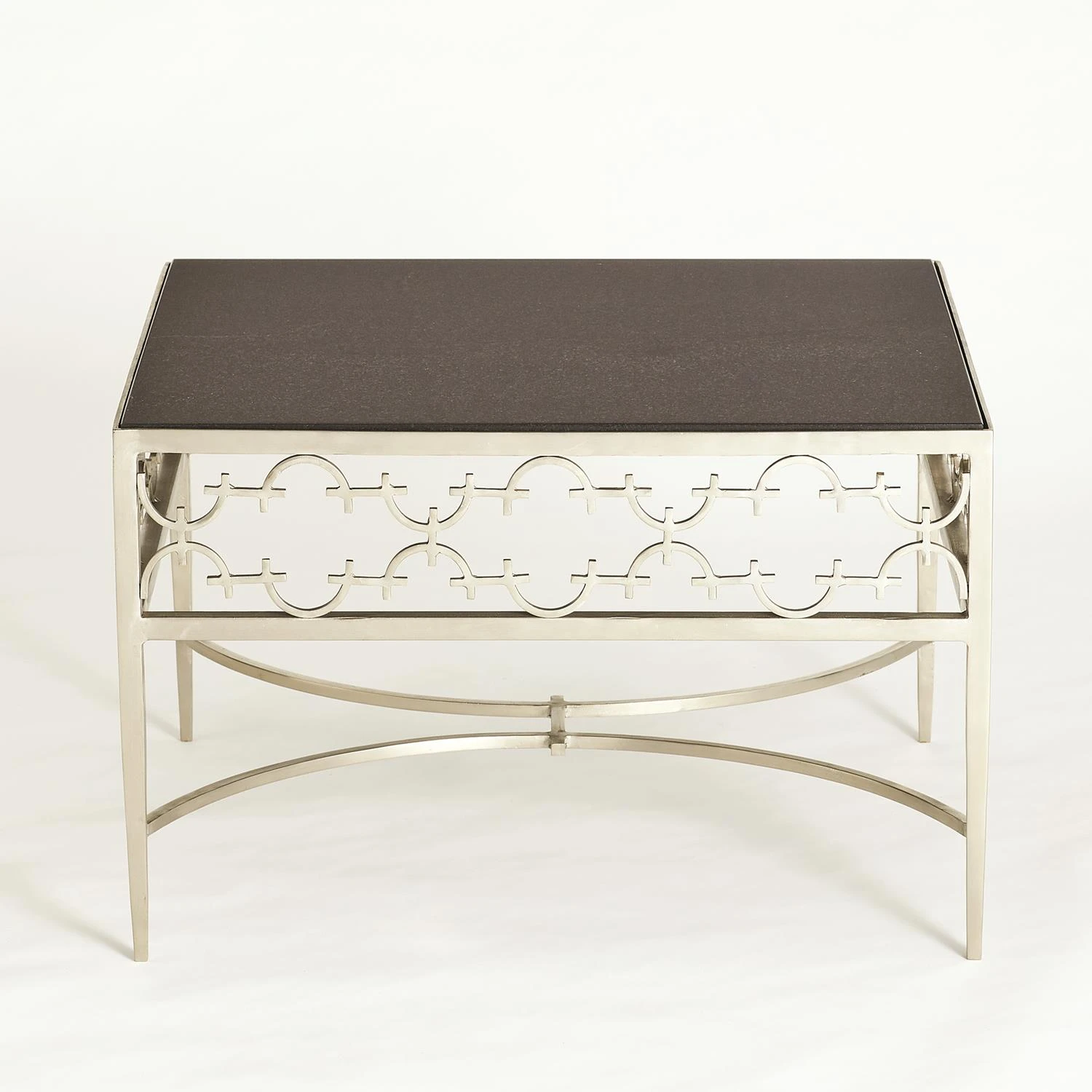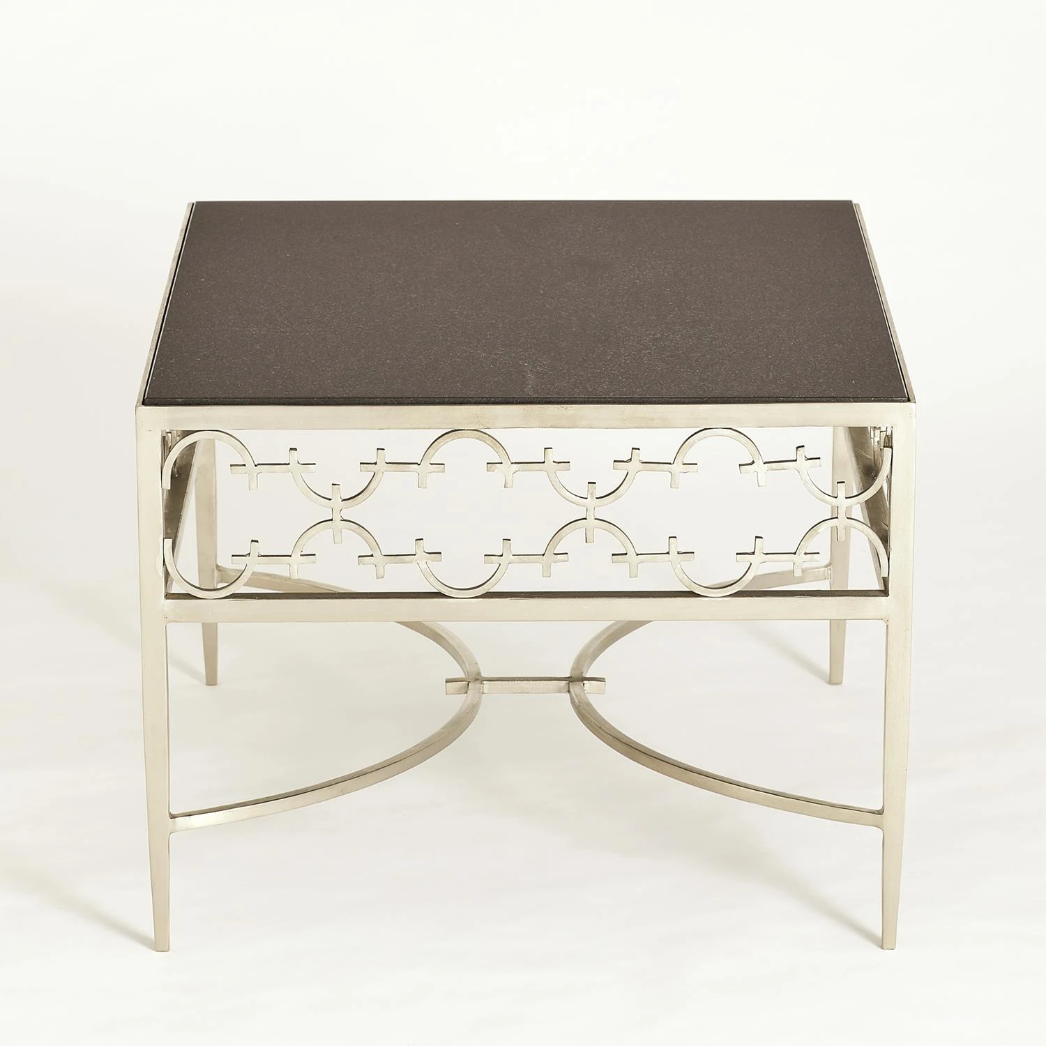 A solid black granite top sits atop a silver finished iron base making our C-Fret Cocktail Table the perfect addition to any room.