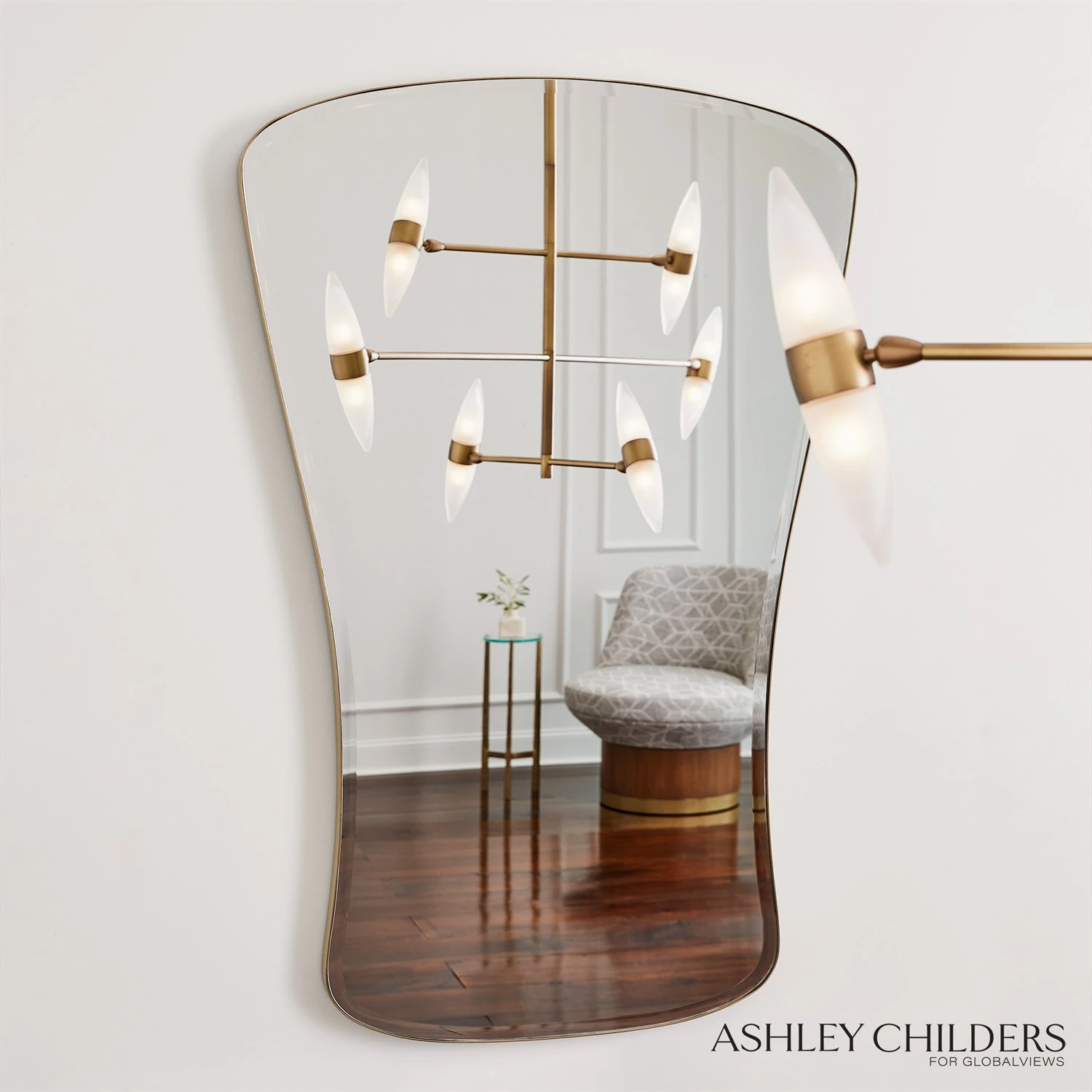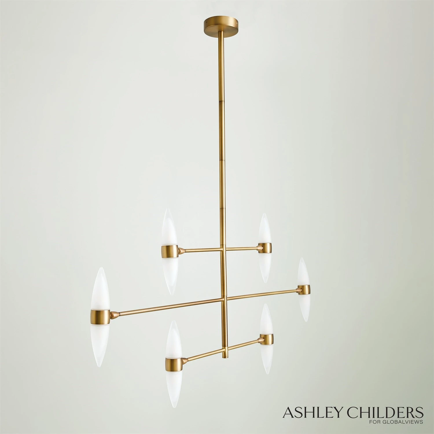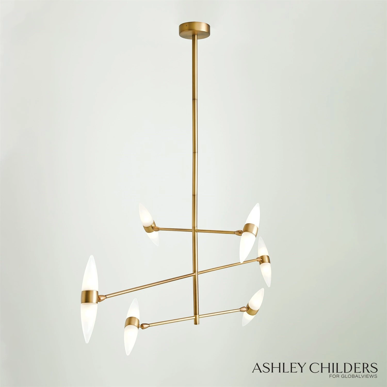 Modern simplicity was the design directive when creating the Callie Collection. Frosted saber shaped glass radiates with the warm glow of diffused light and pairs beautifully with the satin brass articulated arms of this sculptural chandelier.