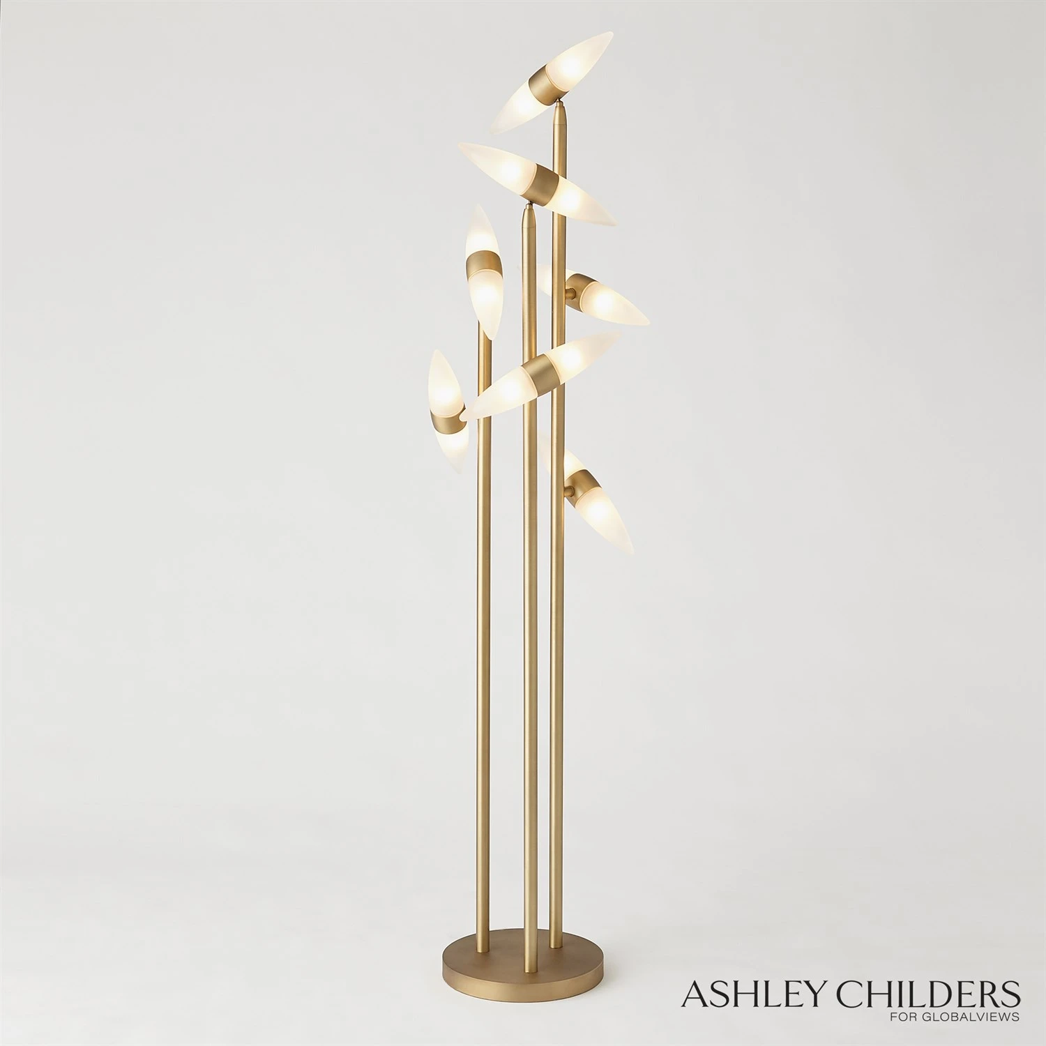 Modern simlicicty was the directive when creating the Callie Collection. Frosted saber shapped glass radiates with the warm glow of diffused light and pairs beautifully with the satin brass articulated accents of this sculptural floor lamp.
