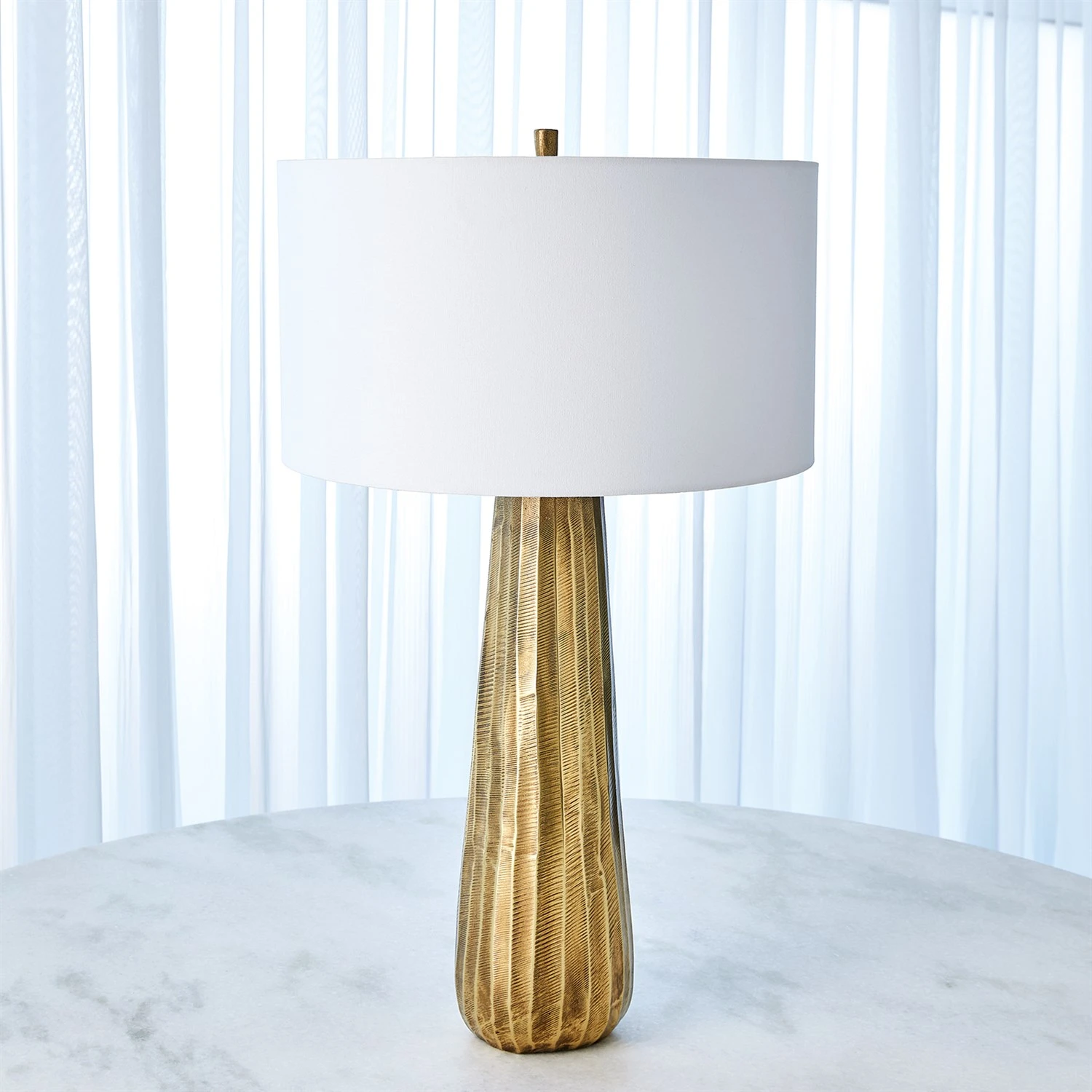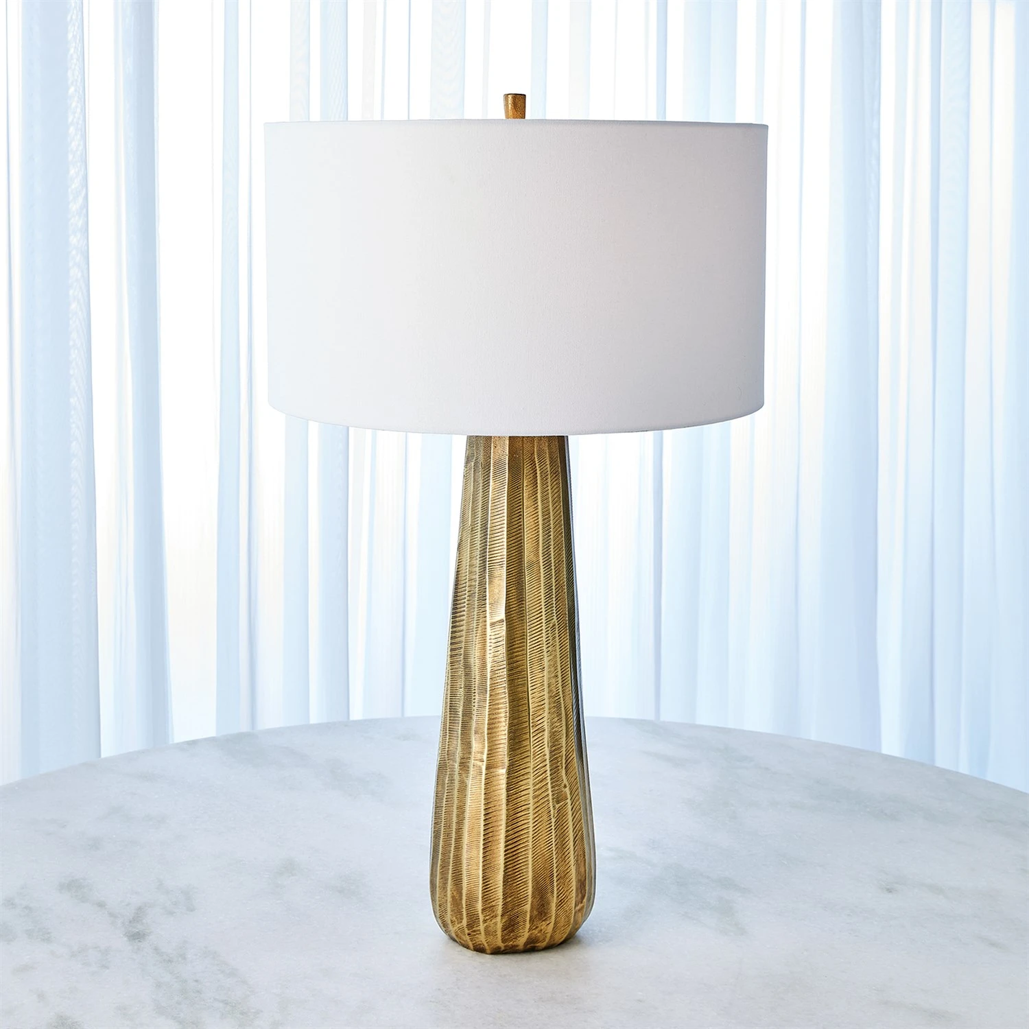 The Chased Round Table Lamp is made of aluminum with an antique brass finish.