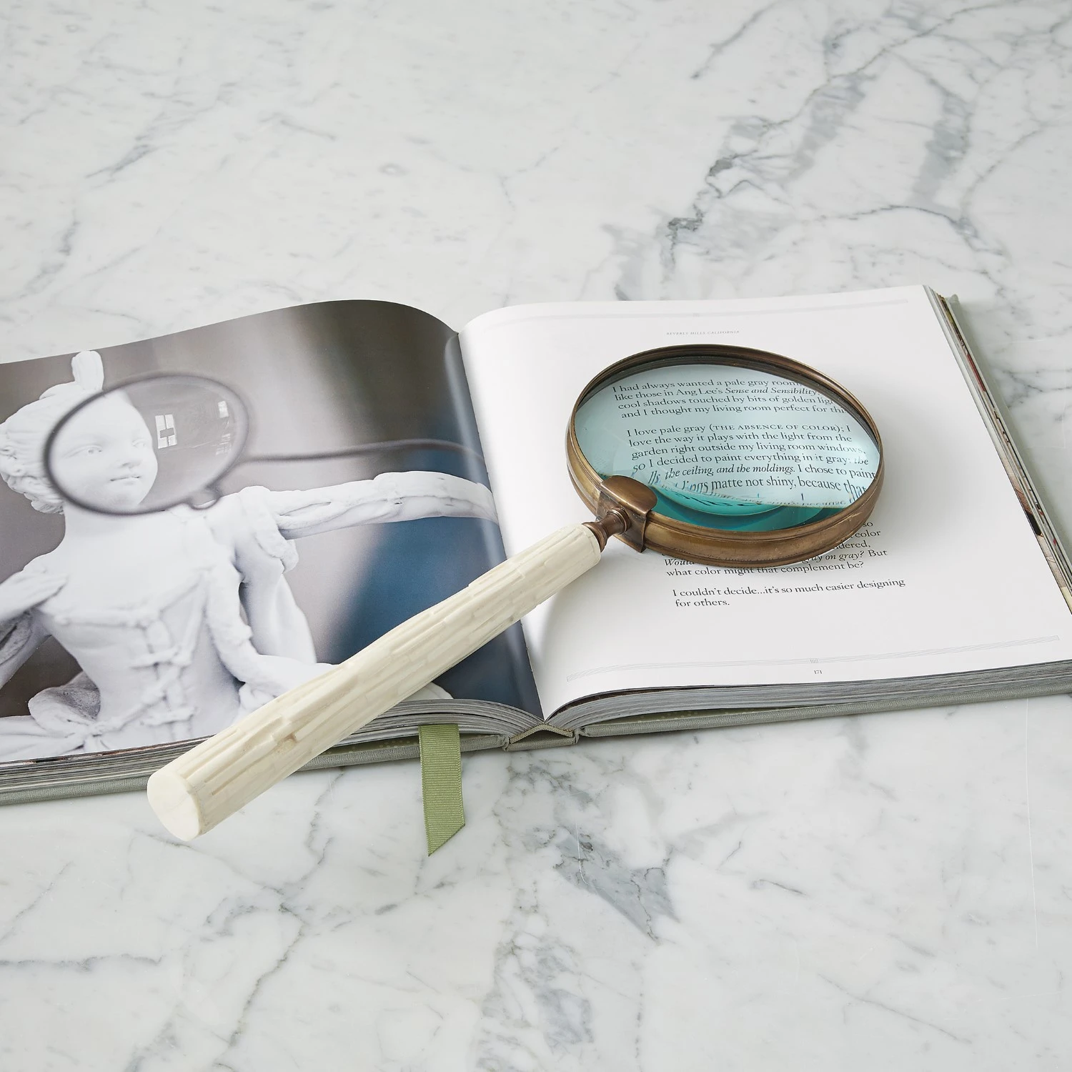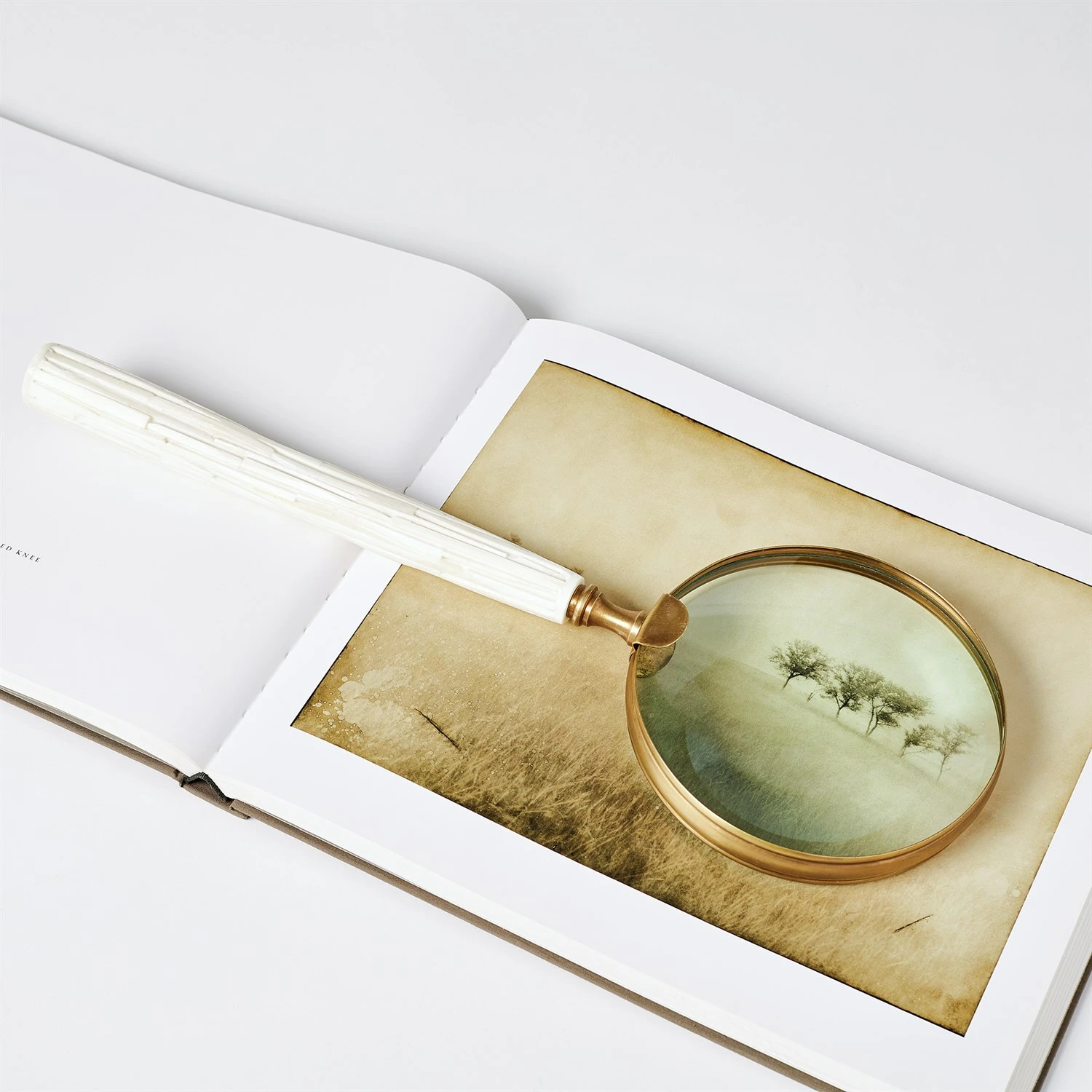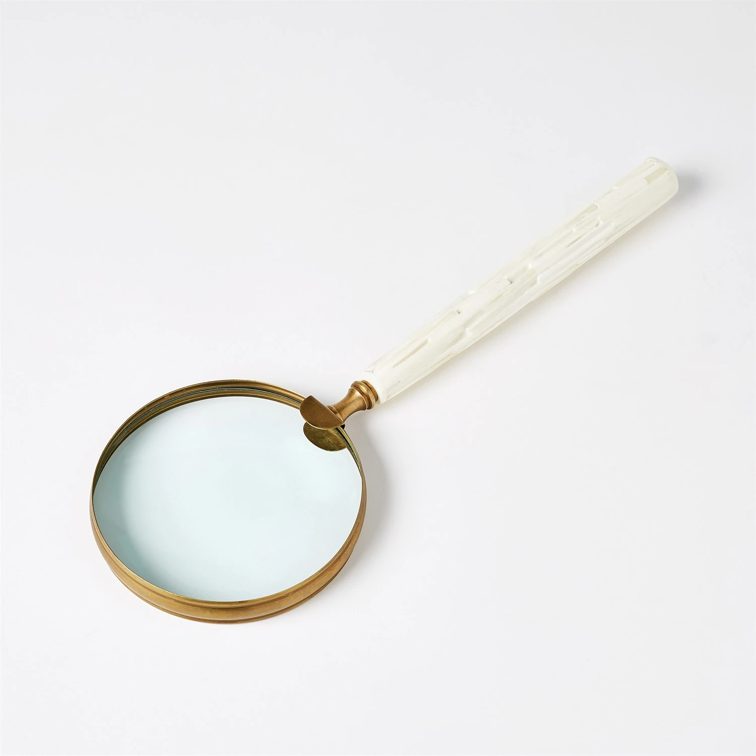 Hand-hewn chiseled bone magnifying glass is intricately crafted to reflect the beauty of natural bone.