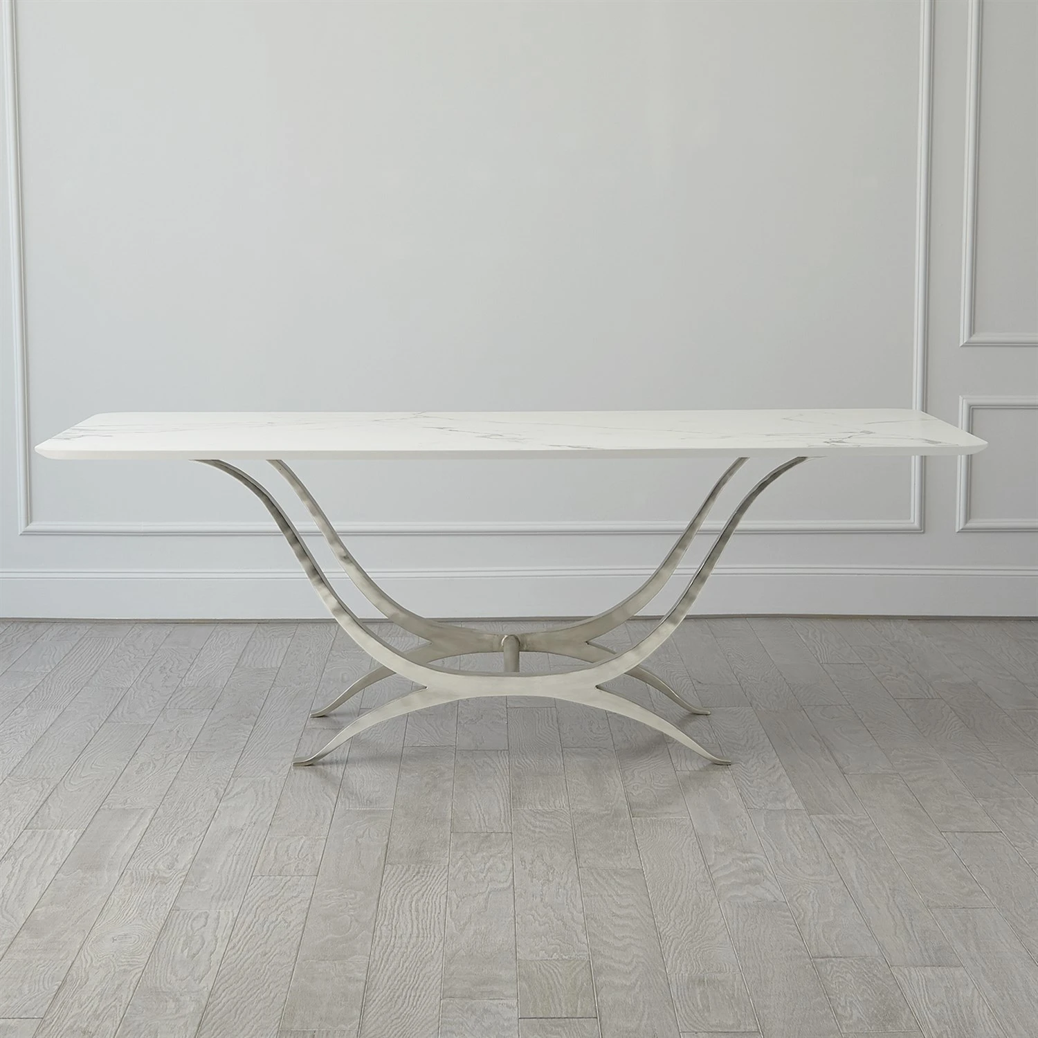 The Chorda Dining Tables reflect the classic shape of the Grecian pulled longbow constructed of hand-forged iron with a nickel finish supporting Italian table surfaces.