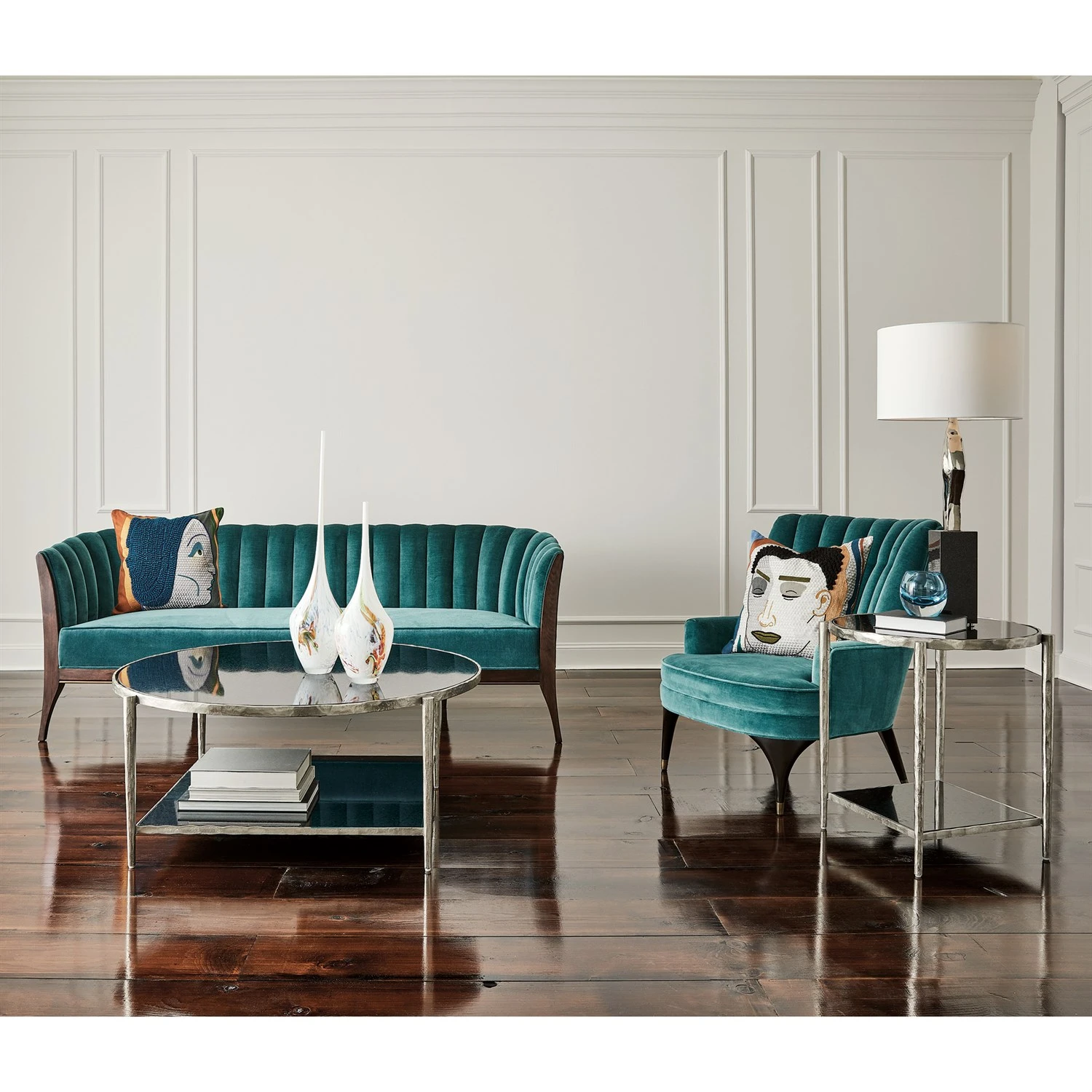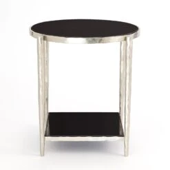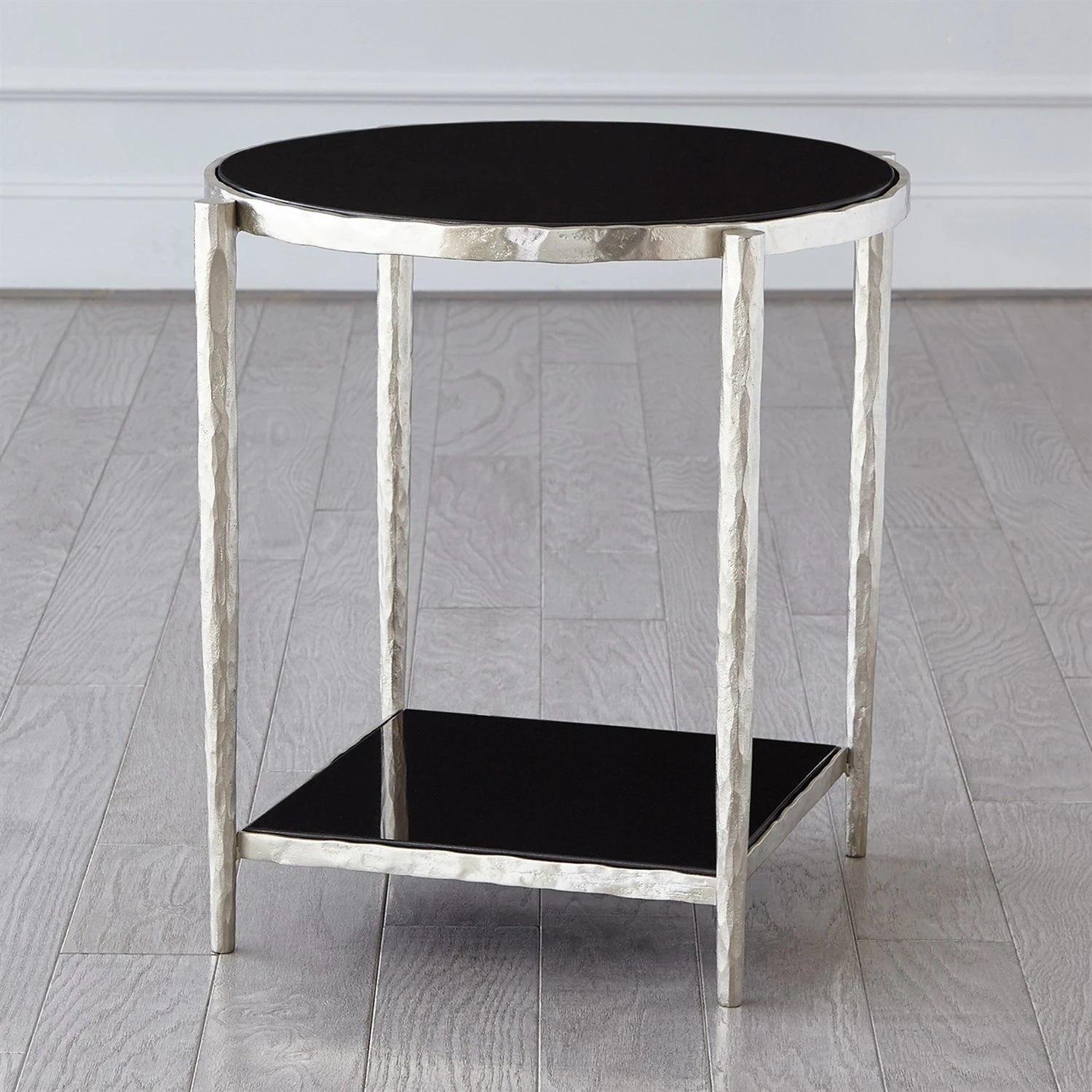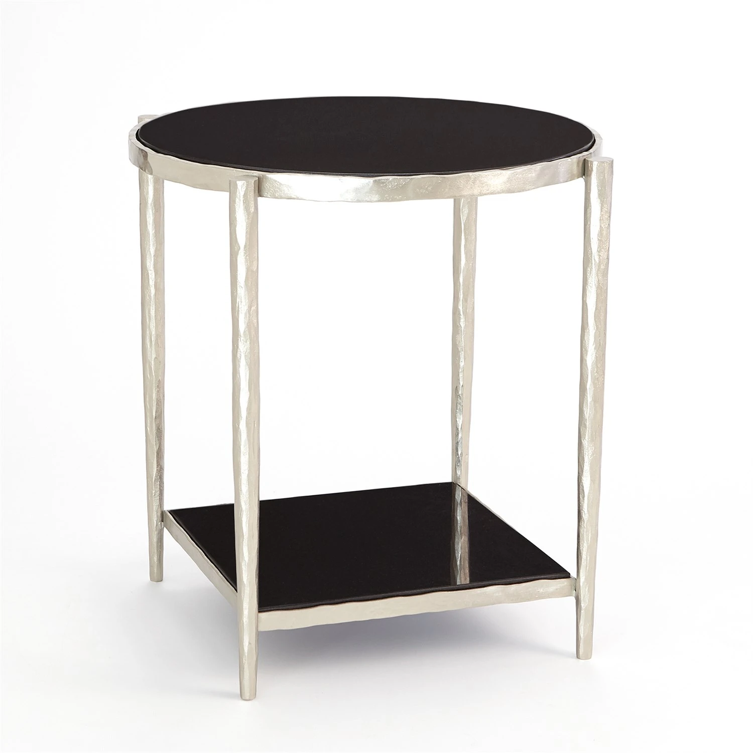 Black granite and industrial iron come together in a display of strength and beauty. The Circle/Square Side Table has a hammered texture with a hand-painted luxe nickel finish. Made of naturally quarried granite, color and veining variations may occur.