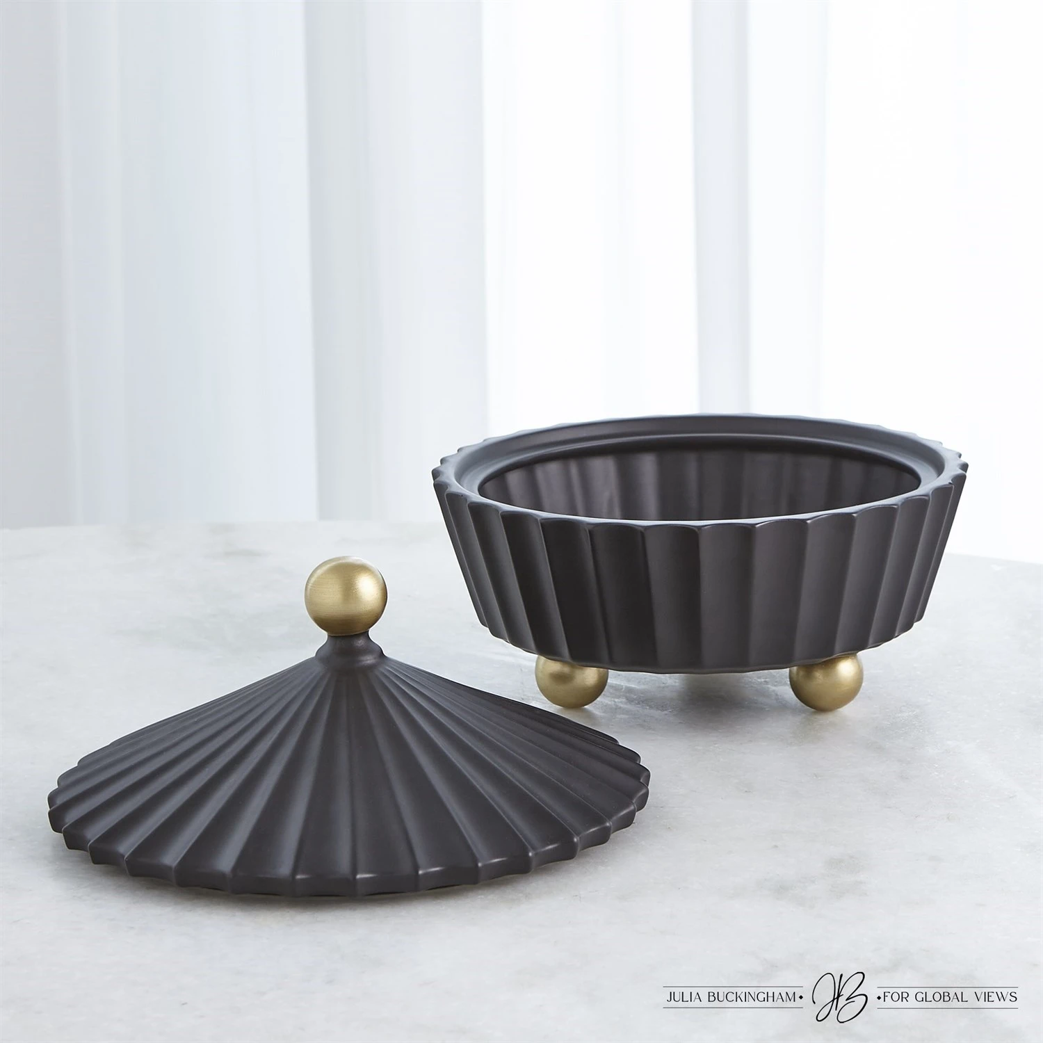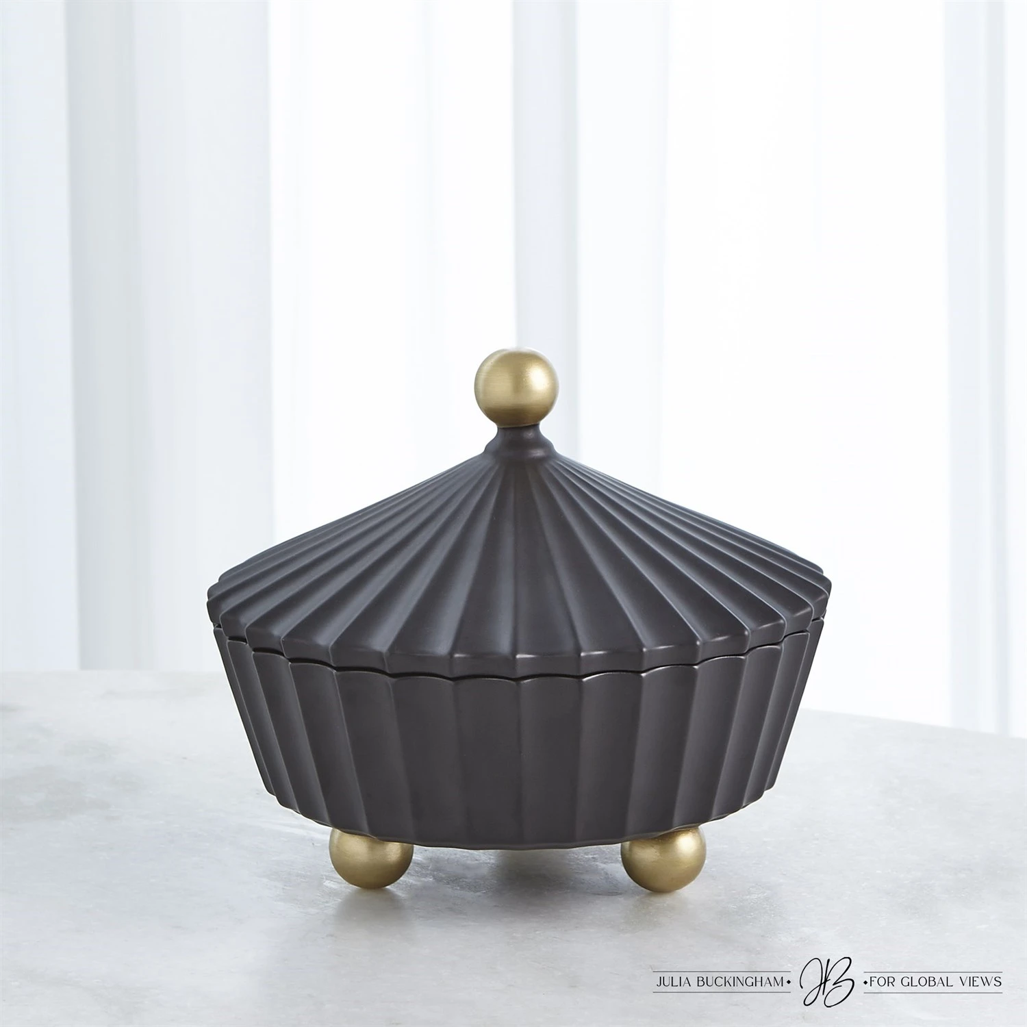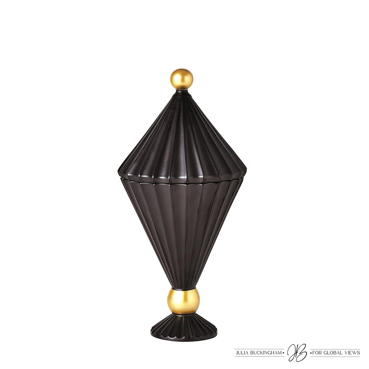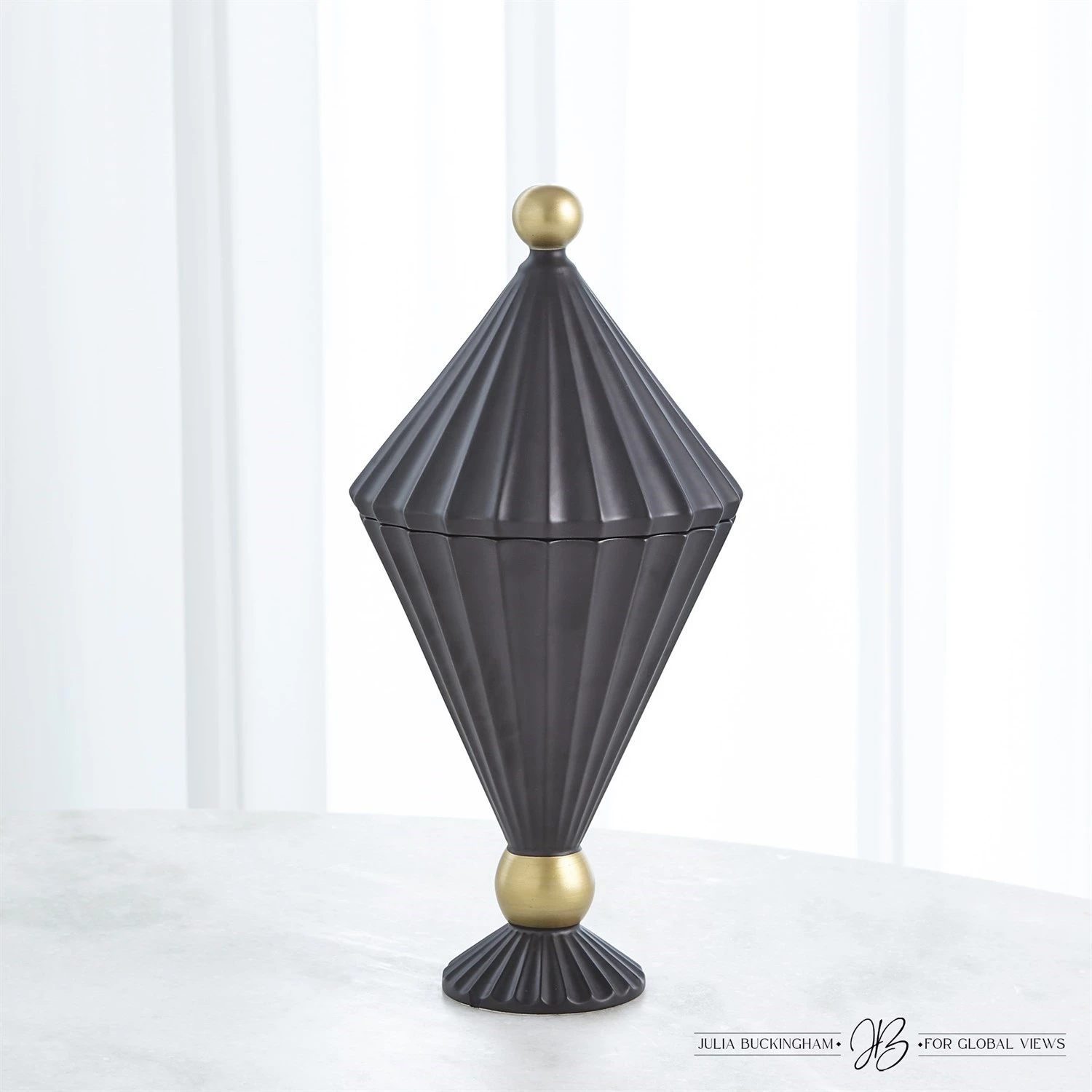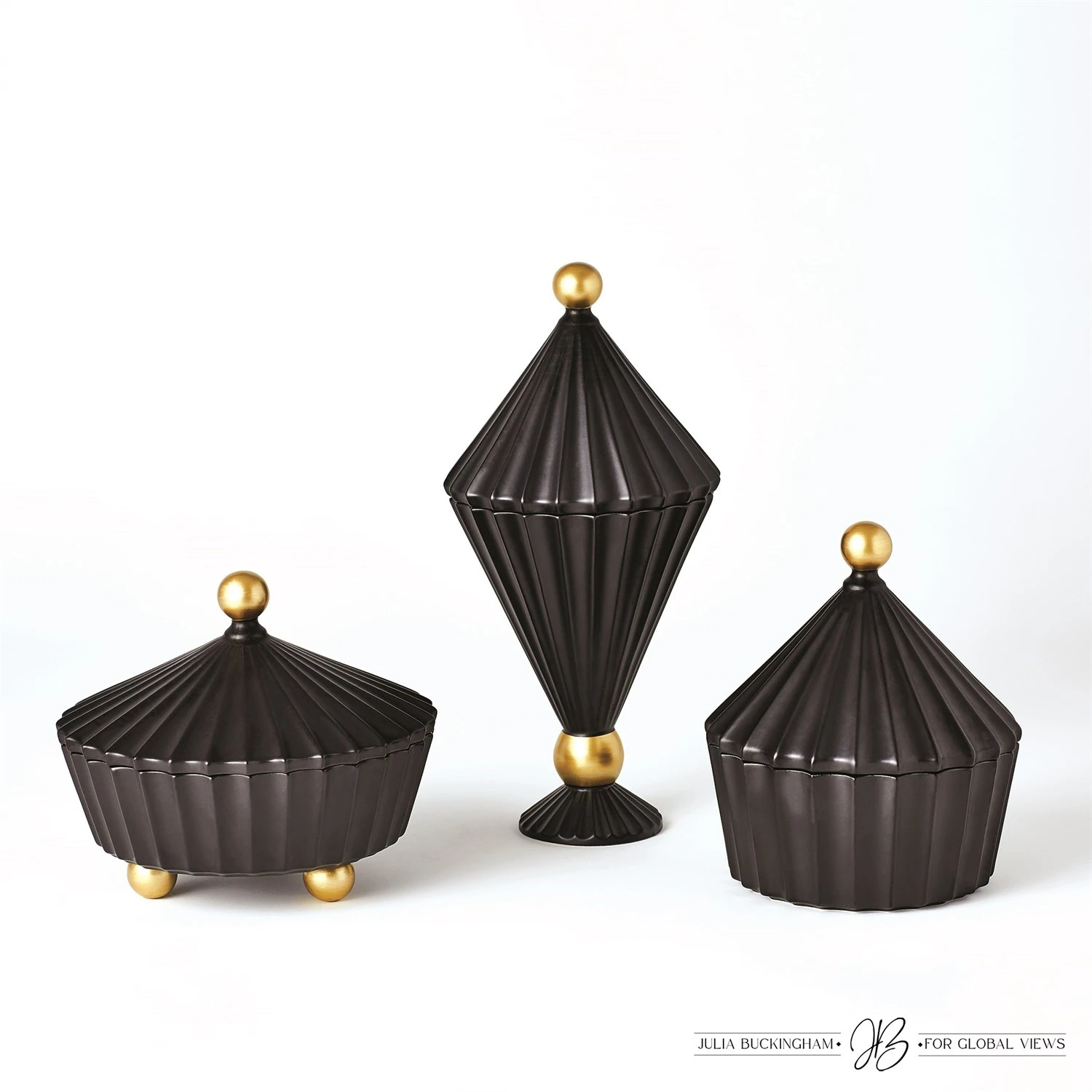These new ceramic lidded vessels made in Portugal reflect the profile of old-world carnival tents and will create a magical landscape on any surface as a single vase or in a trio. These are available in a matte black finish with antique gold accents on both the finial and feet. This family of vessels will adorn any space with flair.