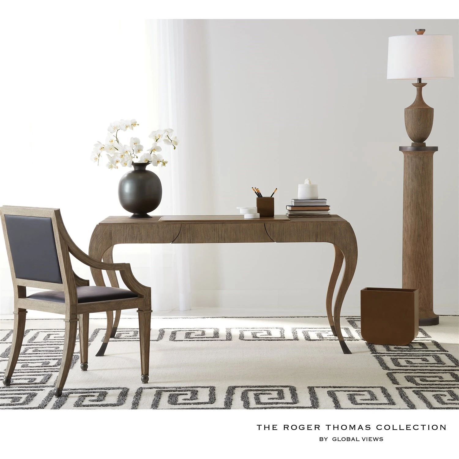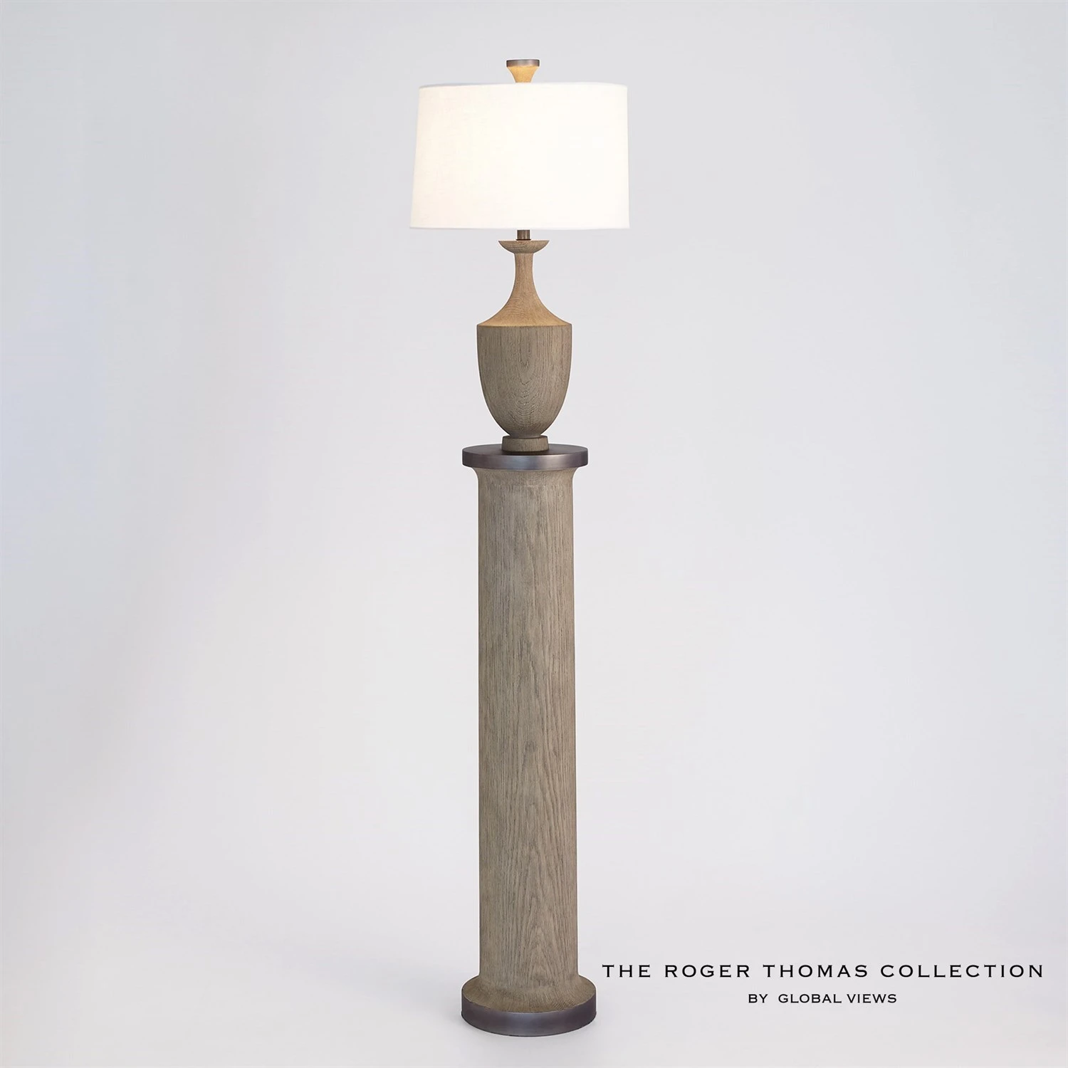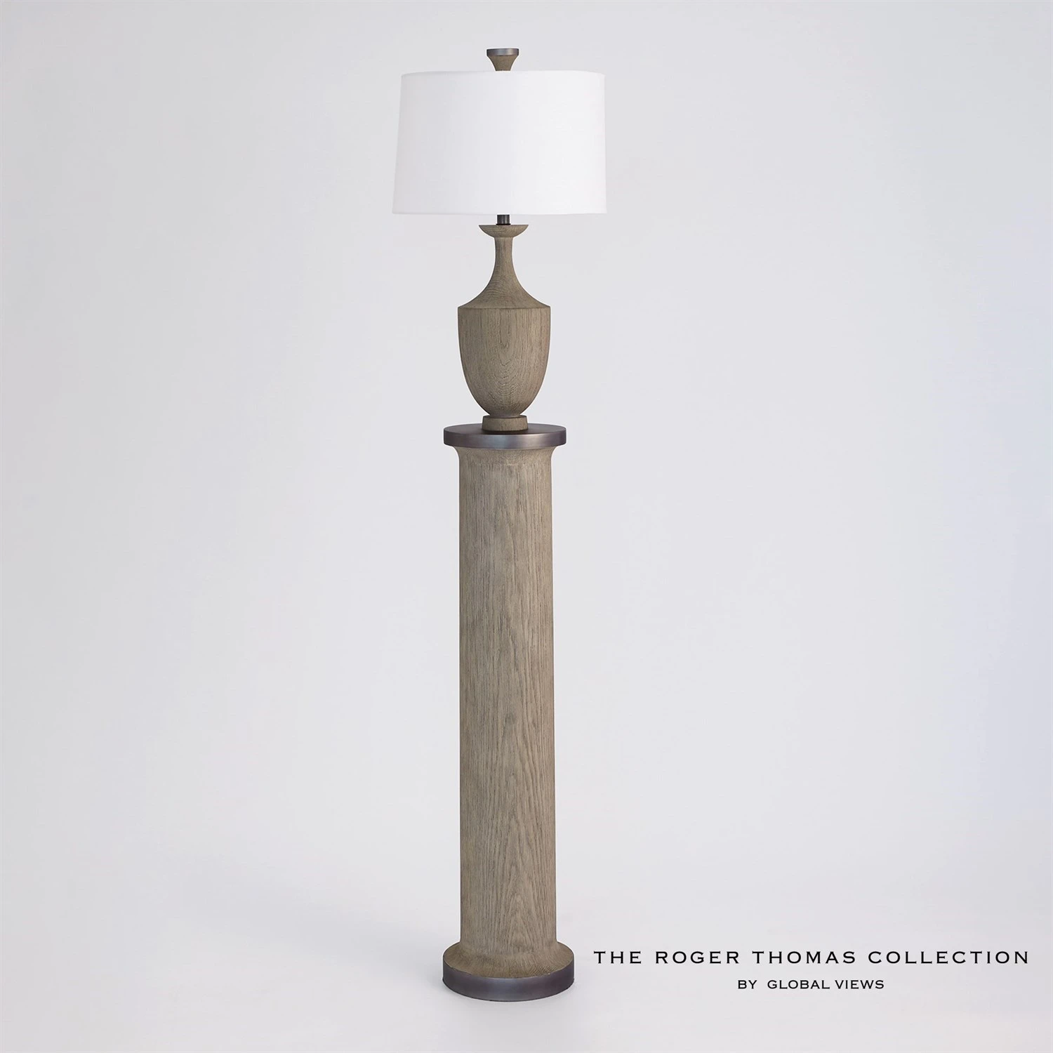 Quite large in stature, the Column Floor Lamp is made of grey sandblasted oak with bronze leaf and hardback white linen shade with a rolled edge. Also available in black cerused oak.