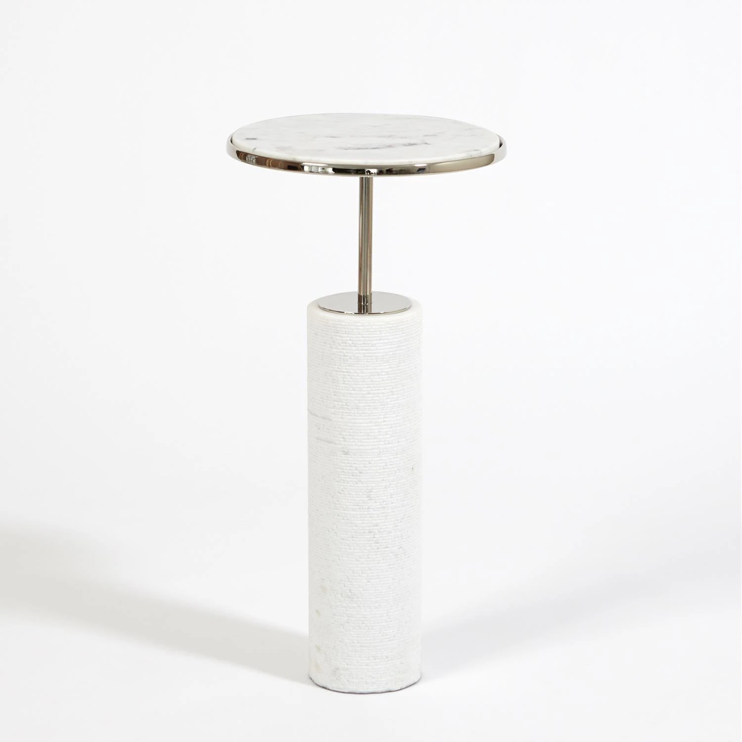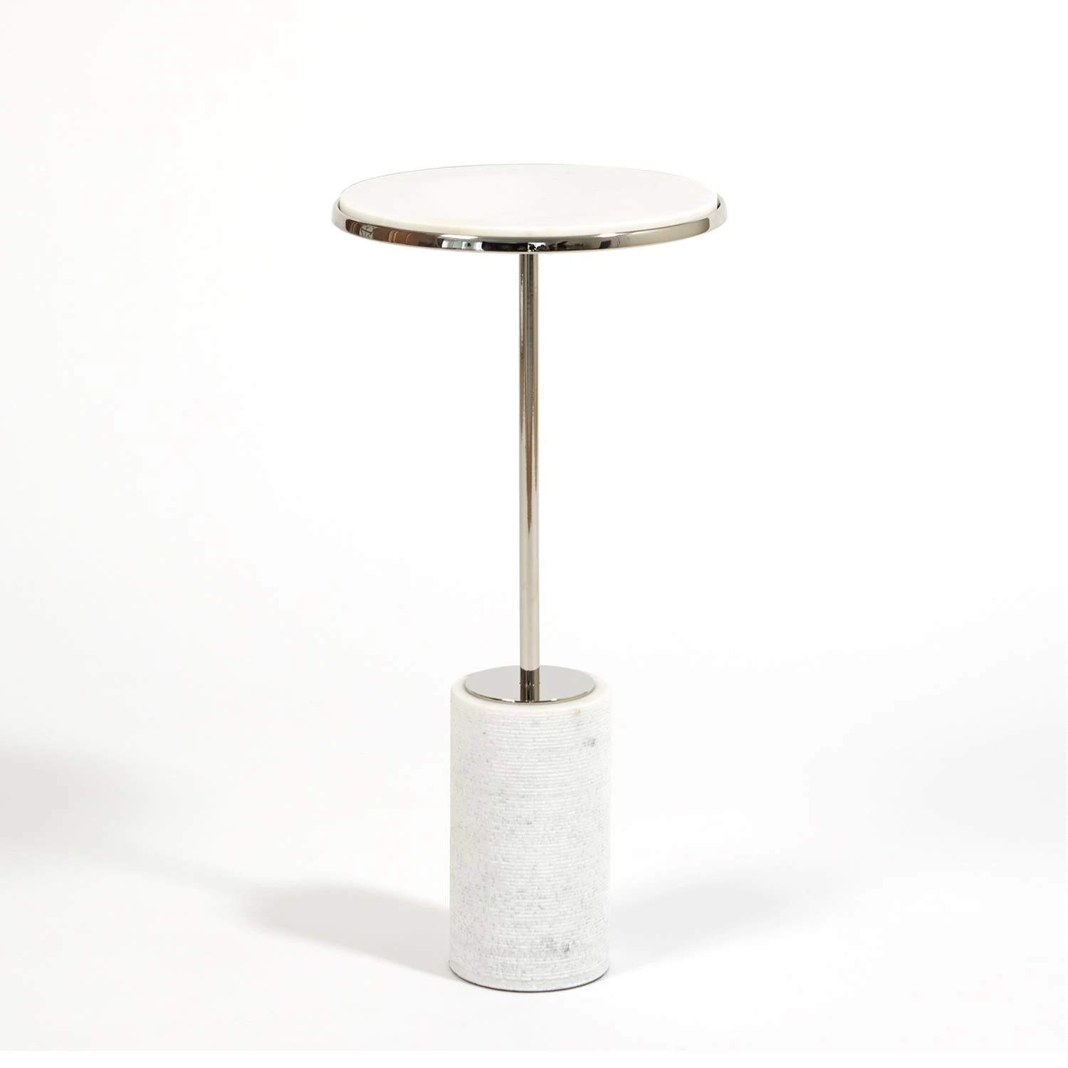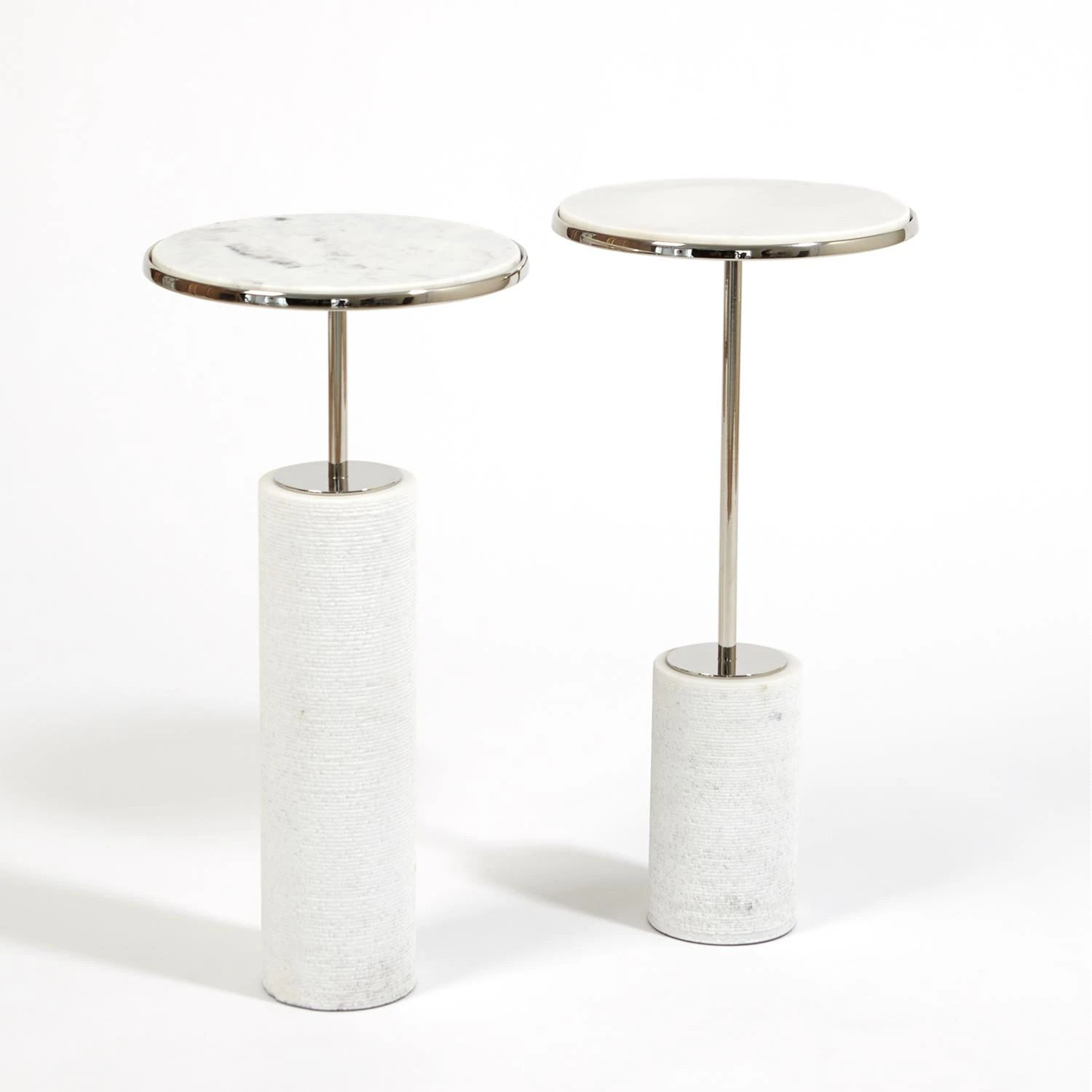 A huge block of white marble is drilled out to produce a cylindrical shaft or core of solid marble to create the base for this beautiful table. These ‘cored’ bases are left in a rather unpolished state to contrast with the smoothness of the round tops. The stem and rim holding the marble are made of solid brass. These tables are available in two heights and offered in two finishes: Bronze or nickel plated solid brass. Perfect side tables (often referred to a drink tables) made in India are the results of this effort.