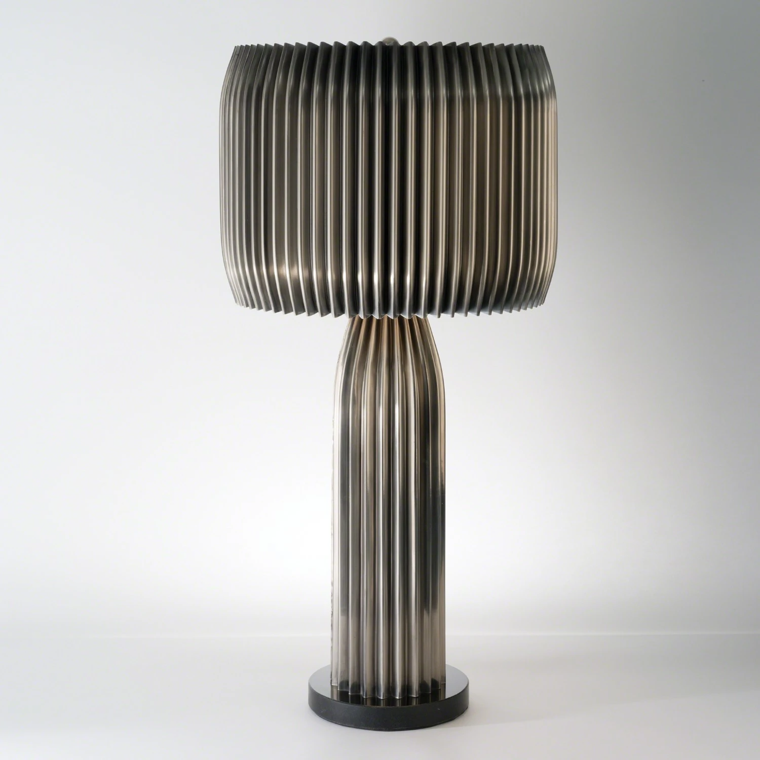 A striking hand-crimped steel base and matching shade give the Crimp Lamp its unique three-dimensional character. Available in both an antique nickel (as shown) and warm bronze finish, the piece is grounded by a granite base that adds depth and complements the delicate, geometric creases.