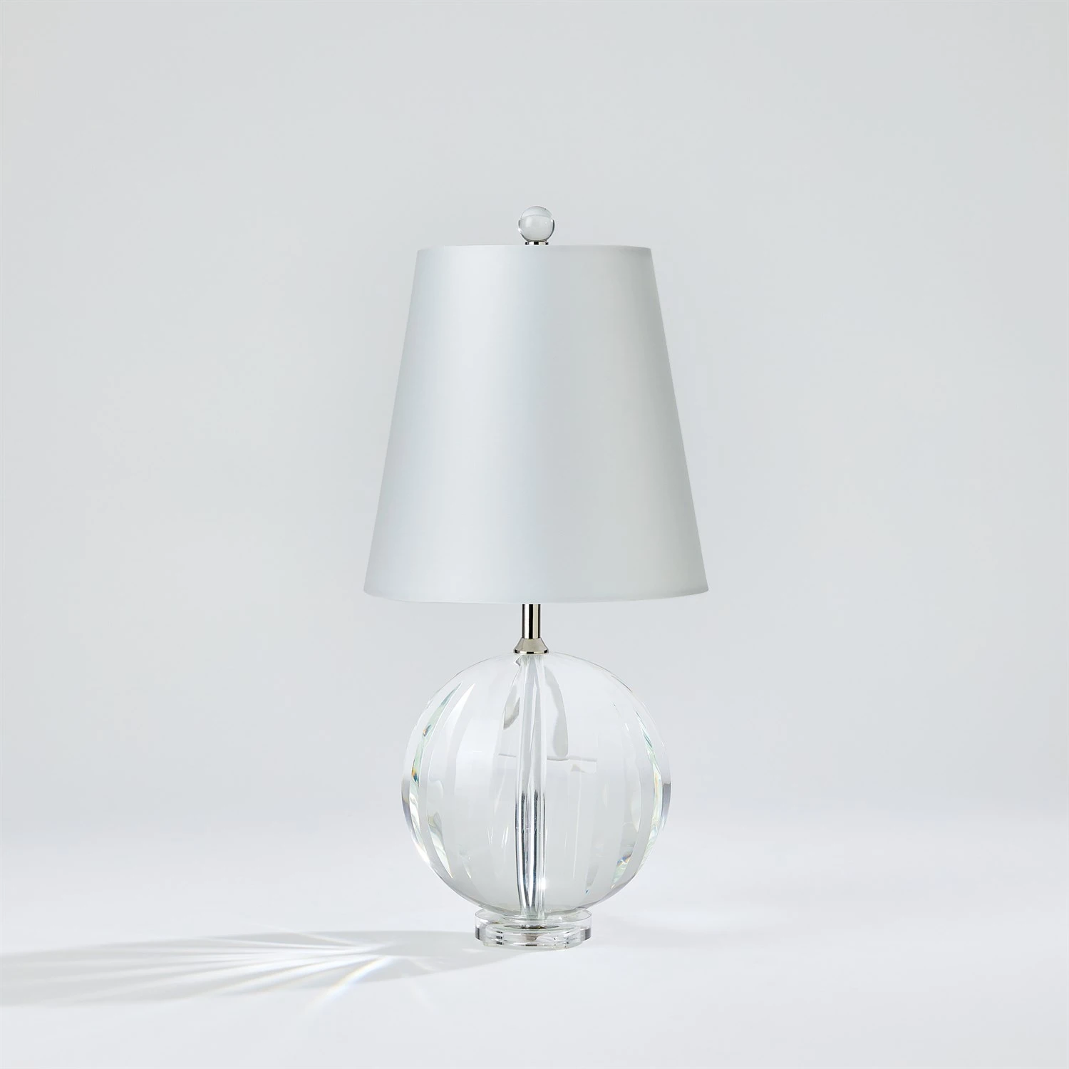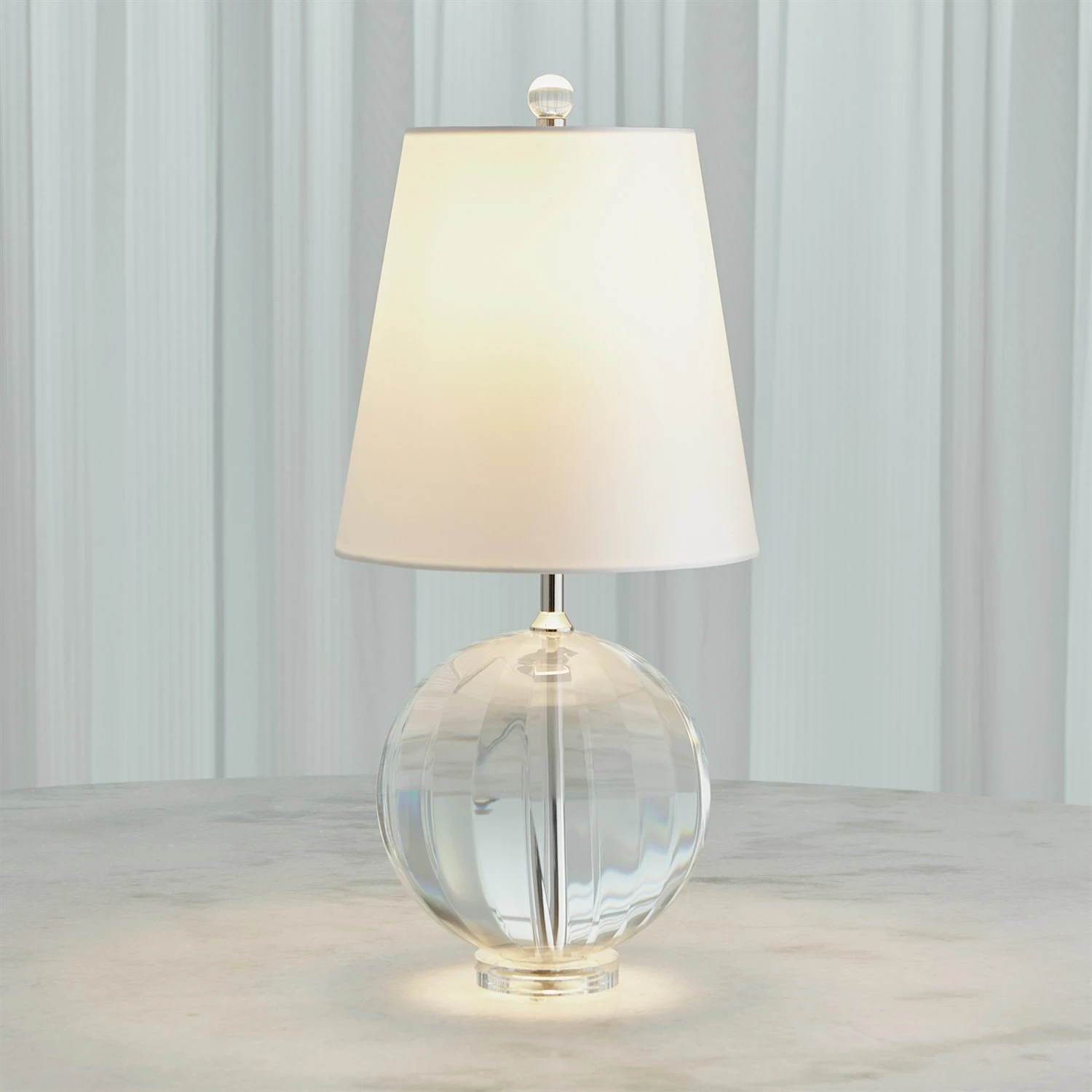 Our Crystal Faceted Lady Lamp is the perfect size for a bar or desk. Crafted from a crystal sphere faceted into form with a silk tapered shade.