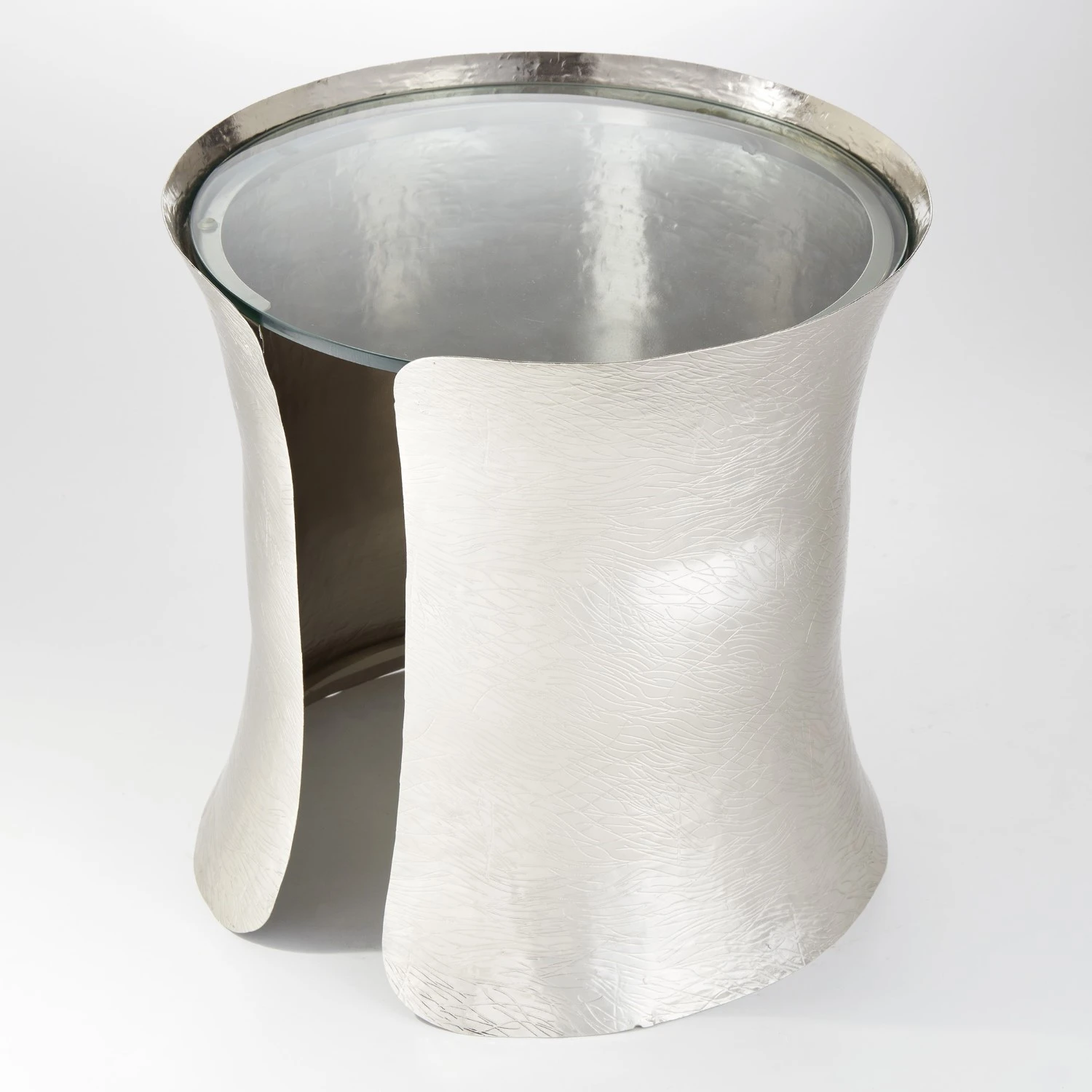 Inspired by your favorite basic wrist cuff. This scratched texture nickel plated table is jewelry for your room. Glass top. Adjustable glides