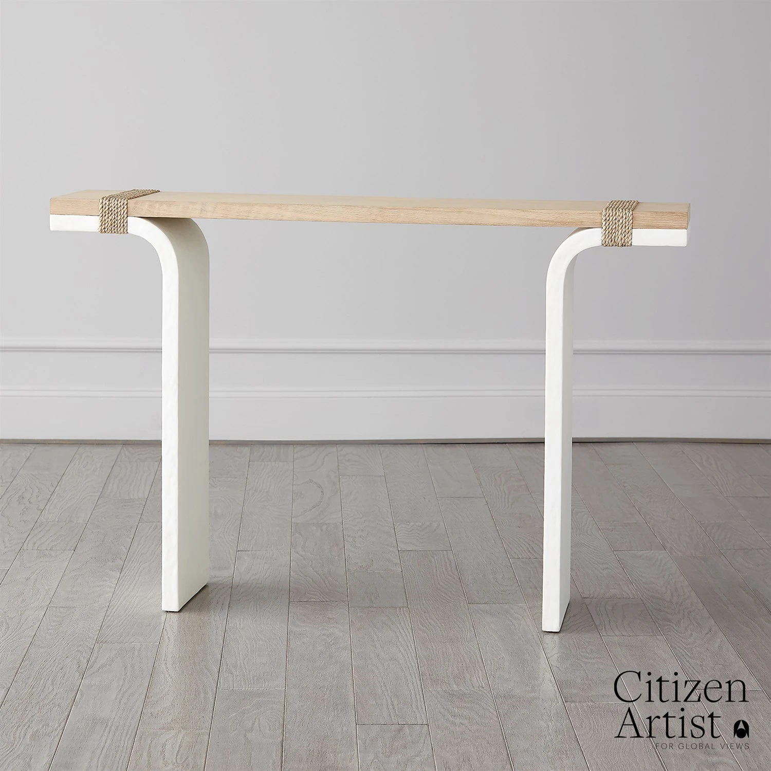 Organic abacca binds the white oak top to the gentle curves of the gesso legs of the Debby console. An expression of easy sophistication that draws inspiration from simple Japanese furniture forms and classic Belgian materiality, the Debby is at home in any environment.