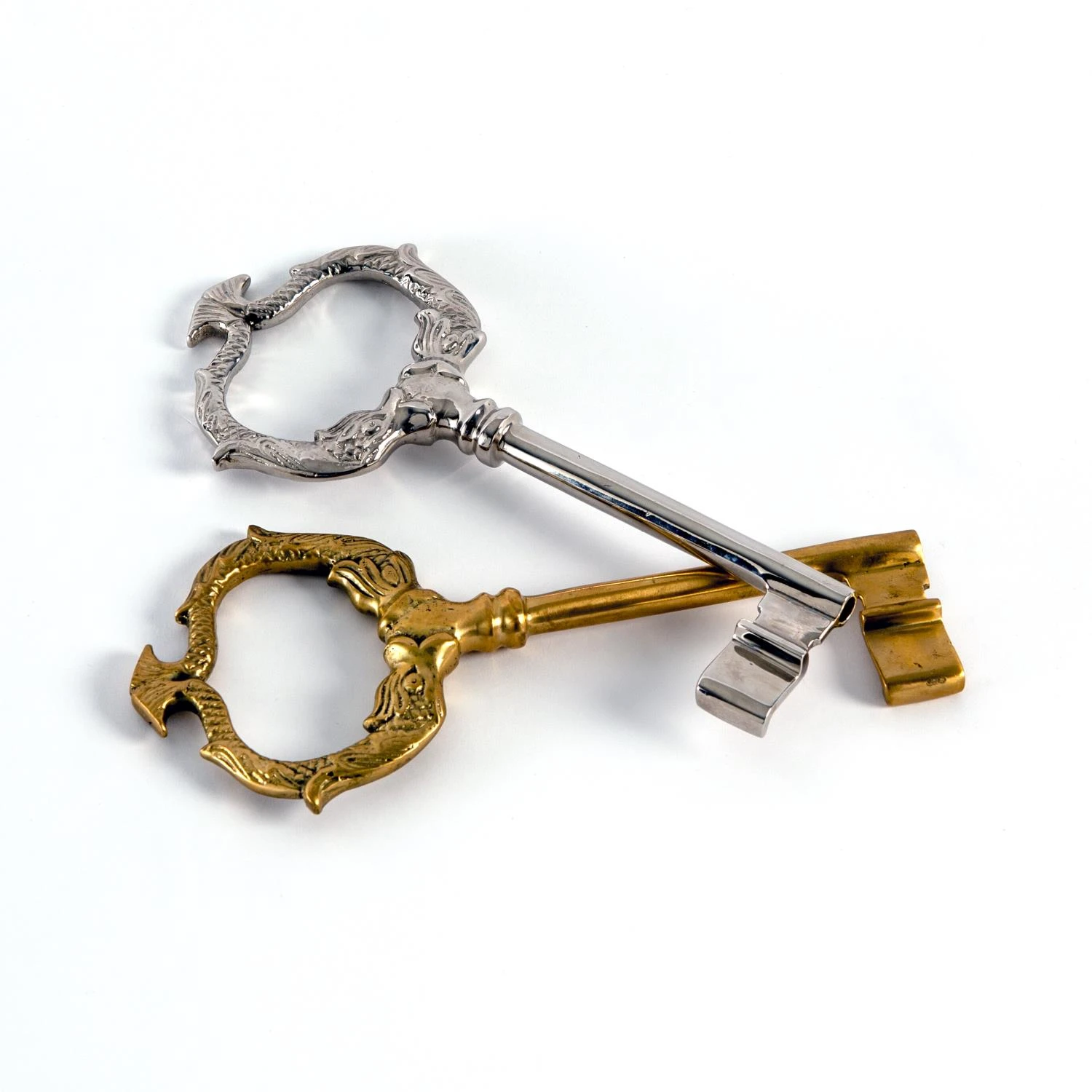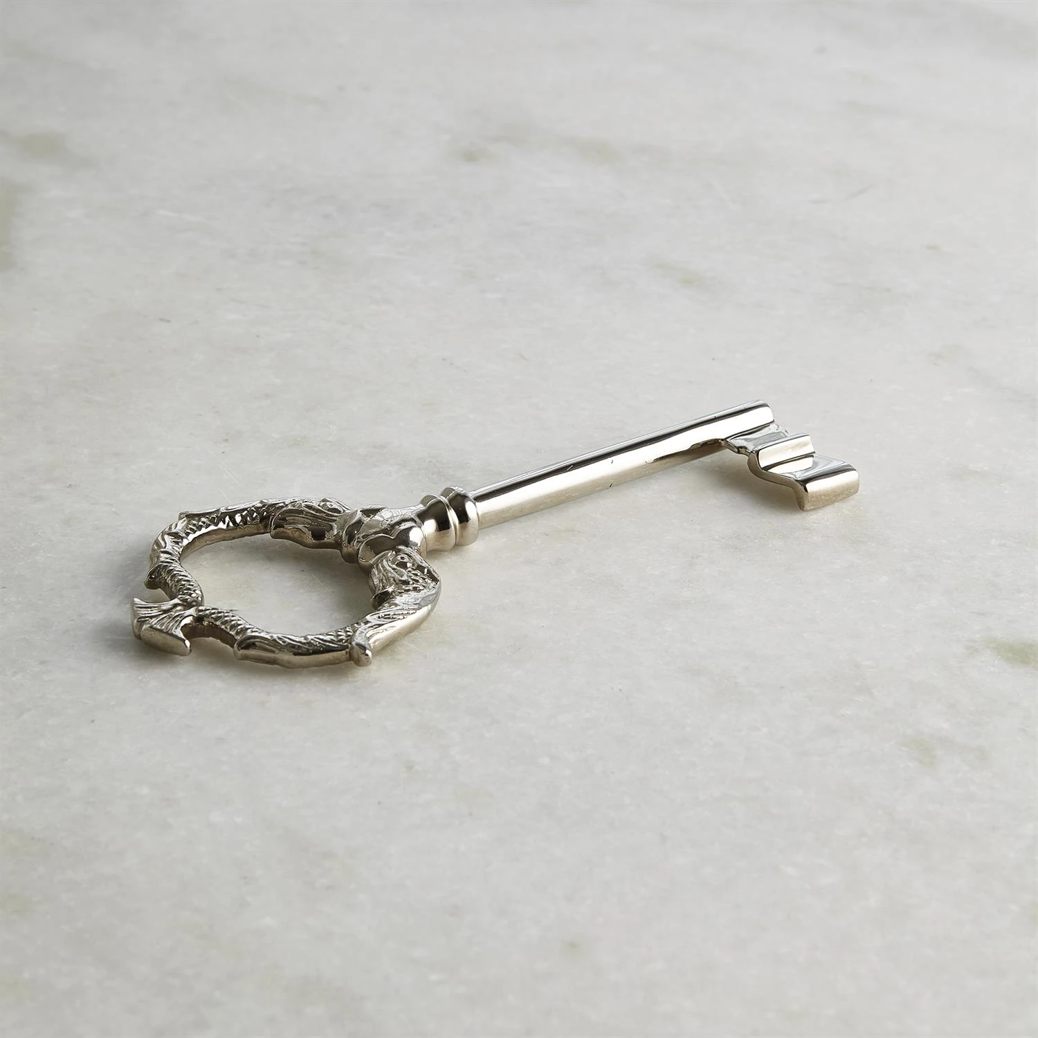 This solid brass key with a nickel finish features a handle created by two Dolphins, meeting at the tail and the mouth.