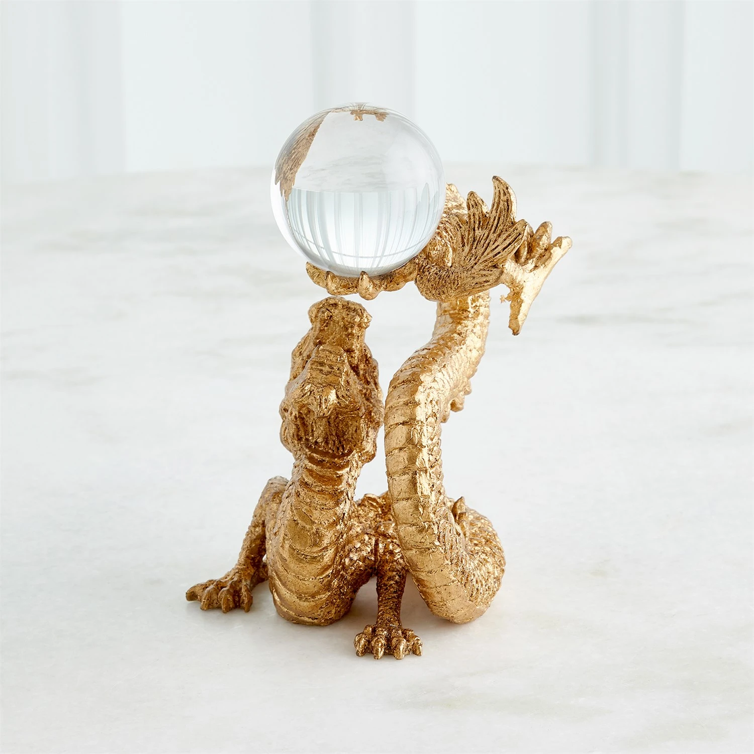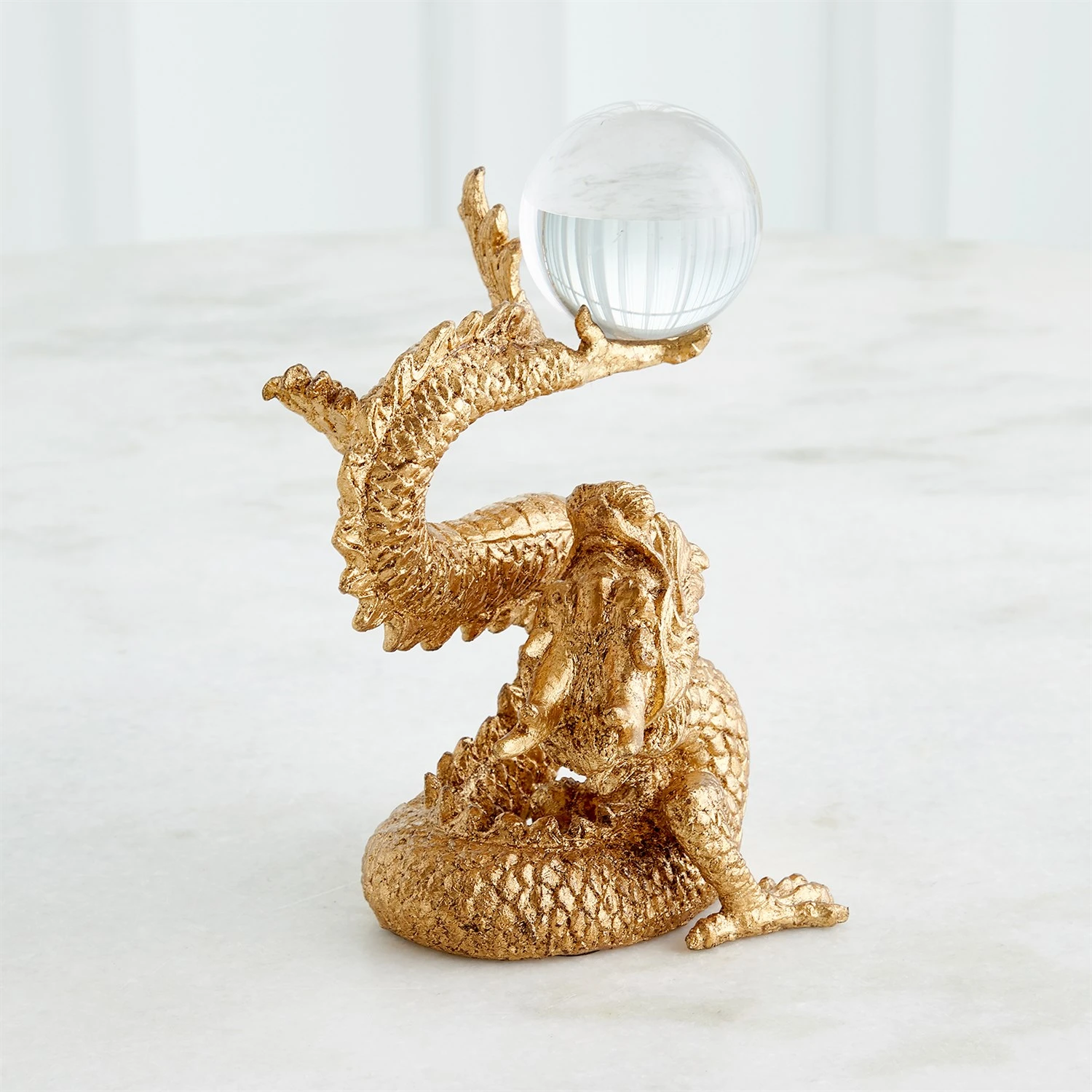 Based on a classic mythical good luck design, our Dragon sculpture is made of solid cast iron with a gold leaf finish and a crystal sphere. Please do not place in direct sunlight.