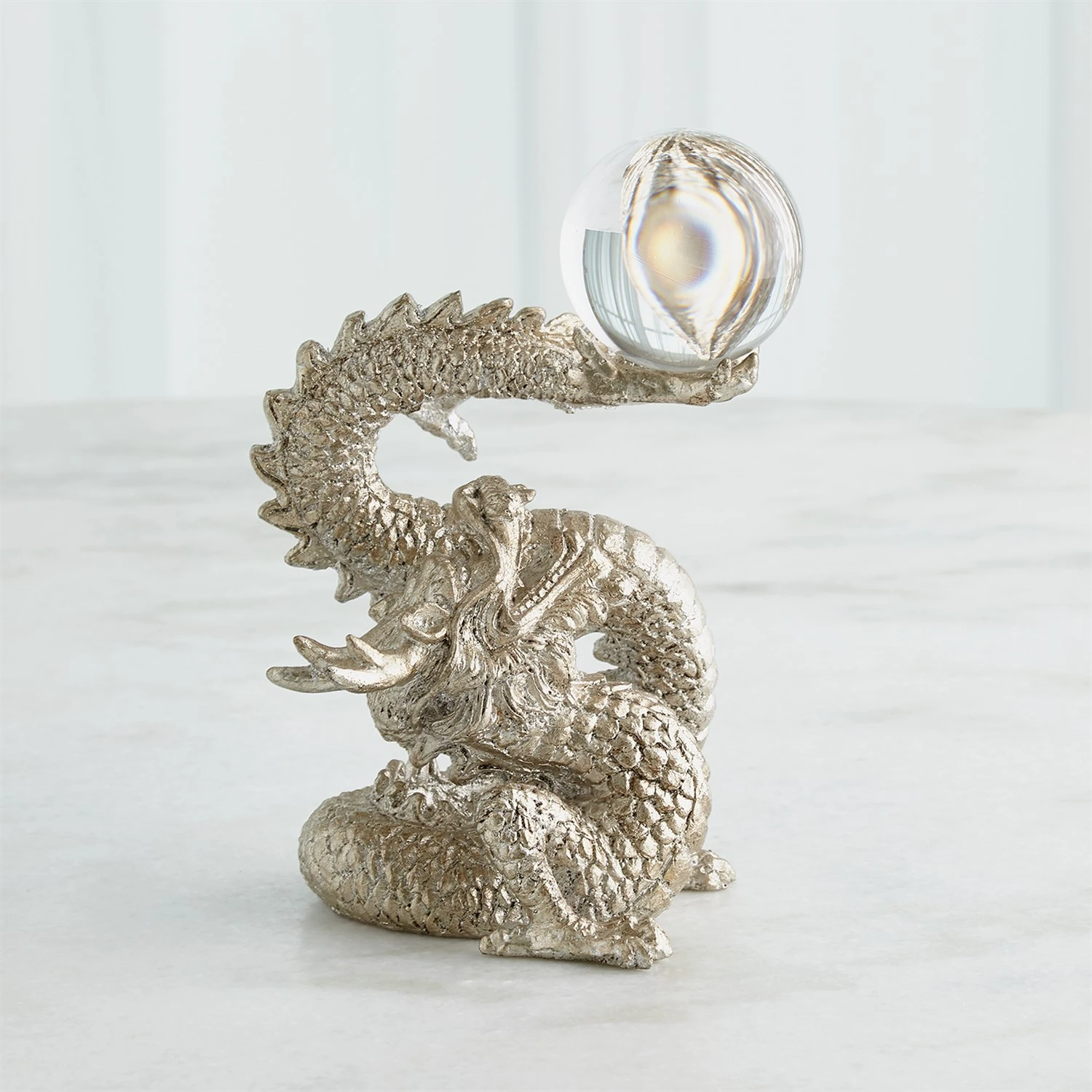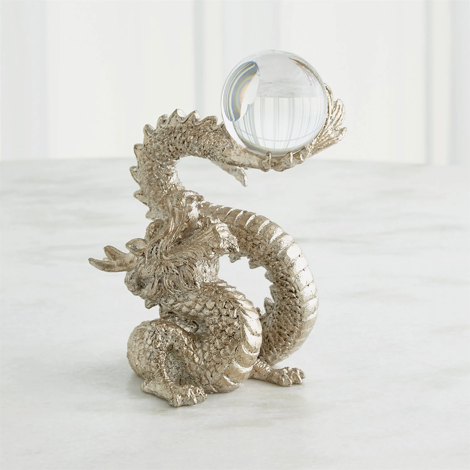 Based on a classic mythical good luck design, our Dragon sculpture is made of solid cast iron with a silver leaf finish and a crystal sphere. Please do not place in direct sunlight.