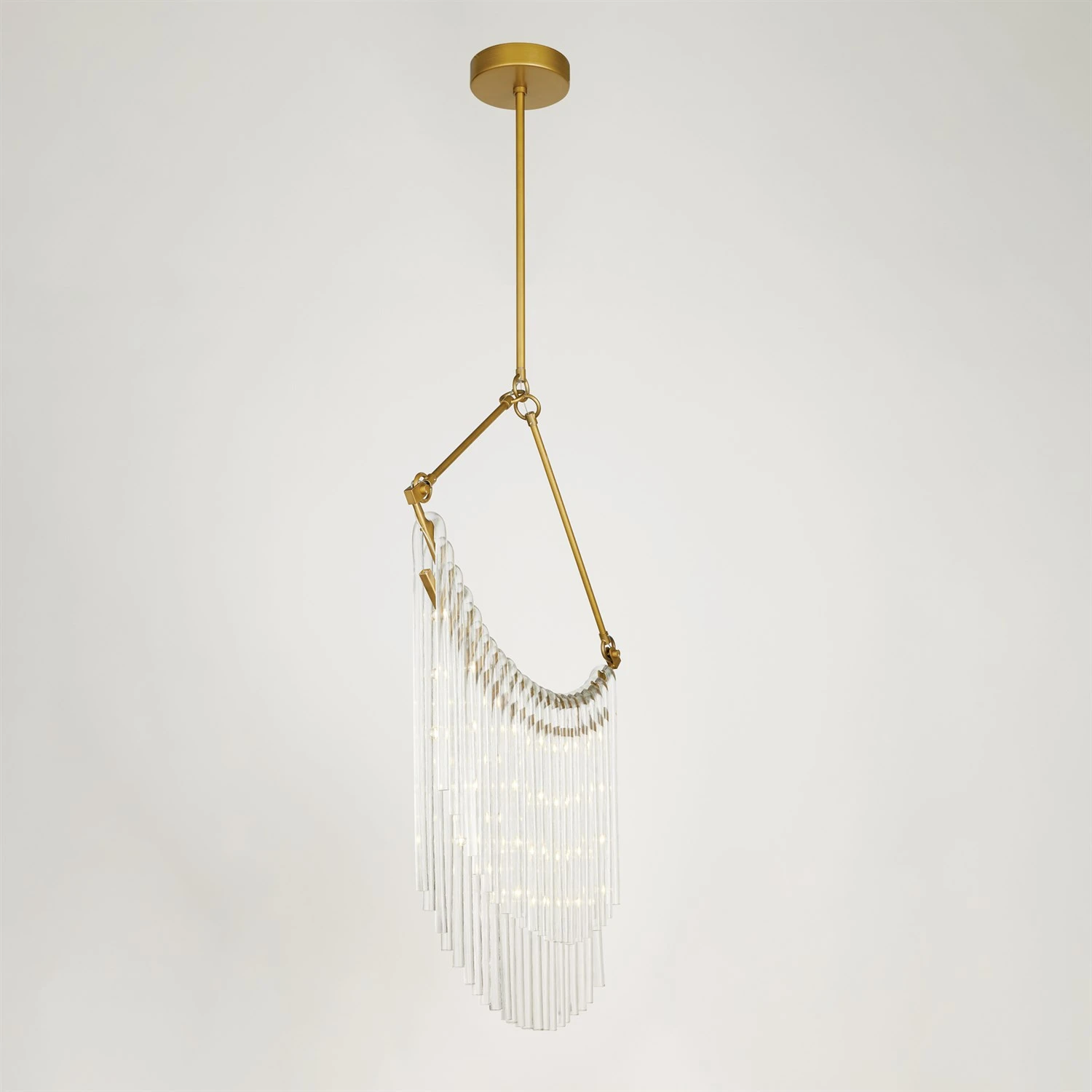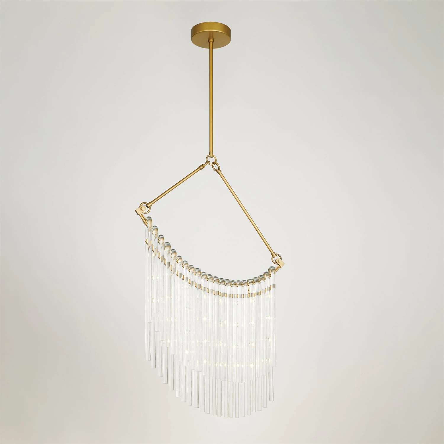 Hand-pulled glass rods elegantly drape over a metal frame with an antique bronze finish, emulating the shape of wet silk fibers drying on a rack. The geometry of the frame creates a modern form contrasted with the old-world charm of glass and warm dimmable LED light.