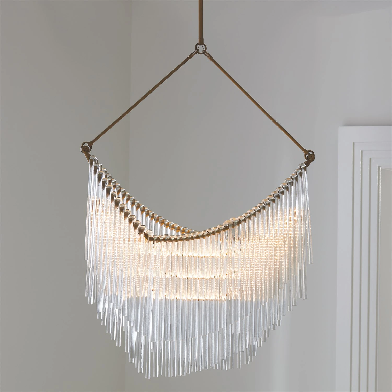 Hand-pulled glass rods elegantly drape over a metal frame with an antique bronze finish, emulating the shape of wet silk fibers drying on a rack. The geometry of the frame creates a modern form contrasted with the old world charm of glass and warm dimmable LED light.