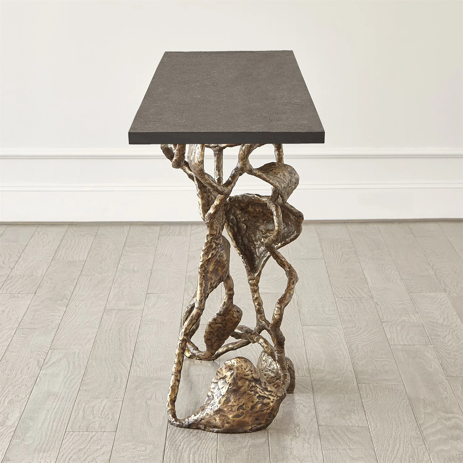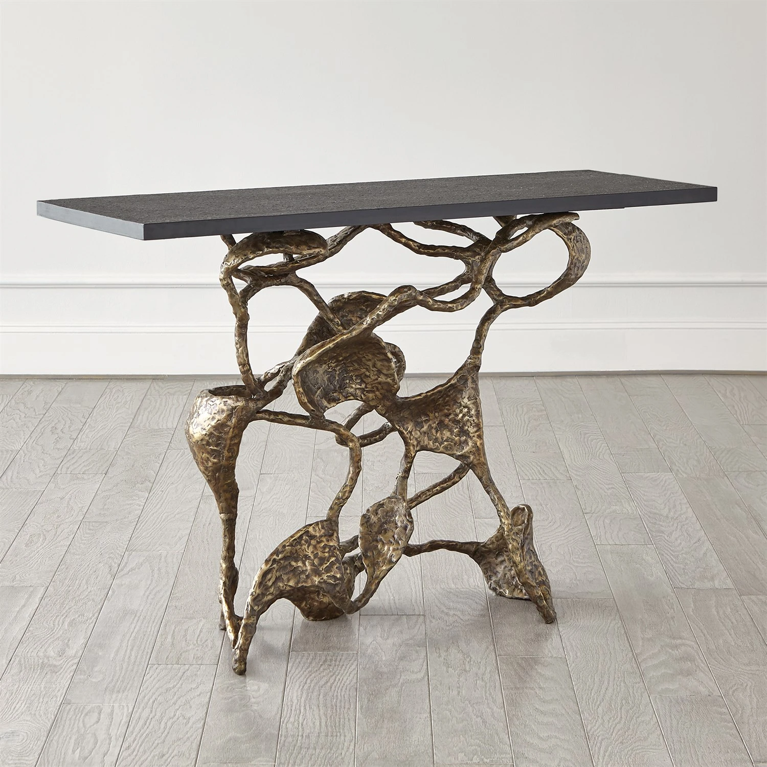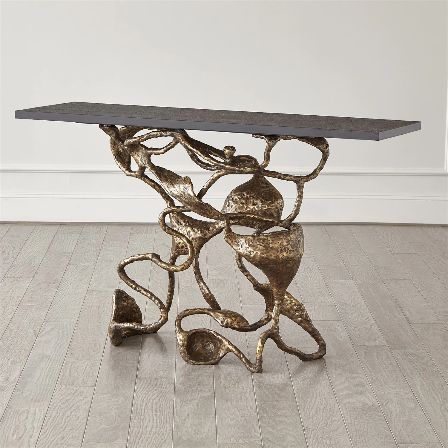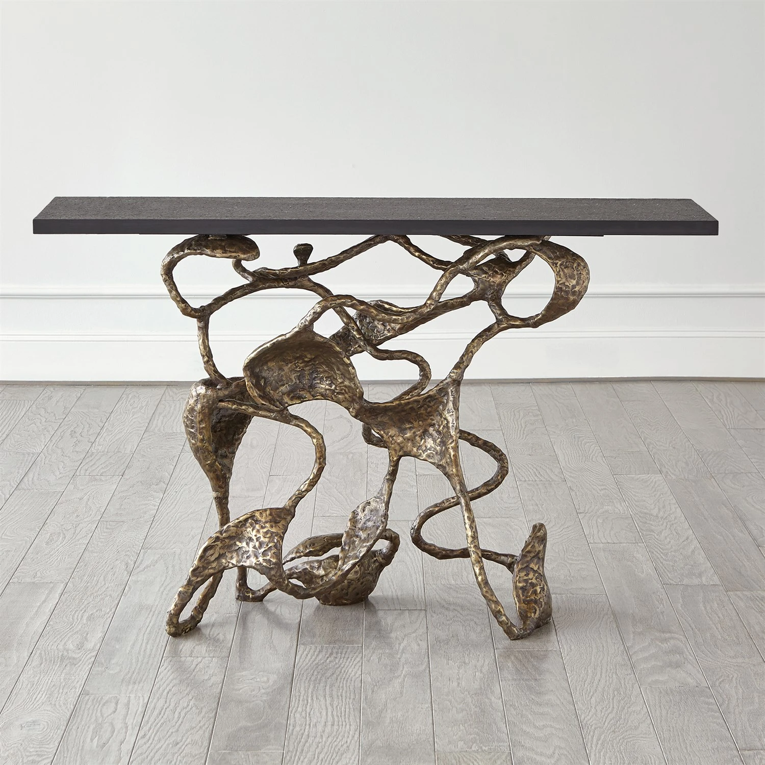 The sinewy connections of the Drift Collection bring to mind the complexity of a neural network. Sand cast in iron, the welded assembly has a hand-applied painted finish with a flamed textured black marble surface.