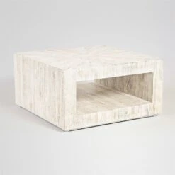 The Driftwood Coffee Table is a stylish and unique piece of furniture, handcrafted from individual strips of mango wood with a modern silhouette and a white finish. This combination creates a contemporary and natural look, making it a versatile addition to different interior decor styles.