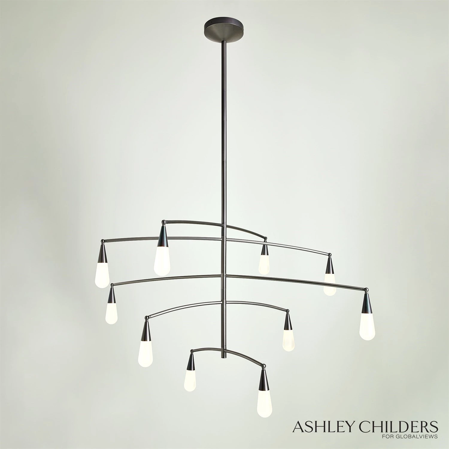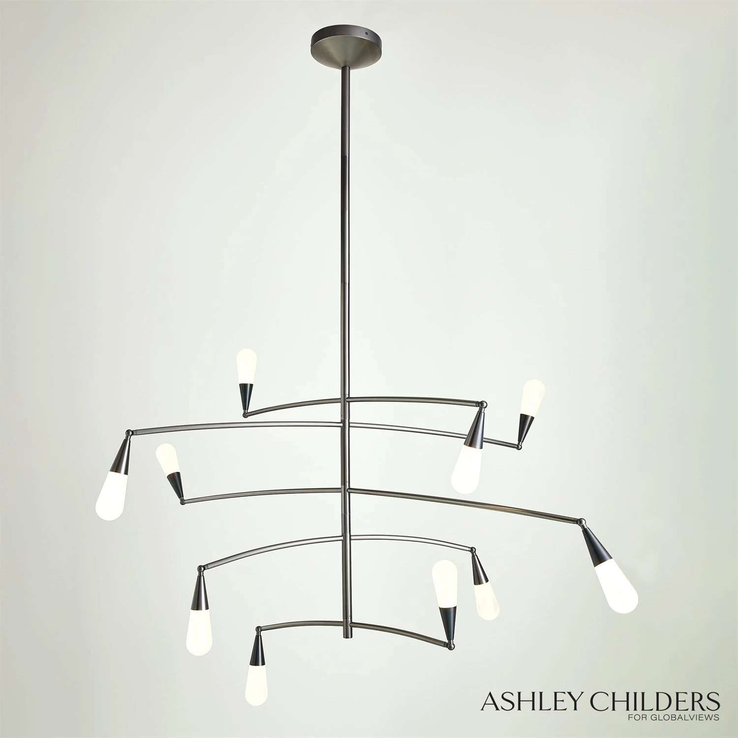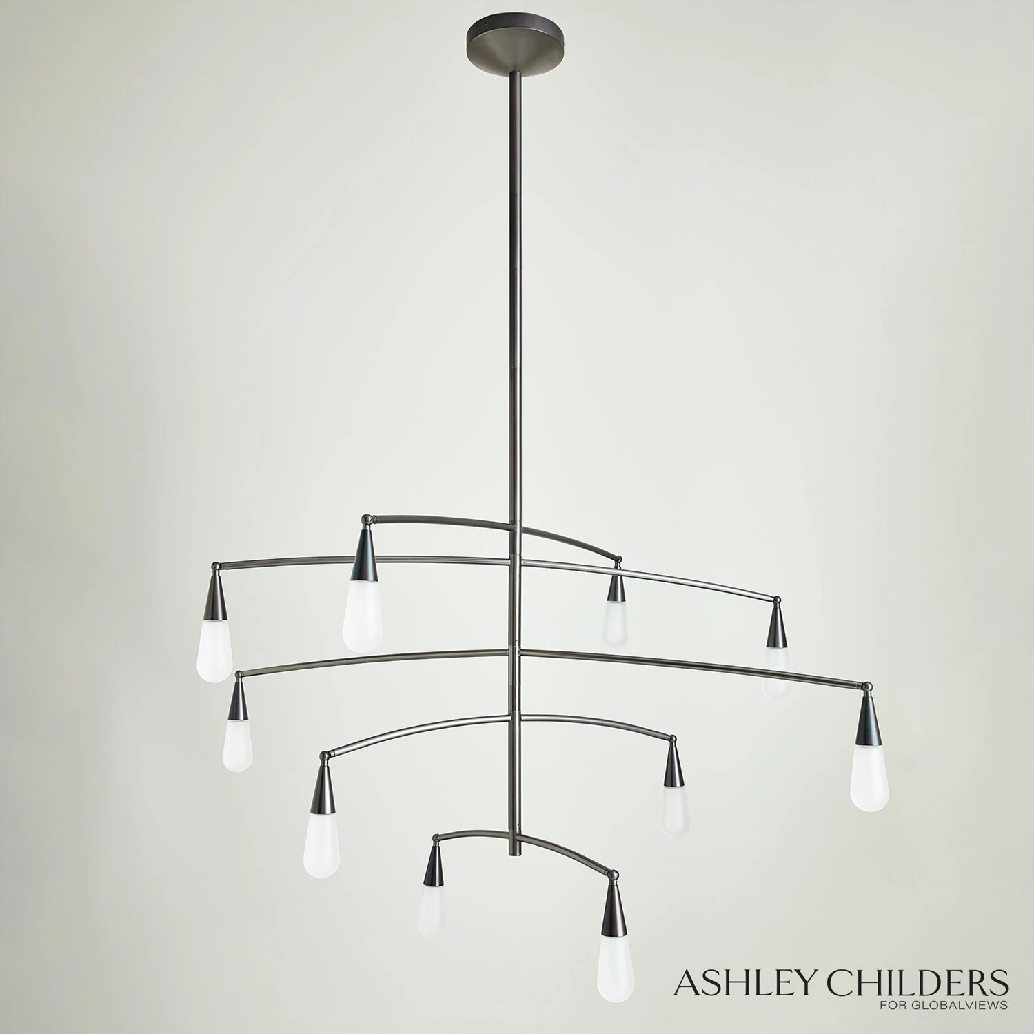 The soft glow of diffused light permeates the milky matte glass of our Droplet Chandelier. A modern articulated body cast in blackened nickel can be moved into various configurations, creating a customized and artful lighting sculpture.