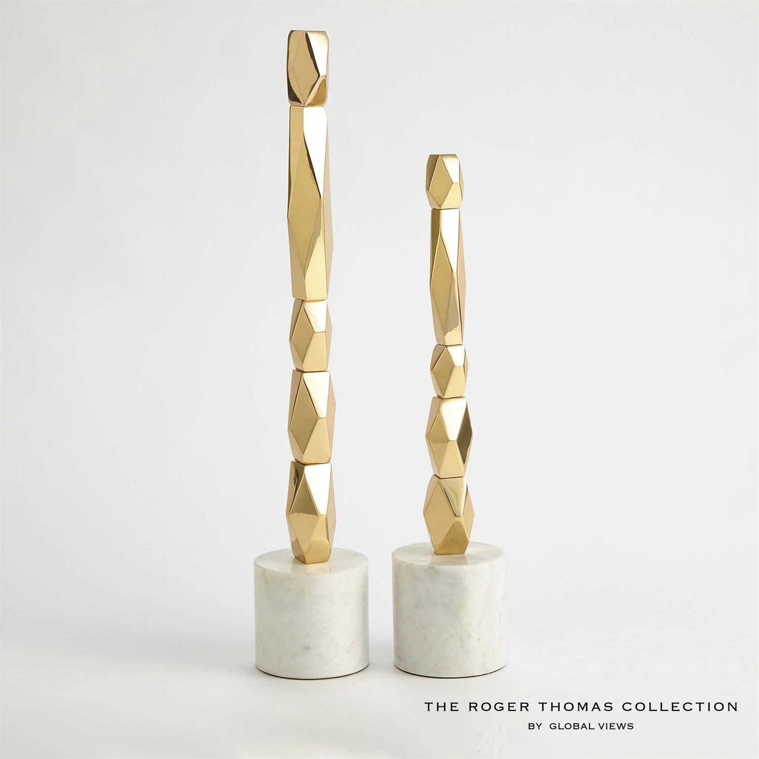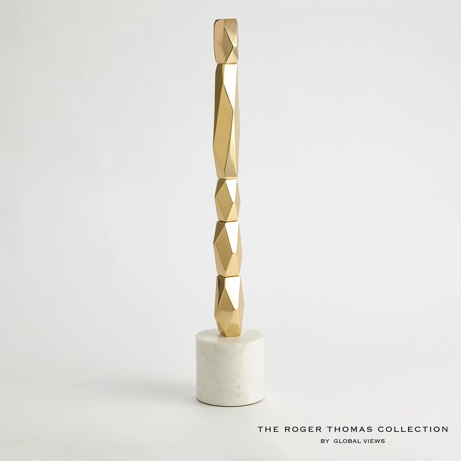 Our Facet Block Sculptures are created with stacked, faceted pieces of brass to create a stunning accent piece. White base made of naturally quarried marble, veining and color variations may occur.