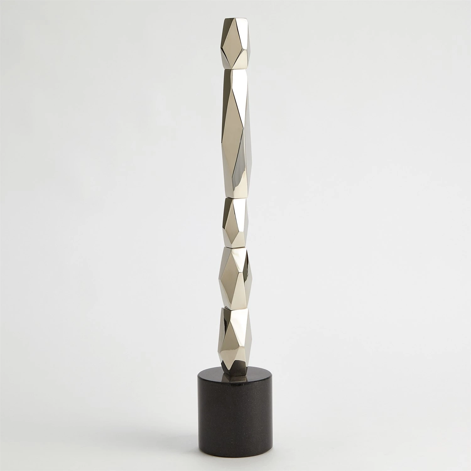 Our Facet Block Sculptures are created with stacked, faceted pieces of nickel-plated brass to create a stunning accent piece and a true statement. Black base made of black granite, veining and color variations may occur.