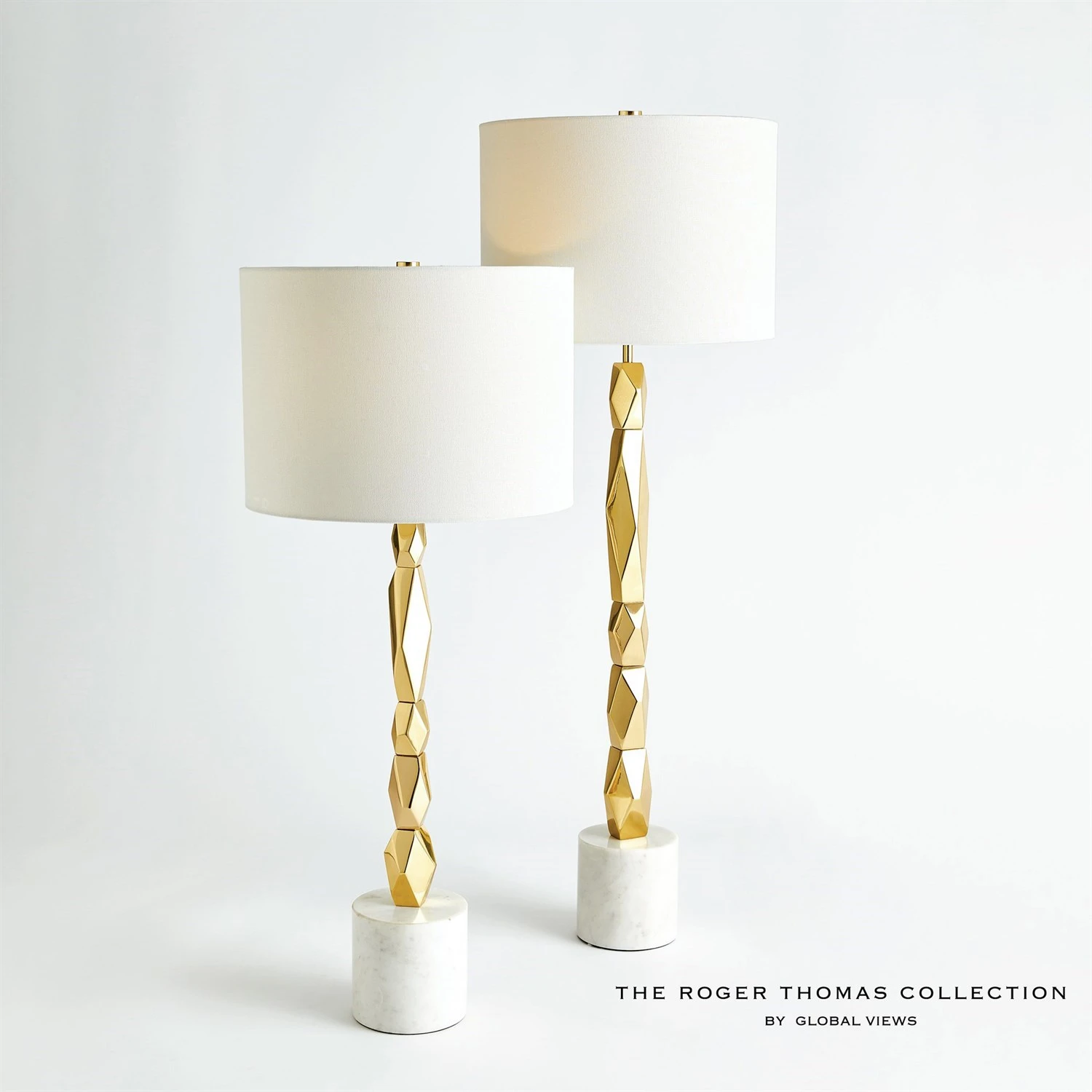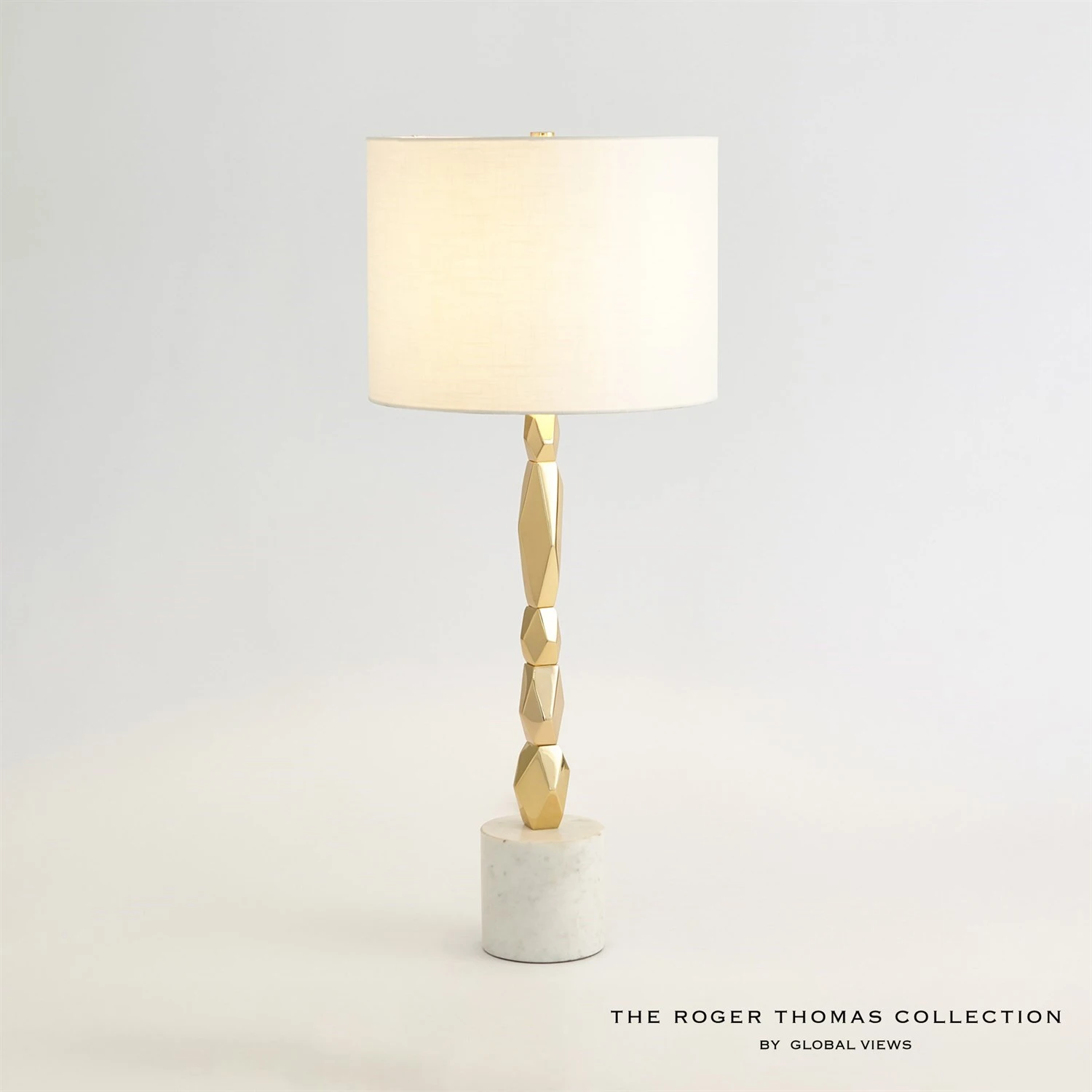 Our Facet Block Table Lamps are created with stacked, faceted pieces of brass to create a stunning accent piece. White base made of naturally quarried marble, veining and color variations may occur.