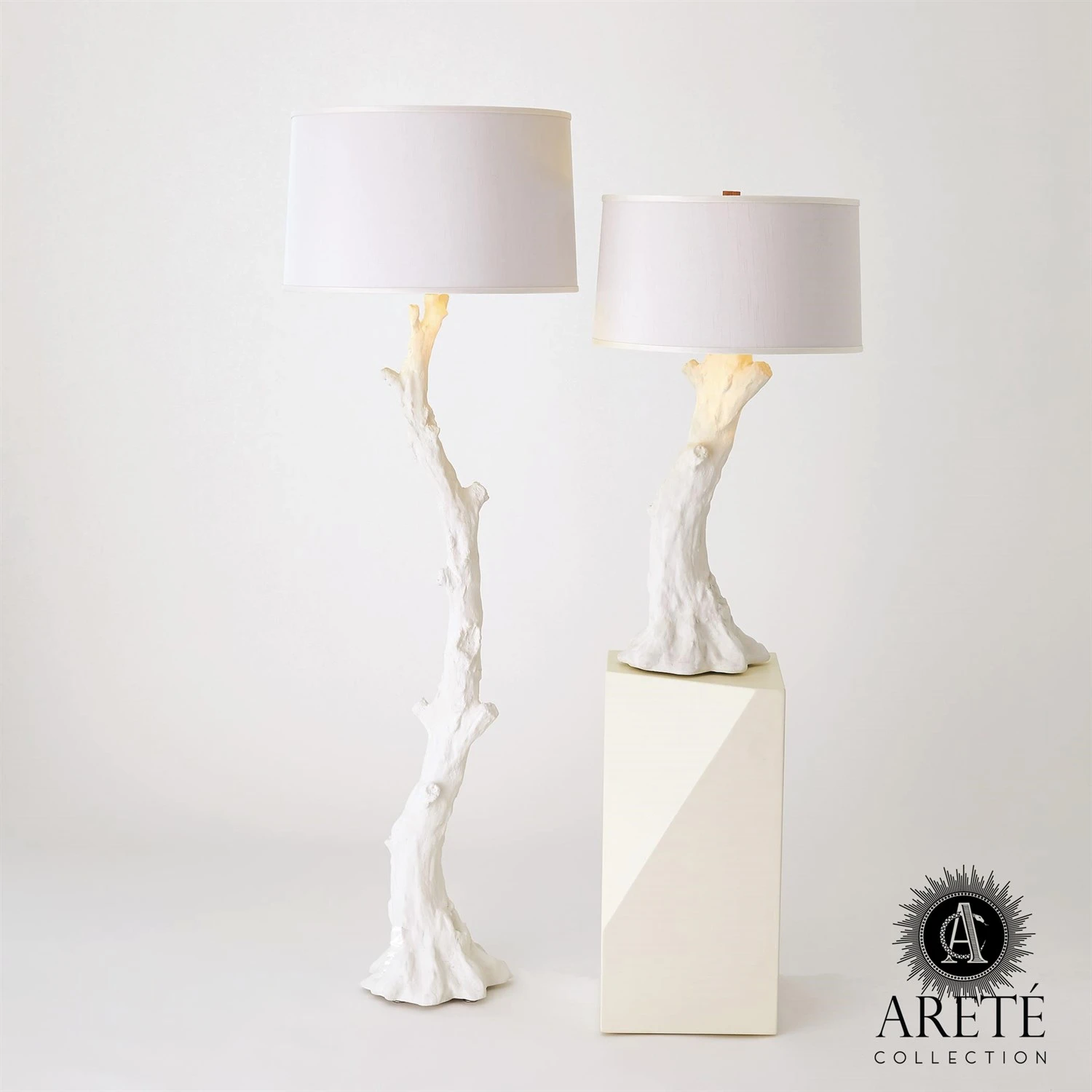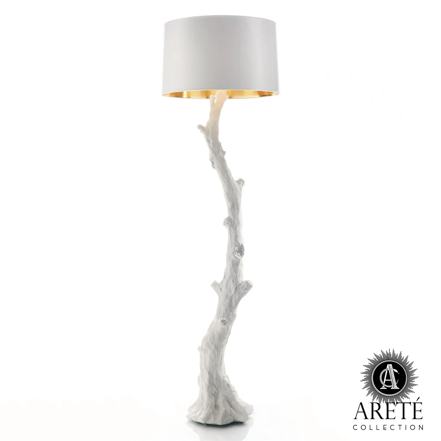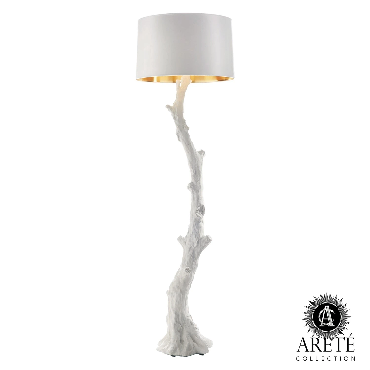 The Faux Bois collection was inspired by the natural growth patterns of the twisted juniper and the Crepe Myrtle. Each piece is an artist’s interpretation, sculpted originally in clay. The Faux Bois Floor Lamp is hand cast resin with a flat white finish. Brass hardware with 3-way socket. Comes with a white faux silk shade with gold lining.