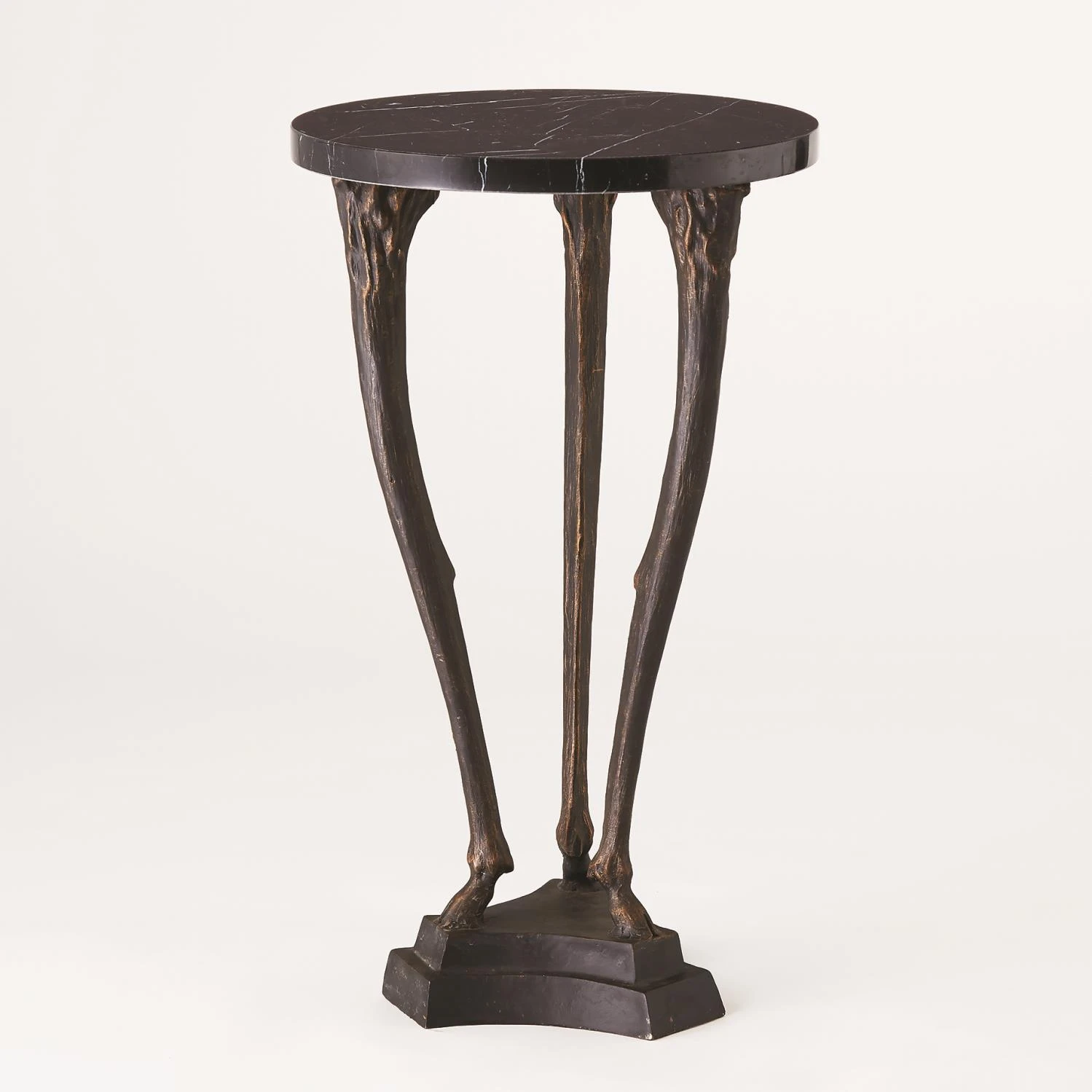 A hand carved plaster original, from the archives of George Sellers, started the development of this delicate, yet sturdy table. The legs and tri-corner base are made from sand cast iron. A dark bronze finish is applied to the base and legs with a slight golden highlight on the edges and raised areas. Topped with a black marble round top.