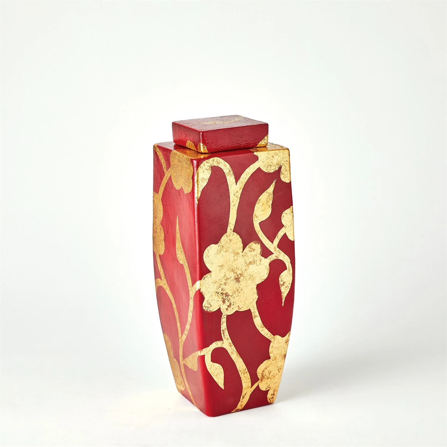 Gorgeous slip-molded Italian ceramic vases with a deep red finish and hand-painted gold floral designs.