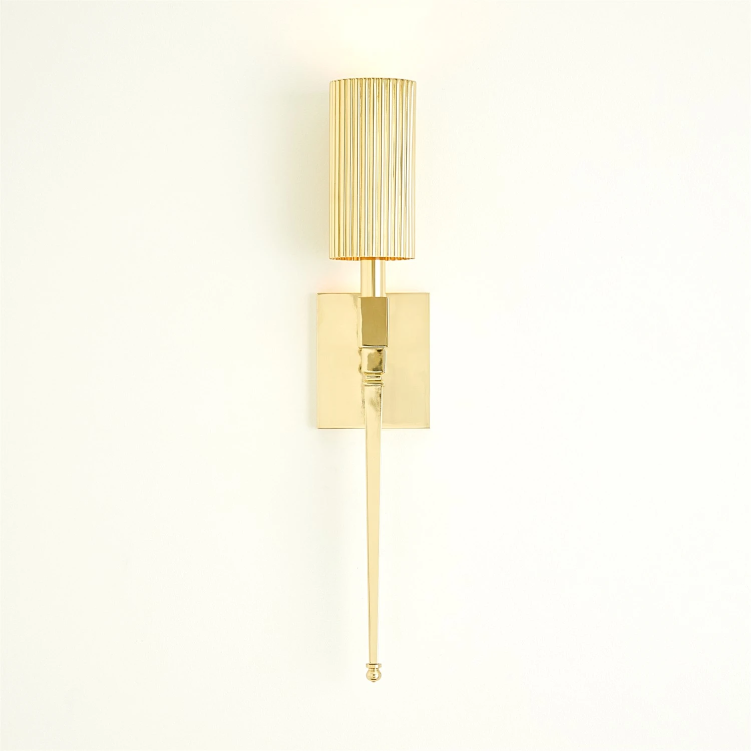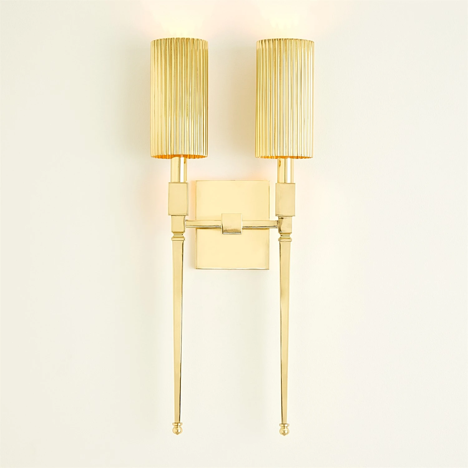 The Fluted Double Sconce presents a timeless torchiere silhouette, elegantly crafted from brass with a gleaming shiny brass finish. Illuminate your space with the perfect blend of classic design and contemporary charm.
