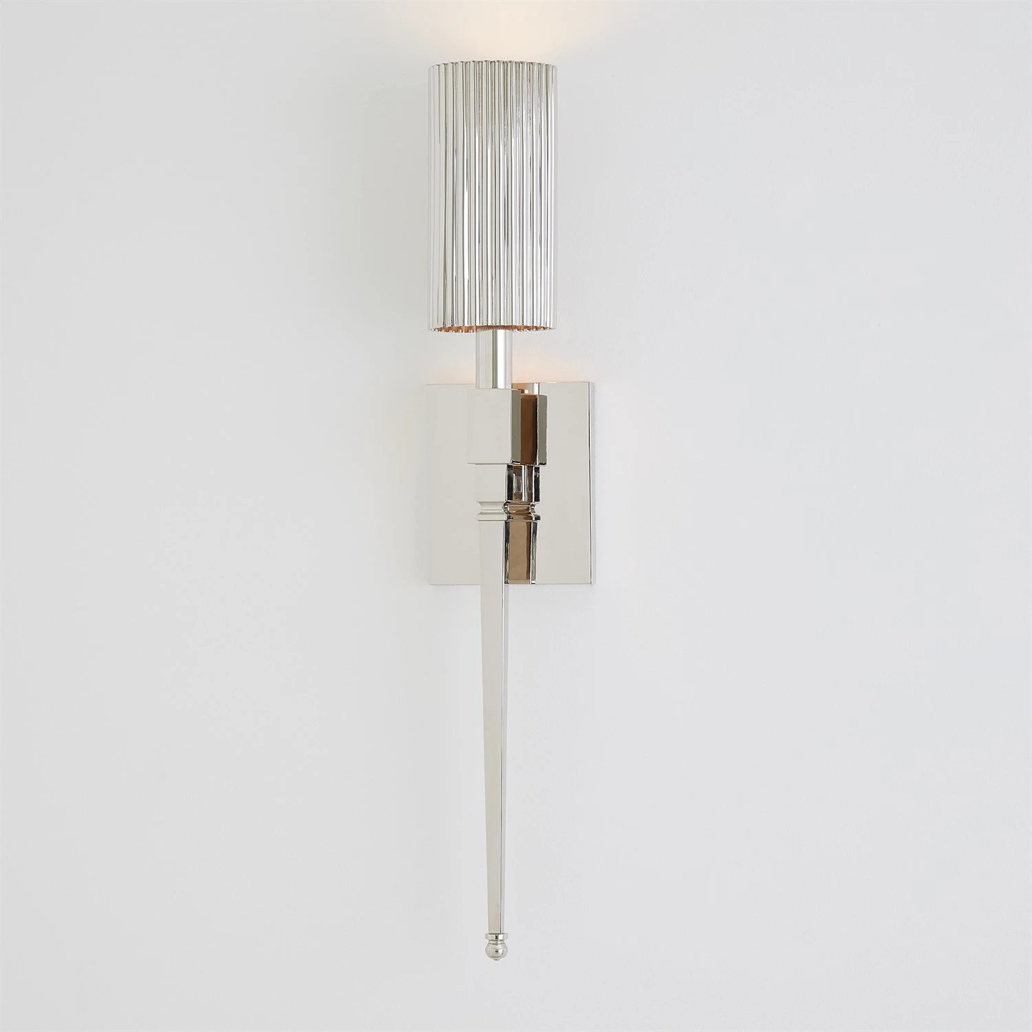 The Fluted Single Sconce presents a timeless torchiere silhouette, elegantly crafted from brass with a gleaming shiny nickel finish. Illuminate your space with the perfect blend of classic design and contemporary charm.