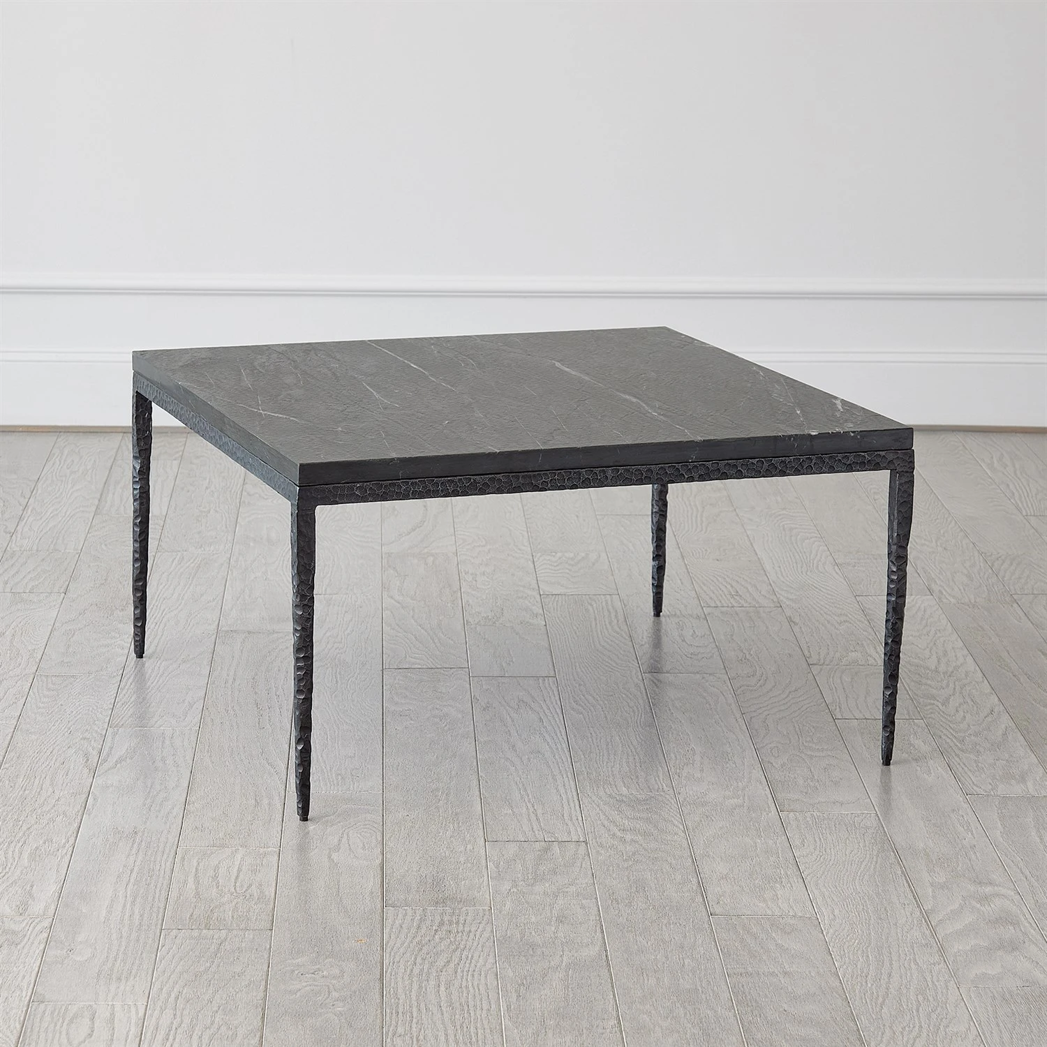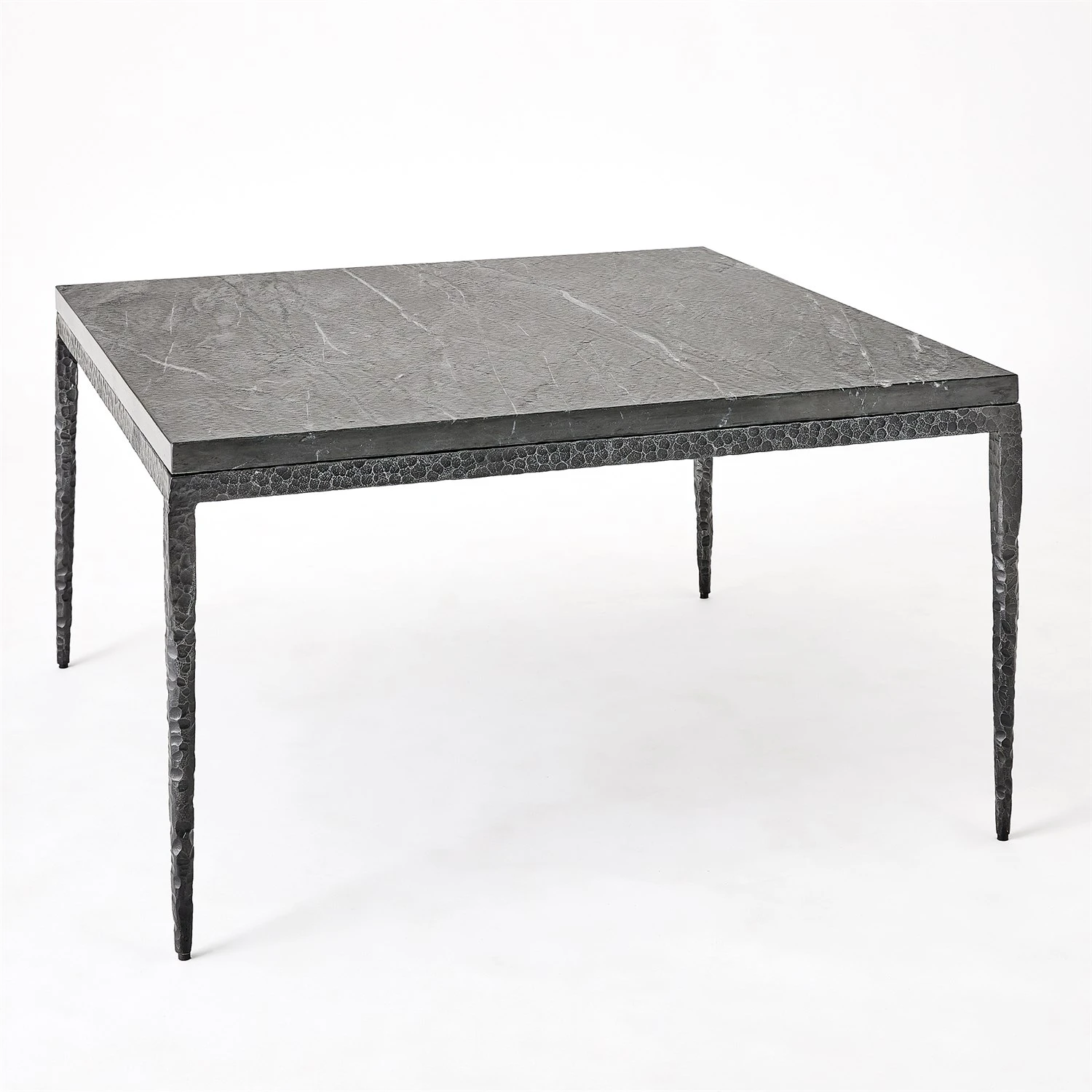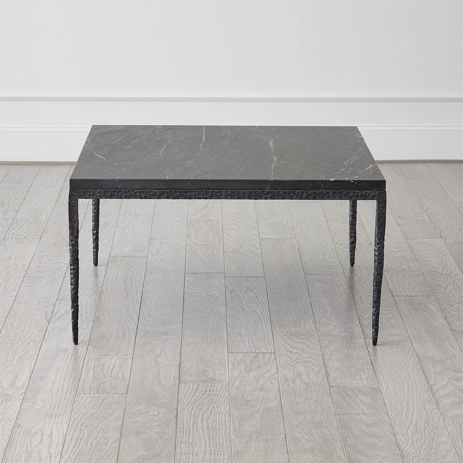 Hand-forged from hammered iron, the Forrester Collection showcases an antique gunmetal finish and boasts a bold flamed black marble surface, adding character and style to any space. As marble is a natural product, please be aware that there will always be variations in veining and color. This is to be expected and makes every marble product uniquely your own.
