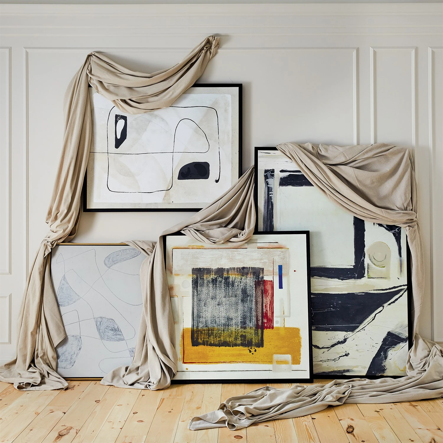 These beautiful paintings were created in-house for Global Views by our Creative Director, Mr. George Sellers and designer, Mr. Ely Sellers. They are reproductions of hand painted originals that were done on a coarse weave proprietary canvas. Framed in a very simplistic 1/2 inch thick by 1 inch deep matte black frame with a black reveal between the canvas and frame.