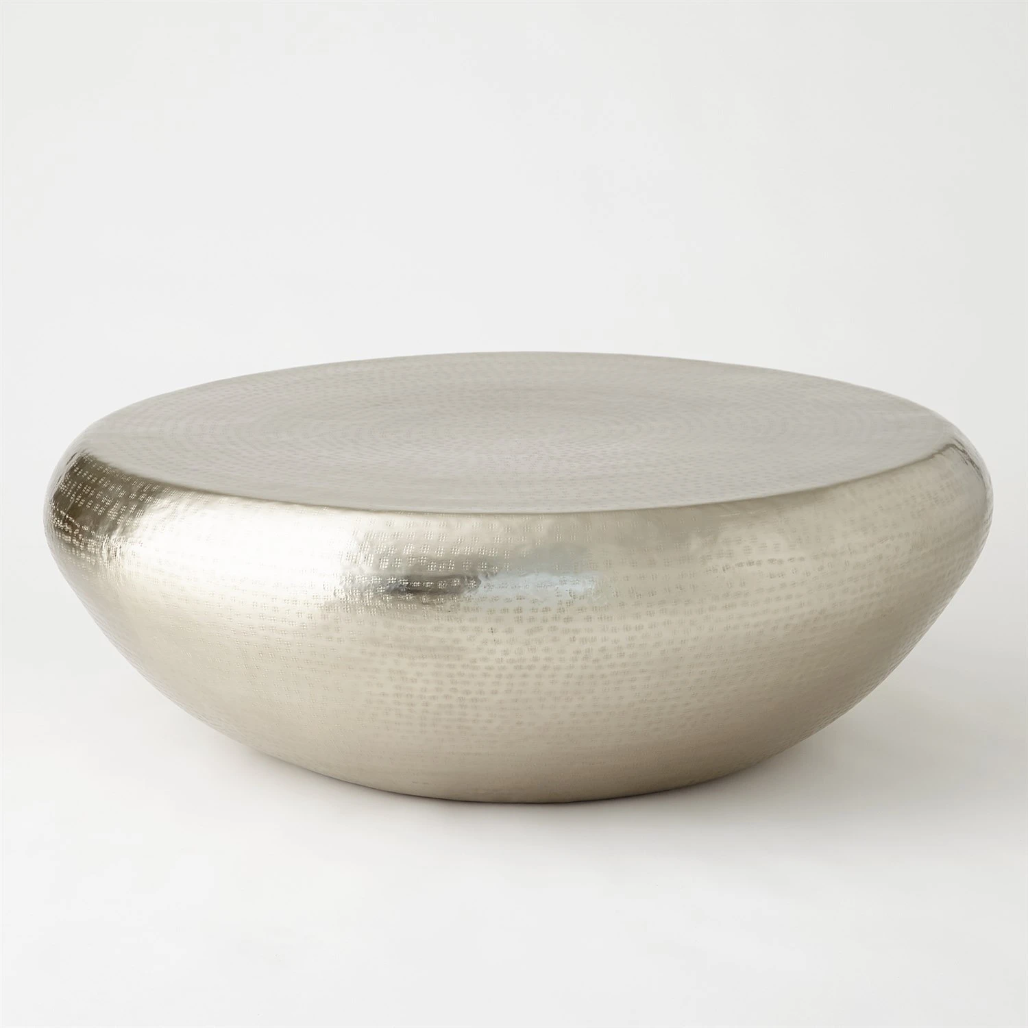 Hand hammering brings out rich detail of the nickel-plated solid brass sheet in the Goa Cocktail Table. The soft-curved rim is elegant and sophisticated. Available in two sizes in Antiqued Nickel or Antiqued Brass.