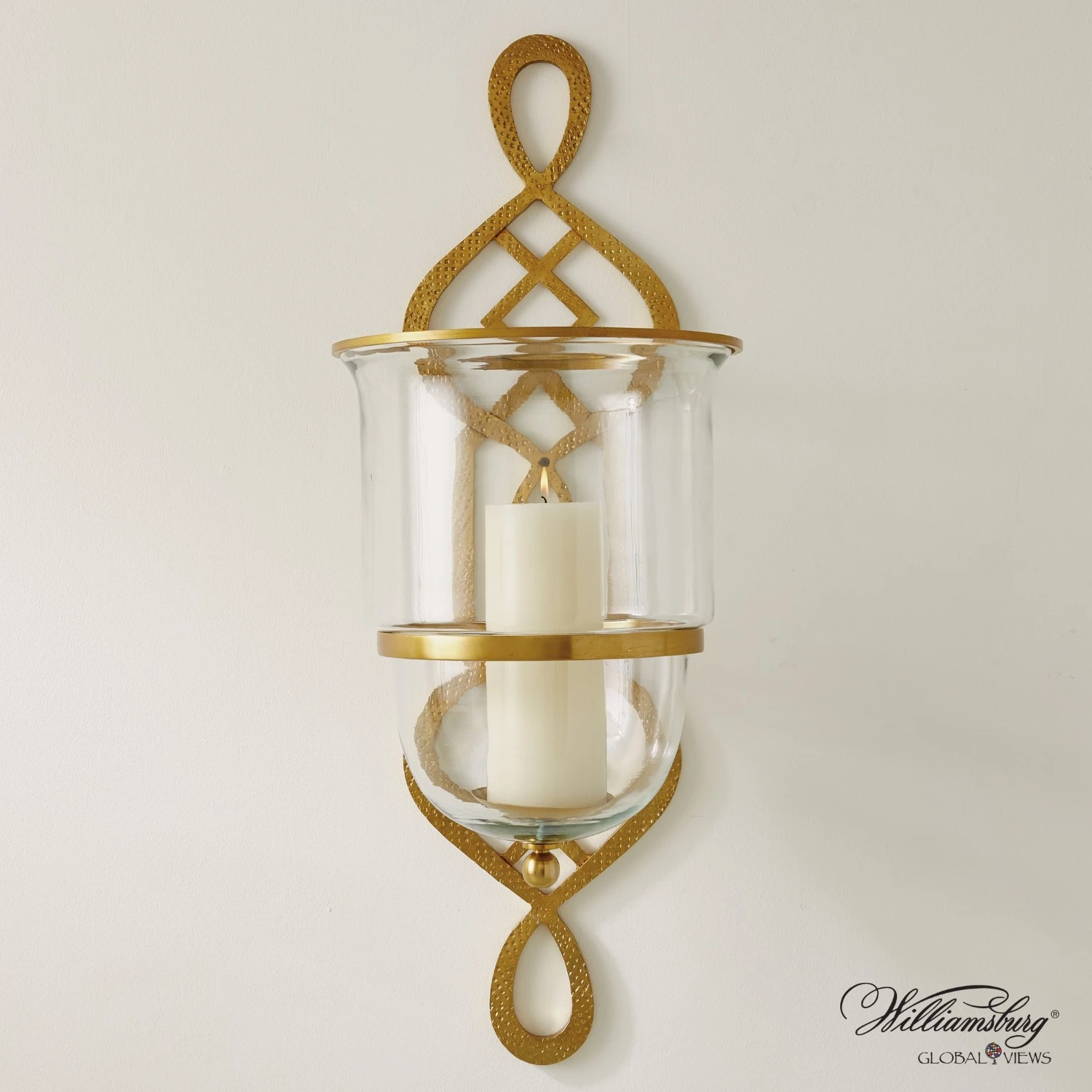 The Grande Fret Hurricane design was inspired by a wooden fret detail found in the crown of a tall dresser in the Williamsburg Museum collection. The shape of the fret was reinterpreted in hand forged iron. The Iron has a rich gold finish. The metal back is the perfect balance for the enormous hand blown hurricane.