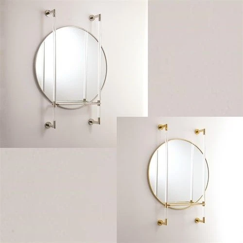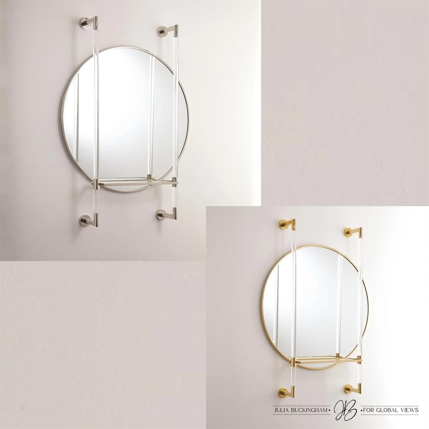 Well, hello gorgeous! Finding a home for this mirror and the coordinating acrylic rod with metal and glass shelf will be effortless. The brass finish on this wall mirror and functional shelf will style nicely in your city apartment, modern farmhouse, or your mountain getaway. Toss your favorite lipstick or keys on the adjustable shelf knowing that you can have it all.
