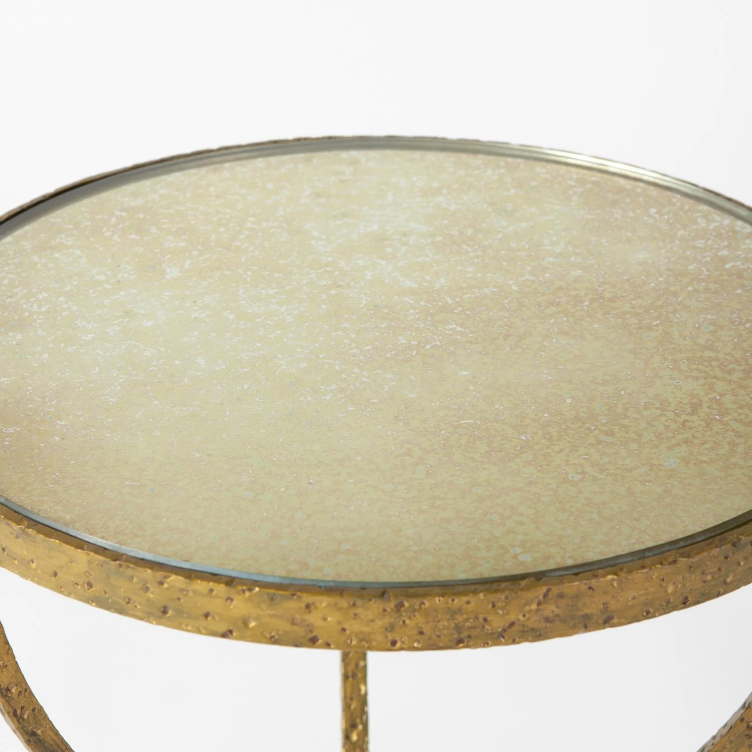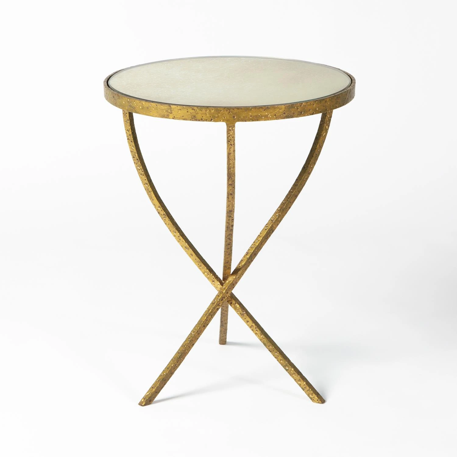 The frame of our Hammered Tripod Table is constructed of bent antique gold finished iron rods that crisscross at the bottom of the base. This exquisite base supports an antiqued mirror glass top.