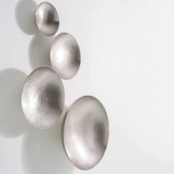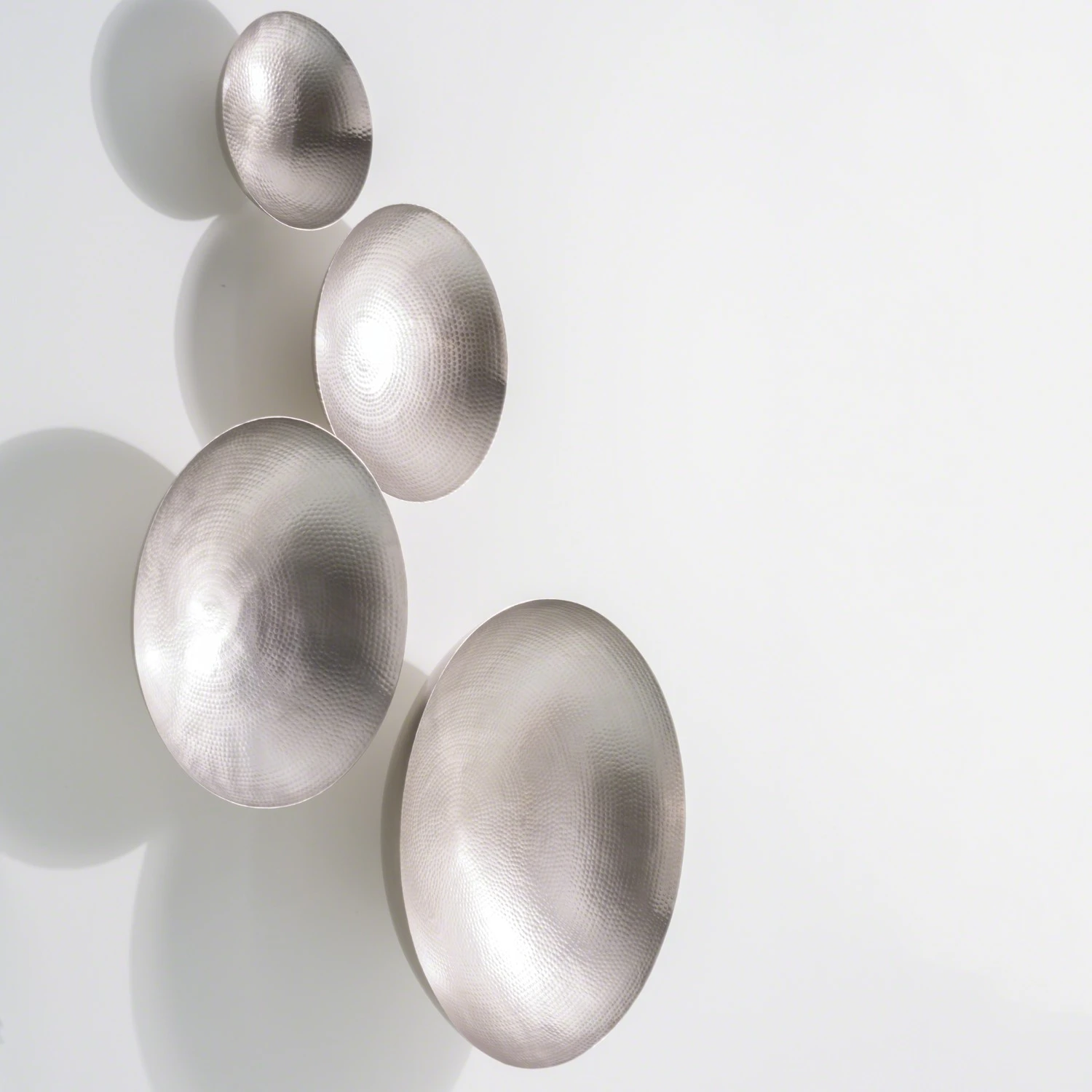 Hand-hammered brass wall decor complete with threaded hanging mechanism. The wall plate mounts with two screws. Antique Nickel finish. Also available in Antique Brass and Antique Copper finishes.
