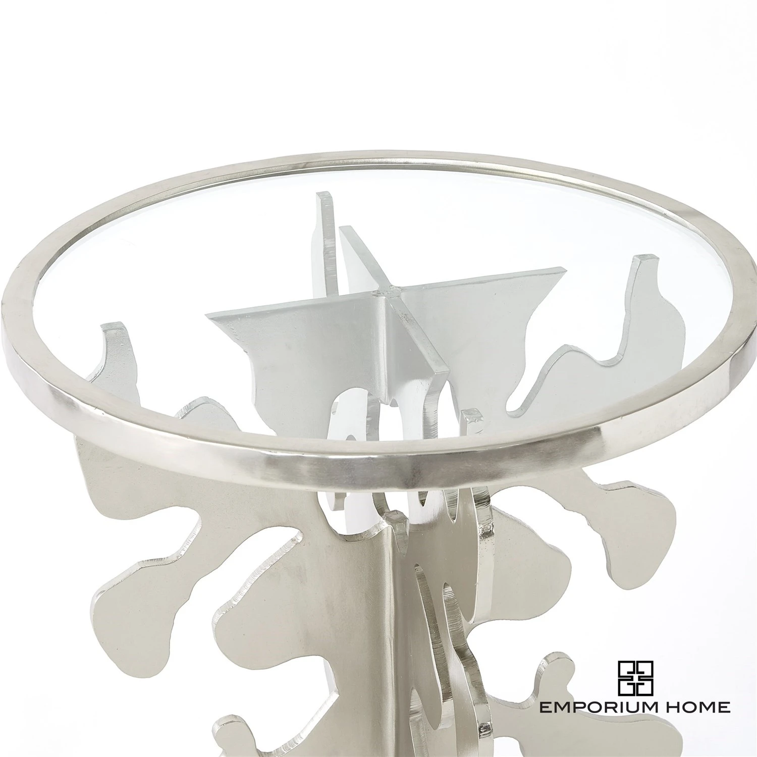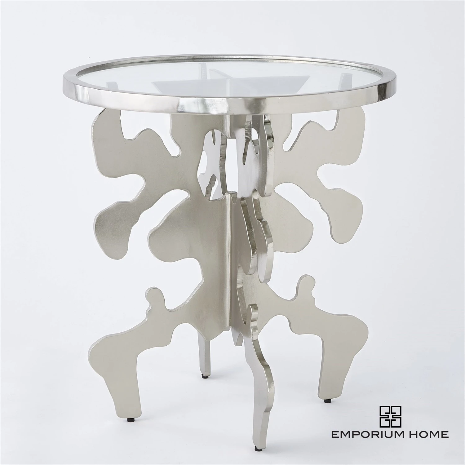 Inspired by the original ink blot artwork we created in our studio, our Ink Blot Table takes an artistic and unexpected approach. The silver leaf finish on the shapely base can be fully appreciated by all angels with a clear glass top. We love this table for its bold lines and one of a kind look.